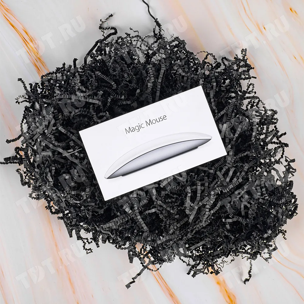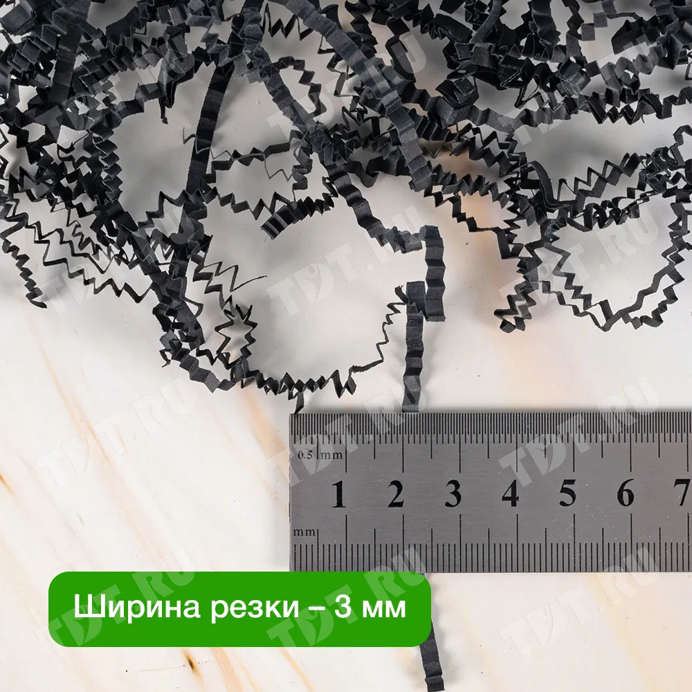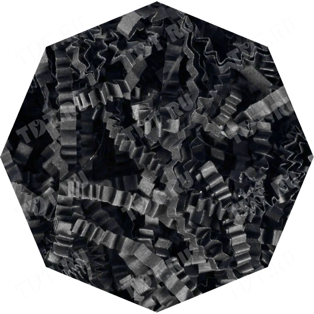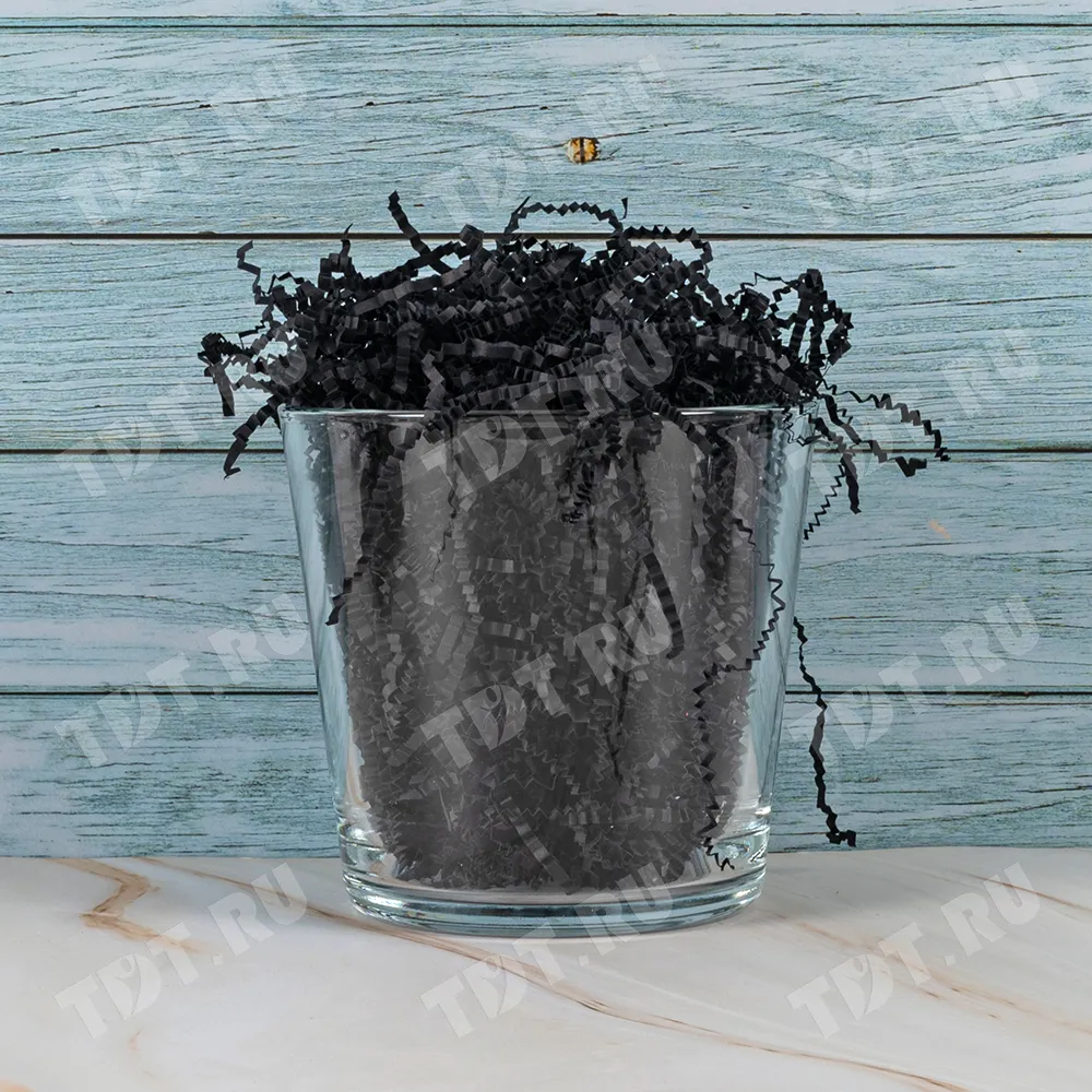 Бумажный подарочный наполнитель «Чёрная материя» из простой бумаги, чёрного цвета, весом 1 кг, плотностью 80 г/м², шириной резки 2-3 мм. Производится в России.