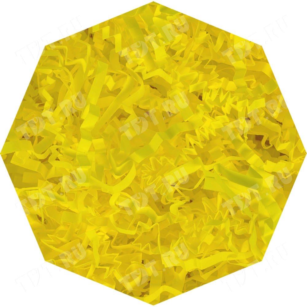 Бумажный подарочный наполнитель «Лазерный лимон» из простой бумаги, яркого лимонного цвета, весом 1 кг, плотностью 80 г/м², шириной резки 2-3 мм. Производится в России.
