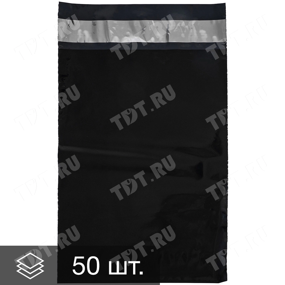 Чёрный курьер-пакет без кармана, без печати, длиной 400+40 мм, шириной 300 мм, толщиной 50 мкм. В упаковке 50 штук.