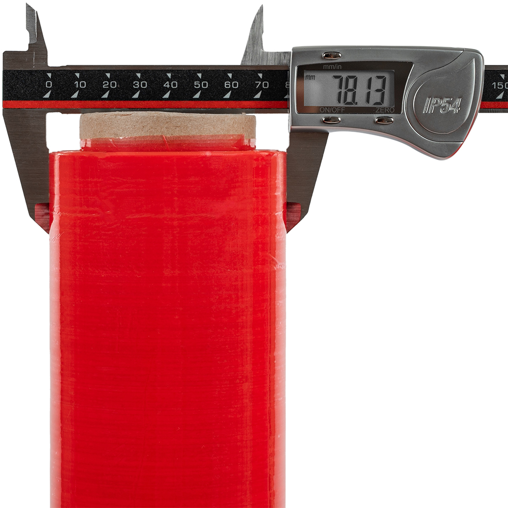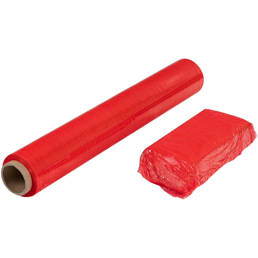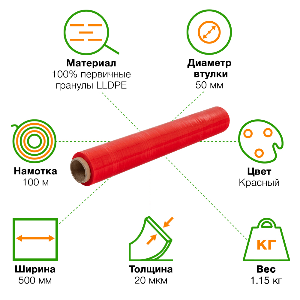 Ручная красная стрейч пленка в рулоне намоткой 100 м, шириной 500 мм, толщиной 20 мкм, вес рулона 1.15 кг, вес втулки 150 г. Изготовлена из первичных гранул LLDPE. Производится в России.