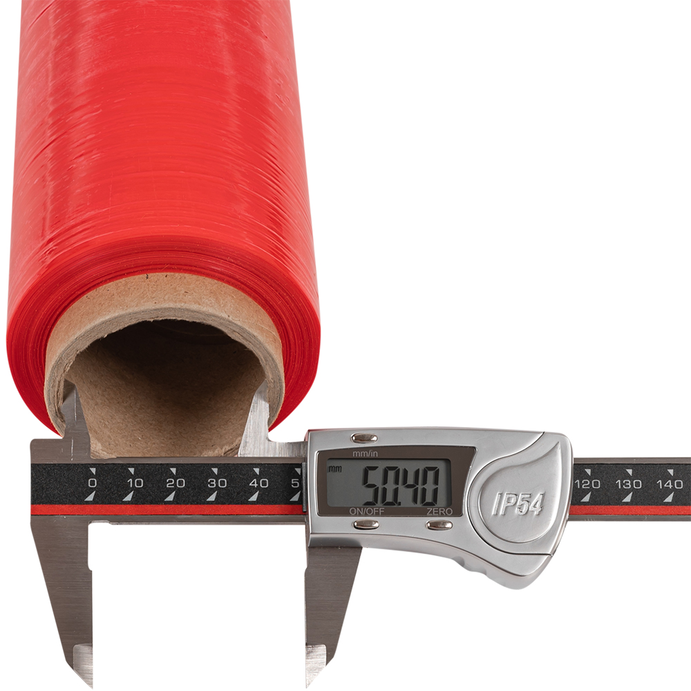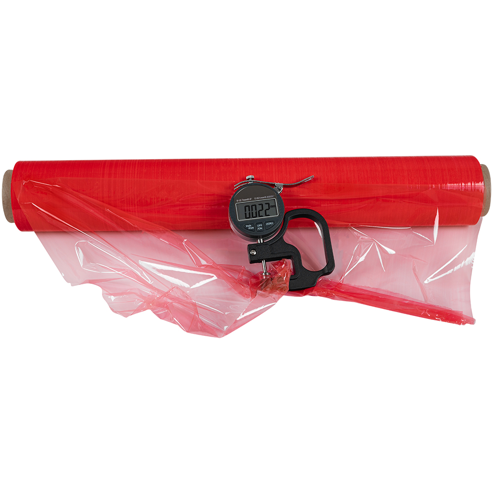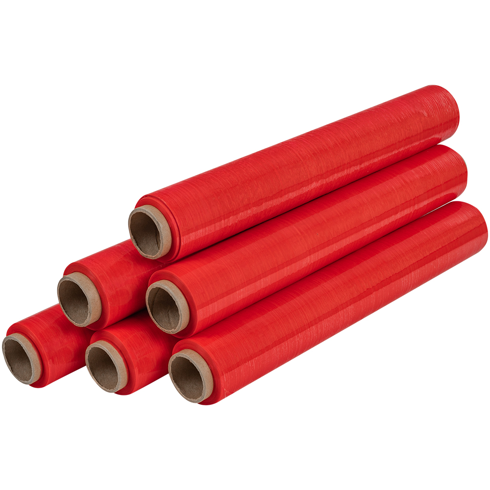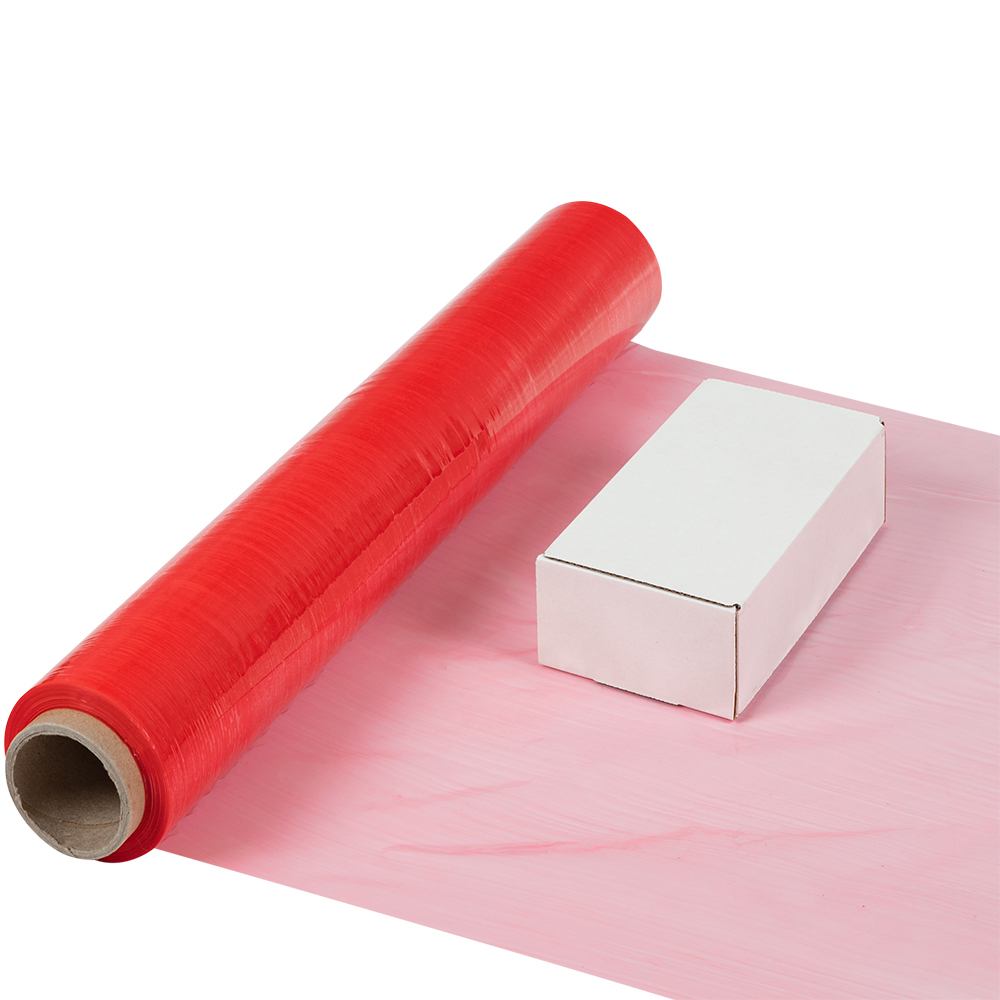 Ручная красная стрейч пленка в рулоне намоткой 100 м, шириной 500 мм, толщиной 20 мкм, вес рулона 1.15 кг, вес втулки 150 г. Изготовлена из первичных гранул LLDPE. Производится в России.