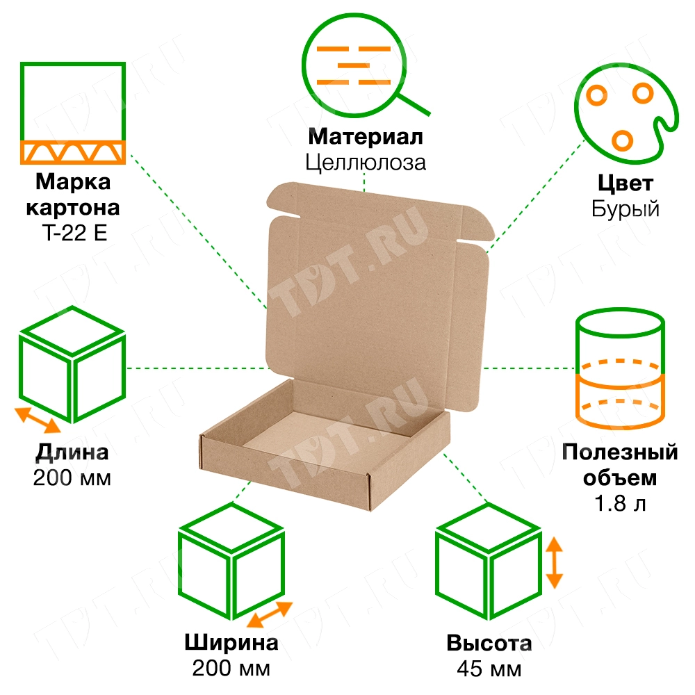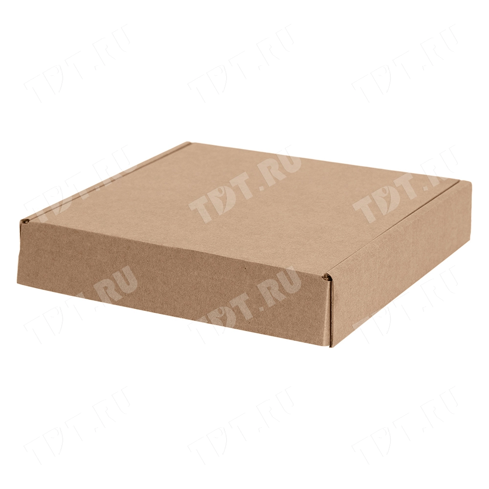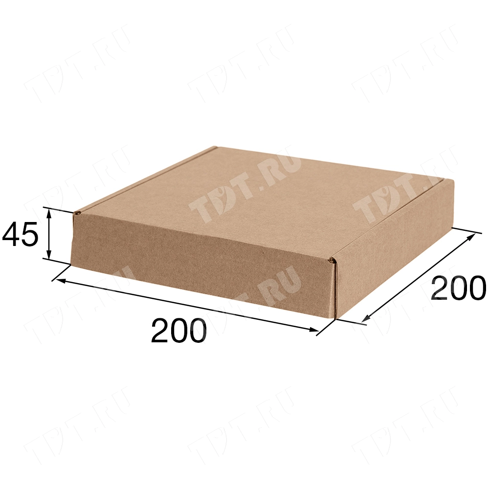 Короб №208 (премиум) бурого цвета, длиной 200 мм, шириной 200 мм и высотой 45 мм. Изготовлен из микрогофрокартона Т-22 Е. Полезный объём — 1.8 л.