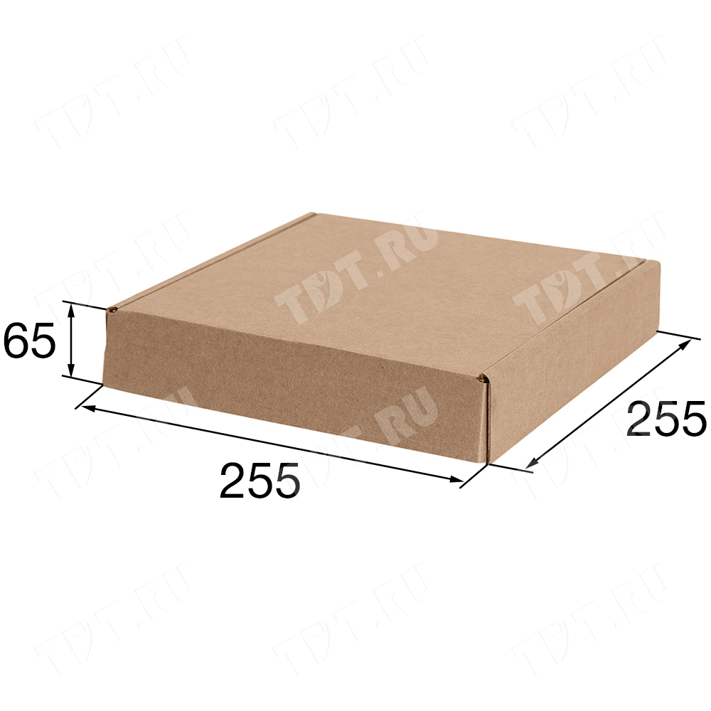 Короб №209 (премиум) бурого цвета, длиной 255 мм, шириной 255 мм и высотой 65 мм. Изготовлен из микрогофрокартона Т-22 Е. Полезный объём — 4.2 л.