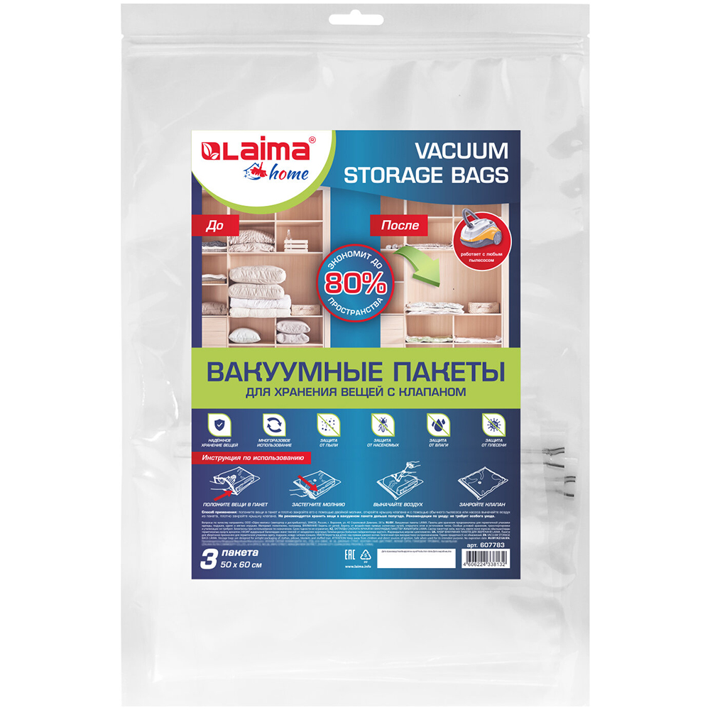 Набор вакуумных пакетов Laima Home для компактного хранения вещей, прозрачного цвета, длиной 60 см, шириной 50 см, толщиной 70 мкм, в упаковке 3 пакета. Изготовлены из полиэтилена и полиамида. Клапан последнего поколения для удаления воздуха пылесосом — экономия места в шкафу до 80%. Производятся в Китае.