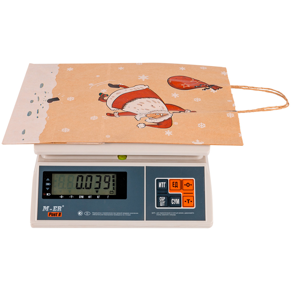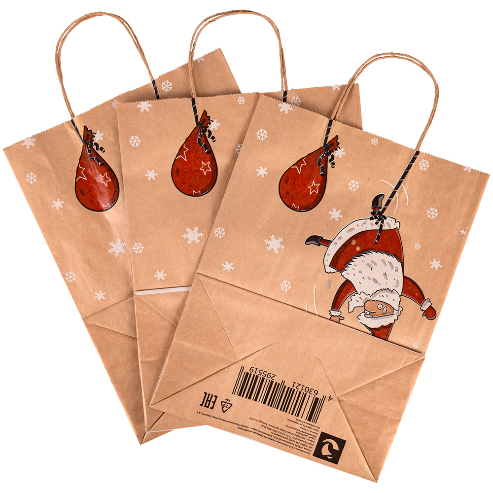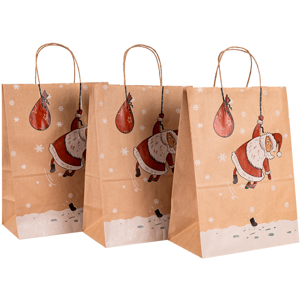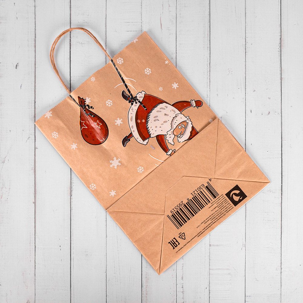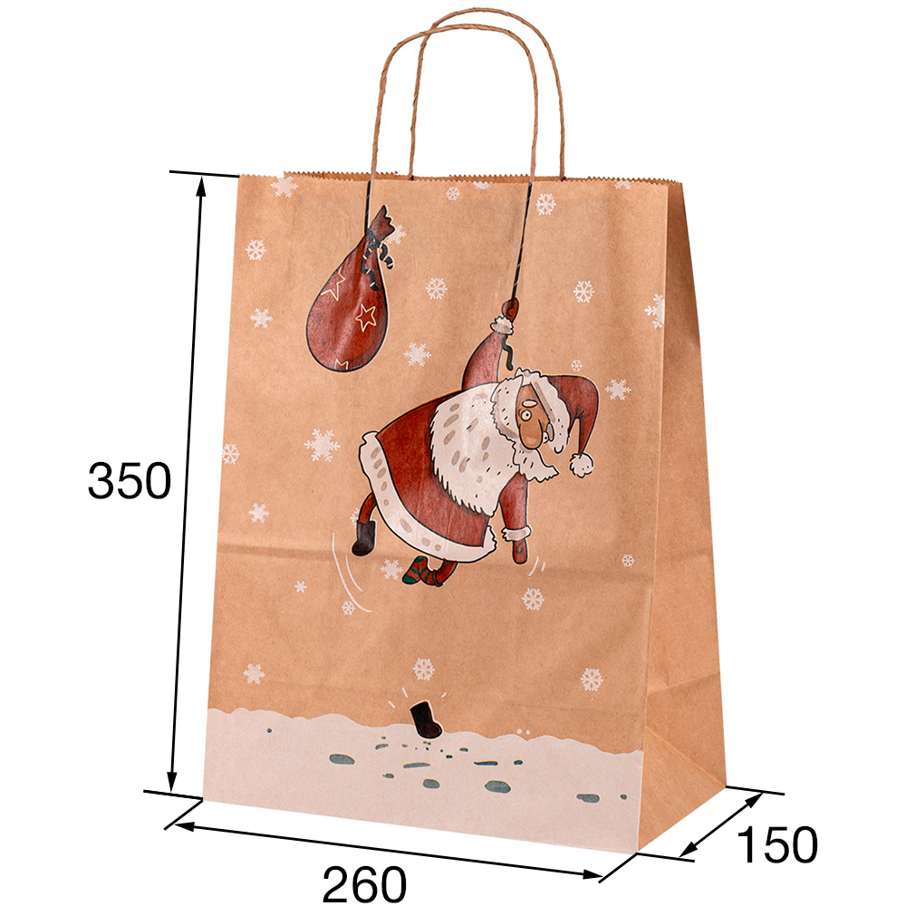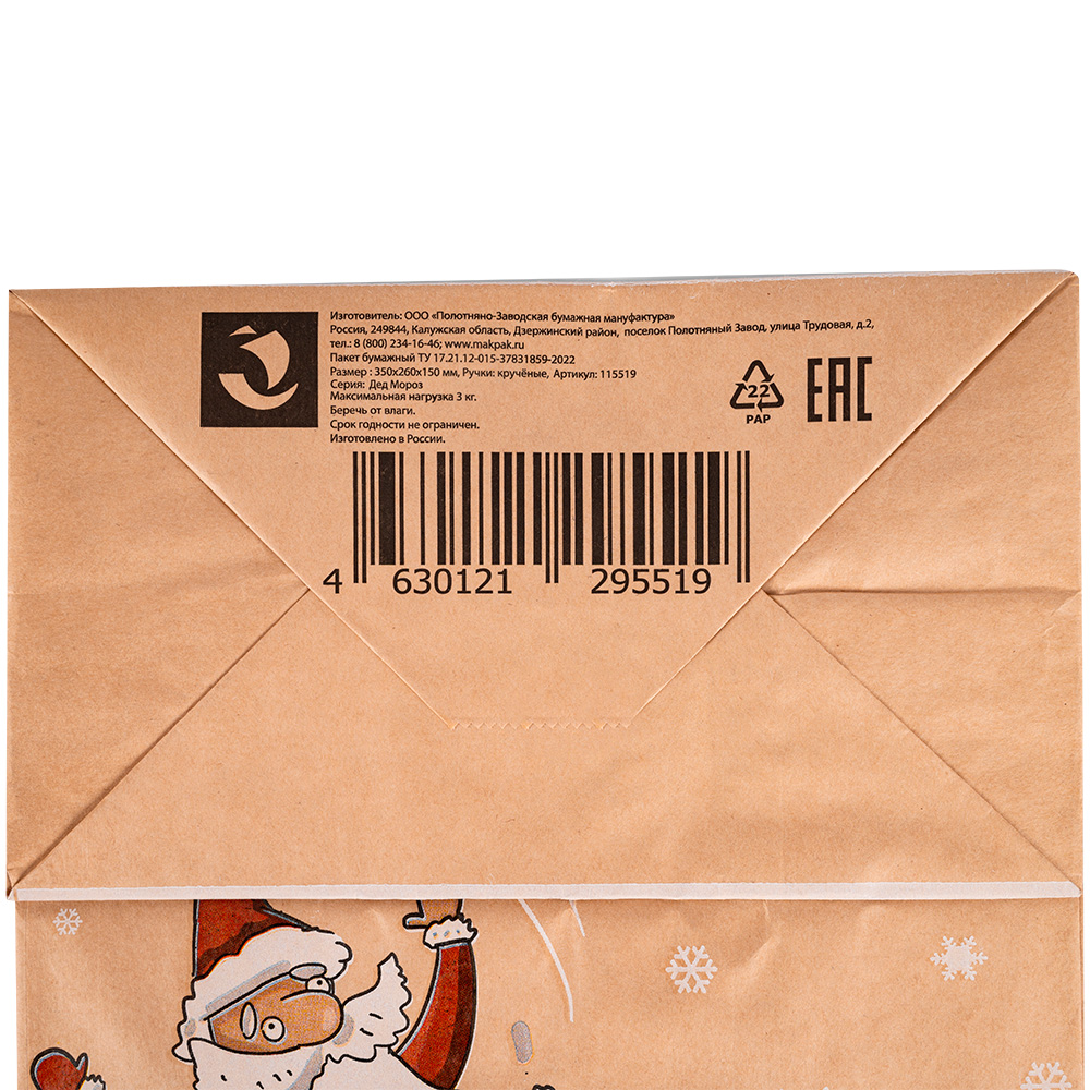 Бумажный крафт пакет с крученой ручкой и новогодним рисунком «Дед Мороз» шириной 150 мм, длиной 260 мм, высотой 350 мм изготовлен из крафт бумаги плотностью 80 г/м². Пакеты производятся в России.