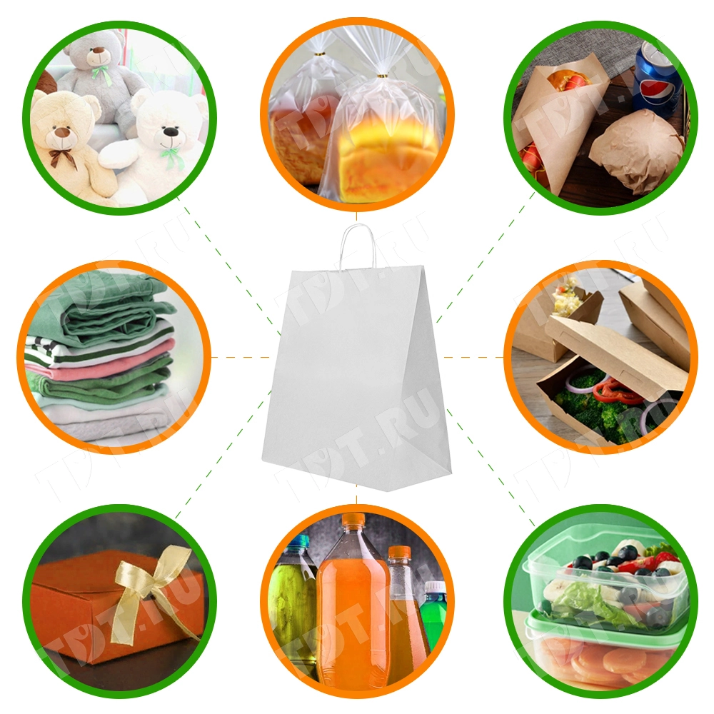 Пакеты с кручёной ручкой используются для упаковки, переноски, хранения продуктов питания и бытовых товаров. Они незаменимы в магазинах, пекарнях, кафе, ресторанах и на фудкортах.