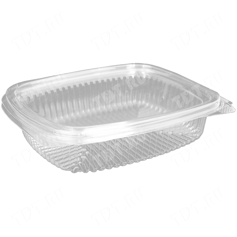 Прозрачные пищевые контейнеры с откидными крышками, объемом 350 мл, длиной 155 мм, шириной 129 мм, высотой 34 мм, в упаковке по 82 штуки. Материал – БОПС. Производятся в России.