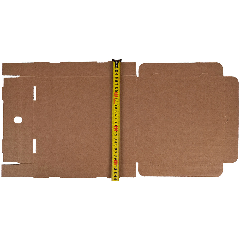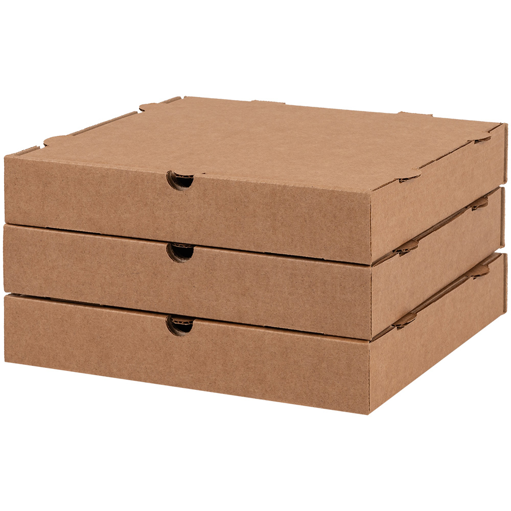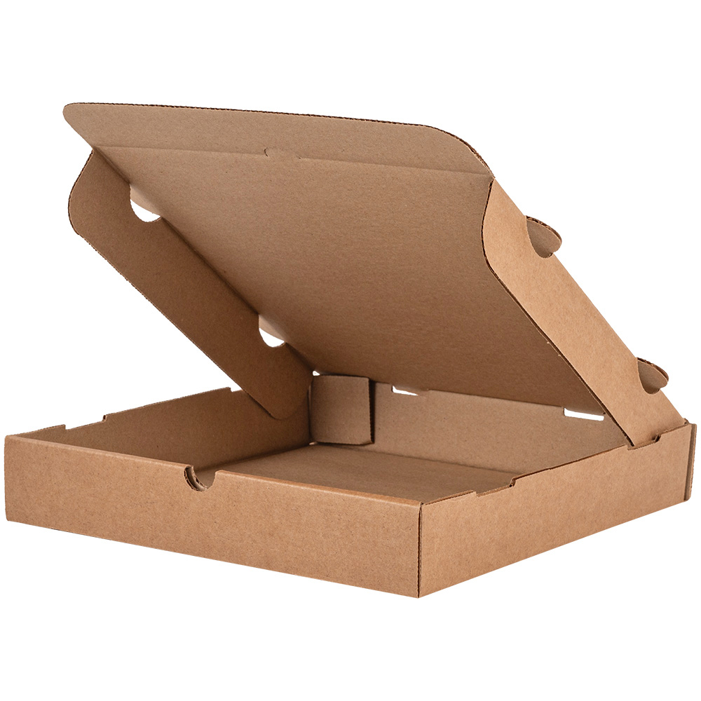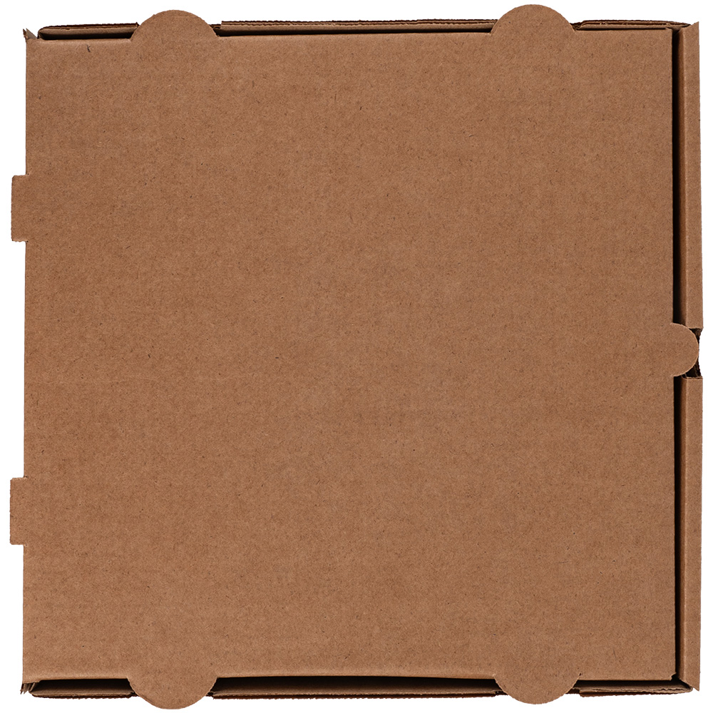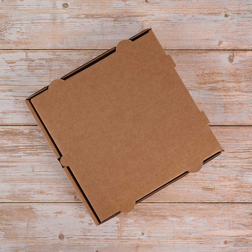 Бурая коробка для пиццы, длиной 250 мм, шириной 250 мм и высотой 40 мм. Изготовлена из трехслойного картона марки Т-23. Полезный объём — 2.5 л. Производится в России.