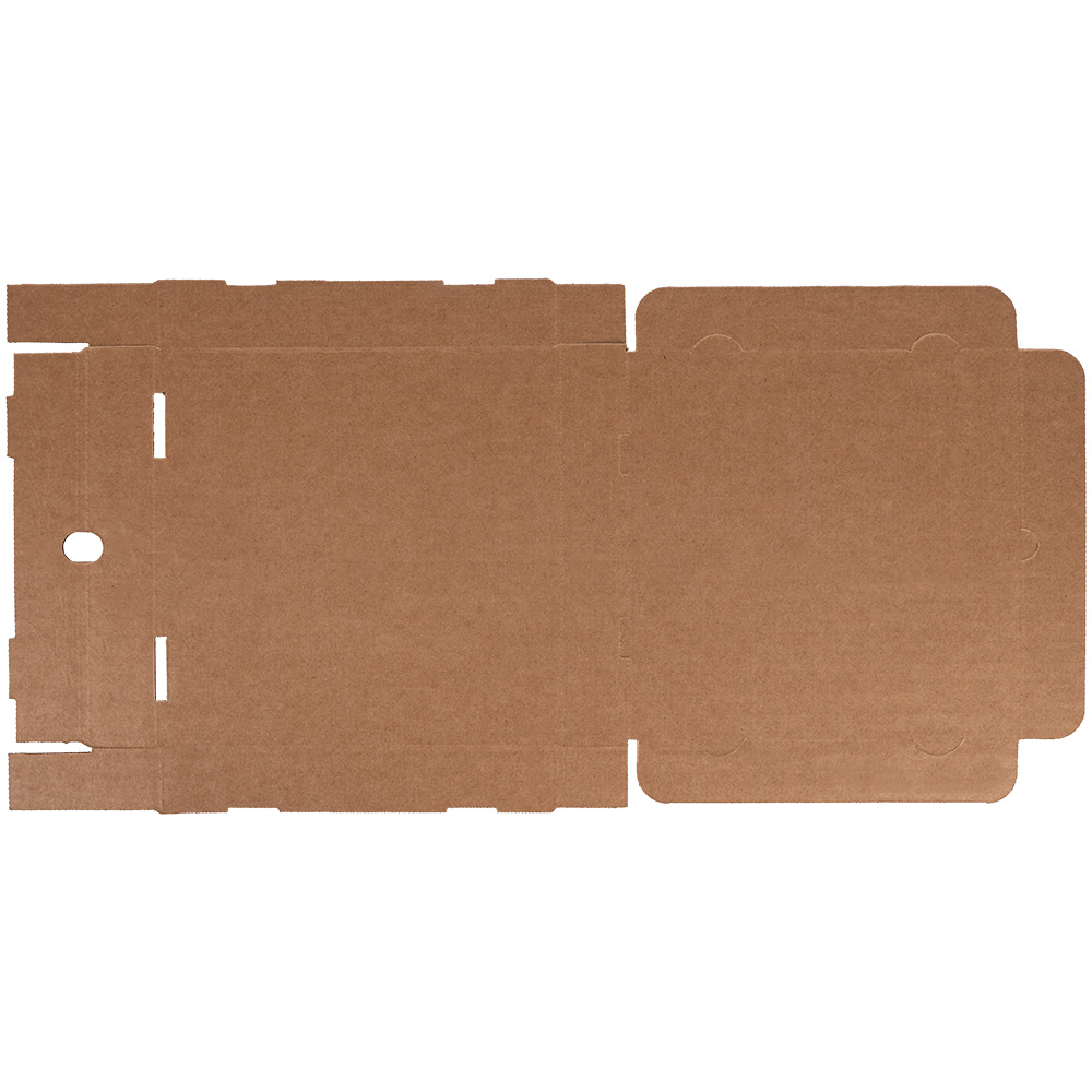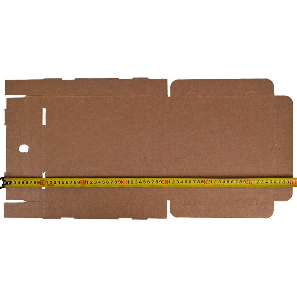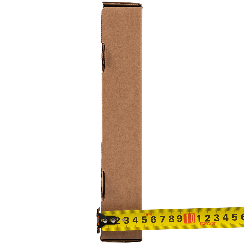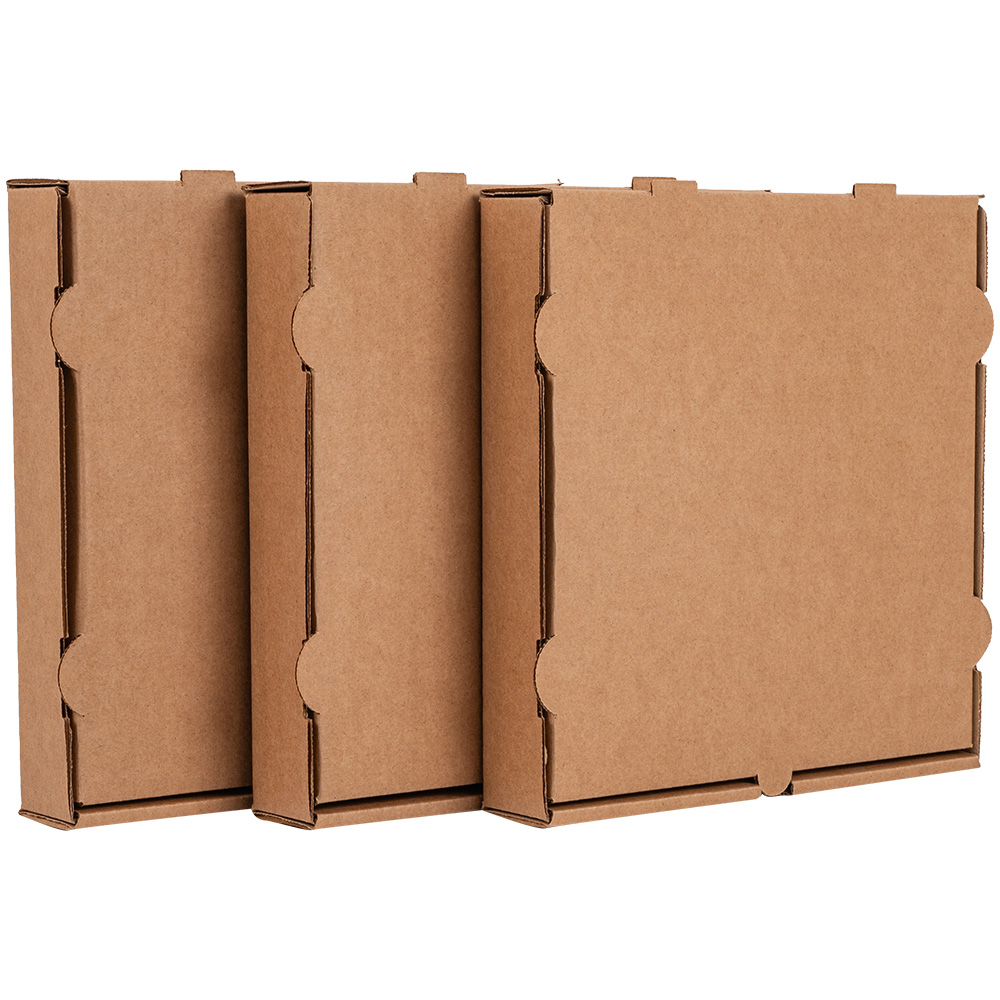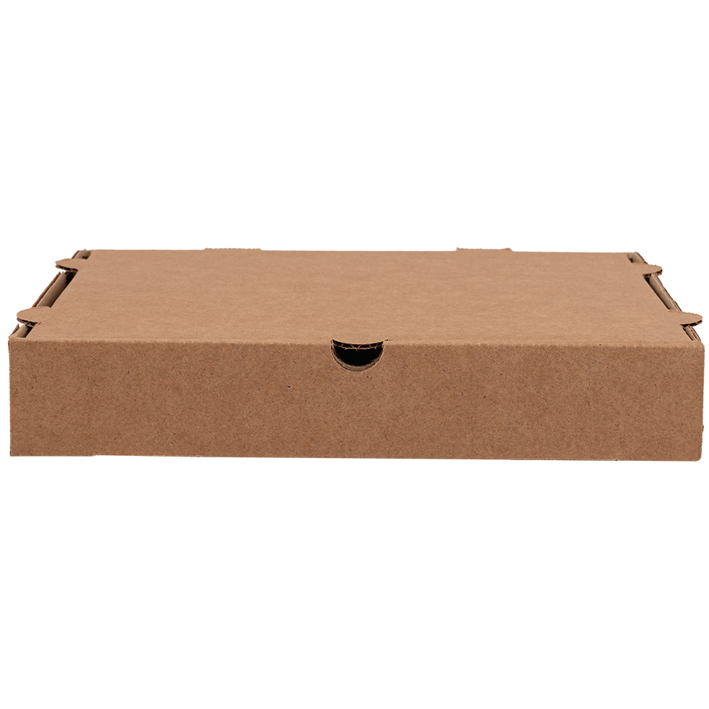 Бурая коробка для пиццы, длиной 250 мм, шириной 250 мм и высотой 40 мм. Изготовлена из трехслойного картона марки Т-23. Полезный объём — 2.5 л. Производится в России.