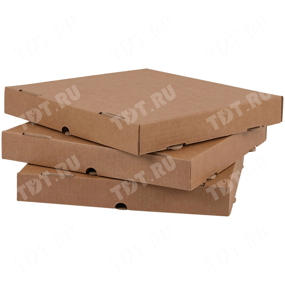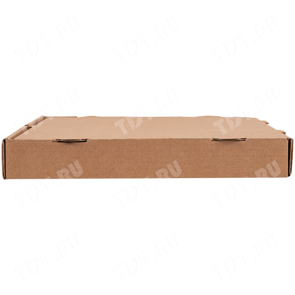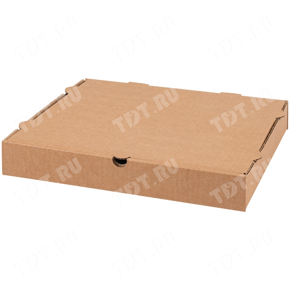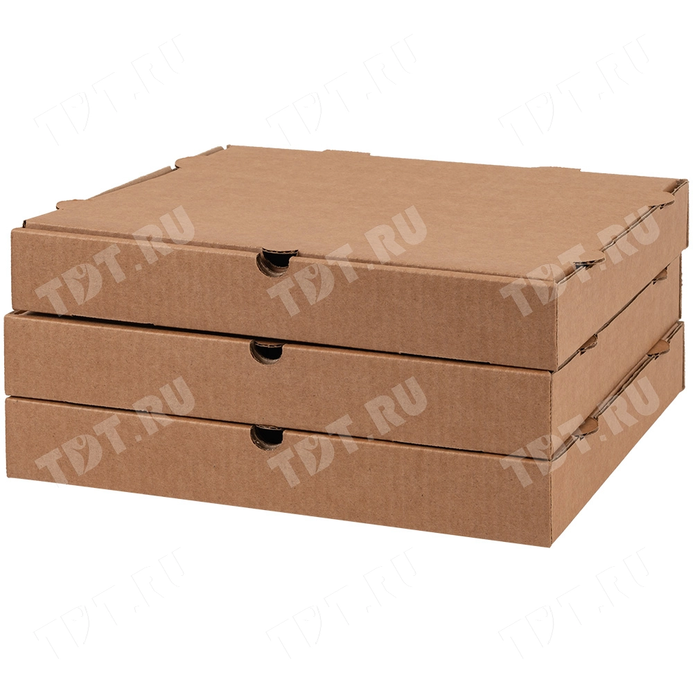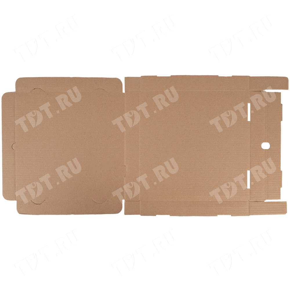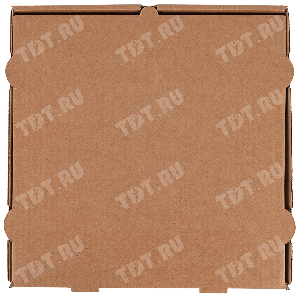 Бурая коробка для пиццы, длиной 310 мм, шириной 310 мм и высотой 33 мм. Изготовлена из трехслойного картона марки Т-23. Полезный объём — 3.17 л. Производится в России.