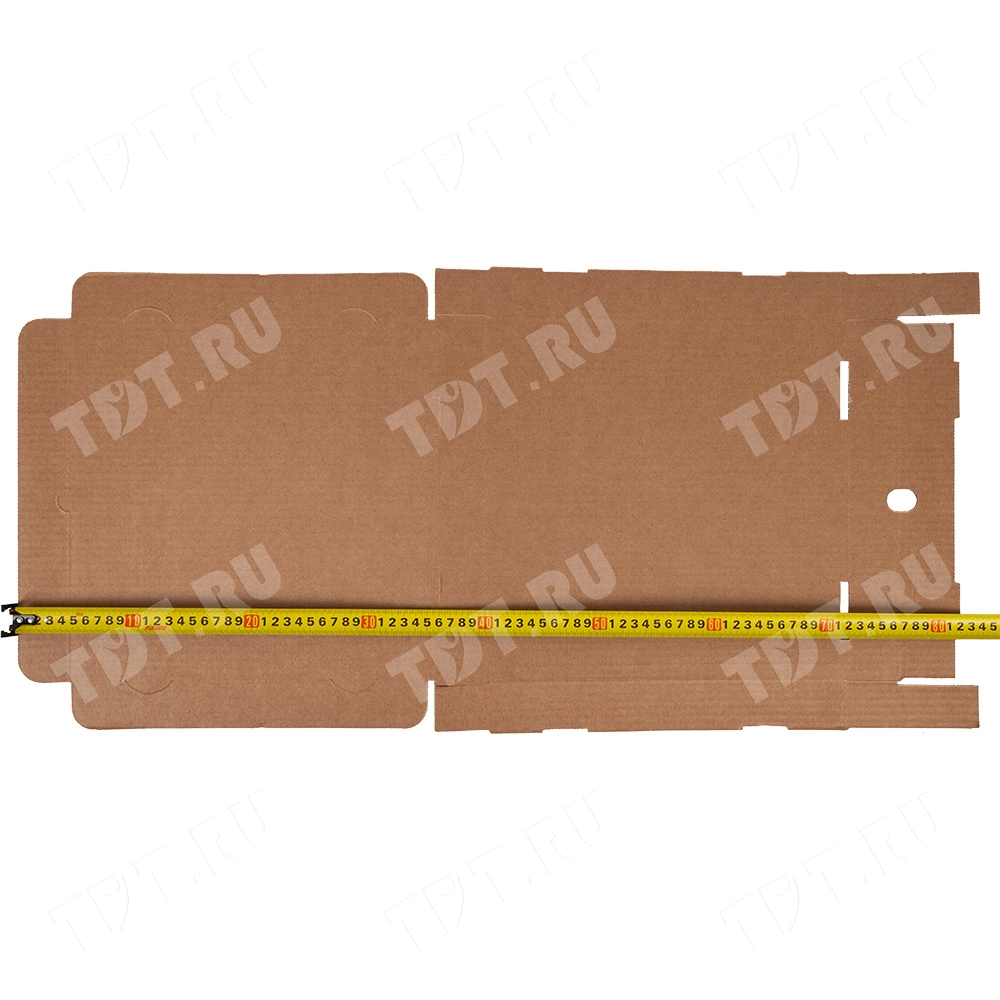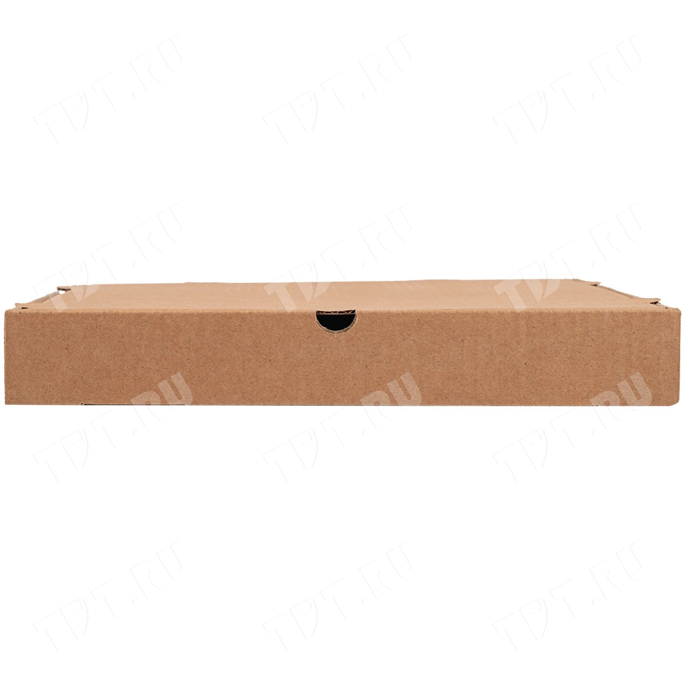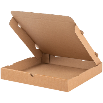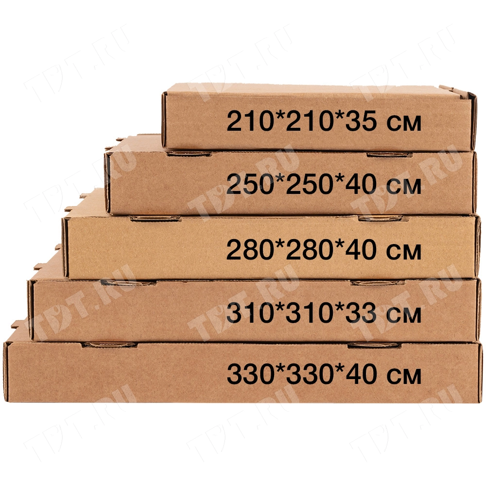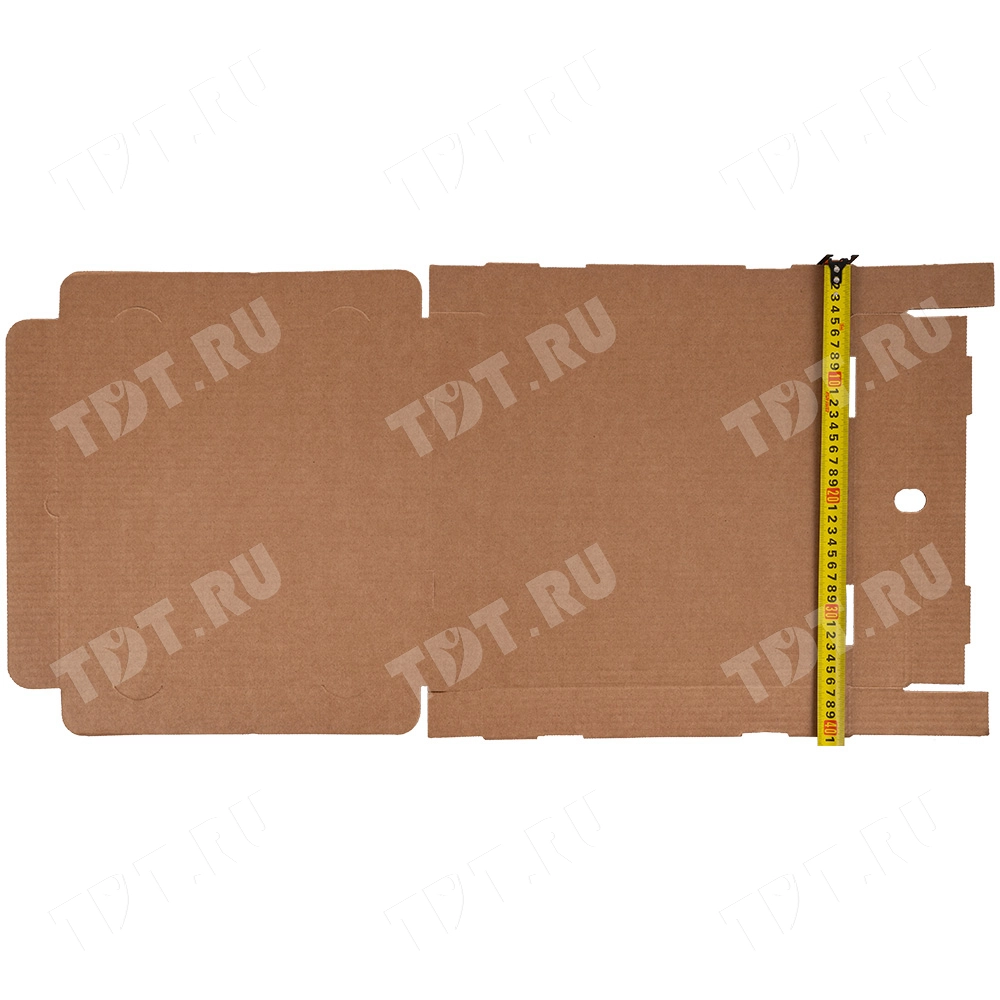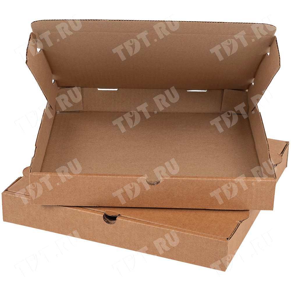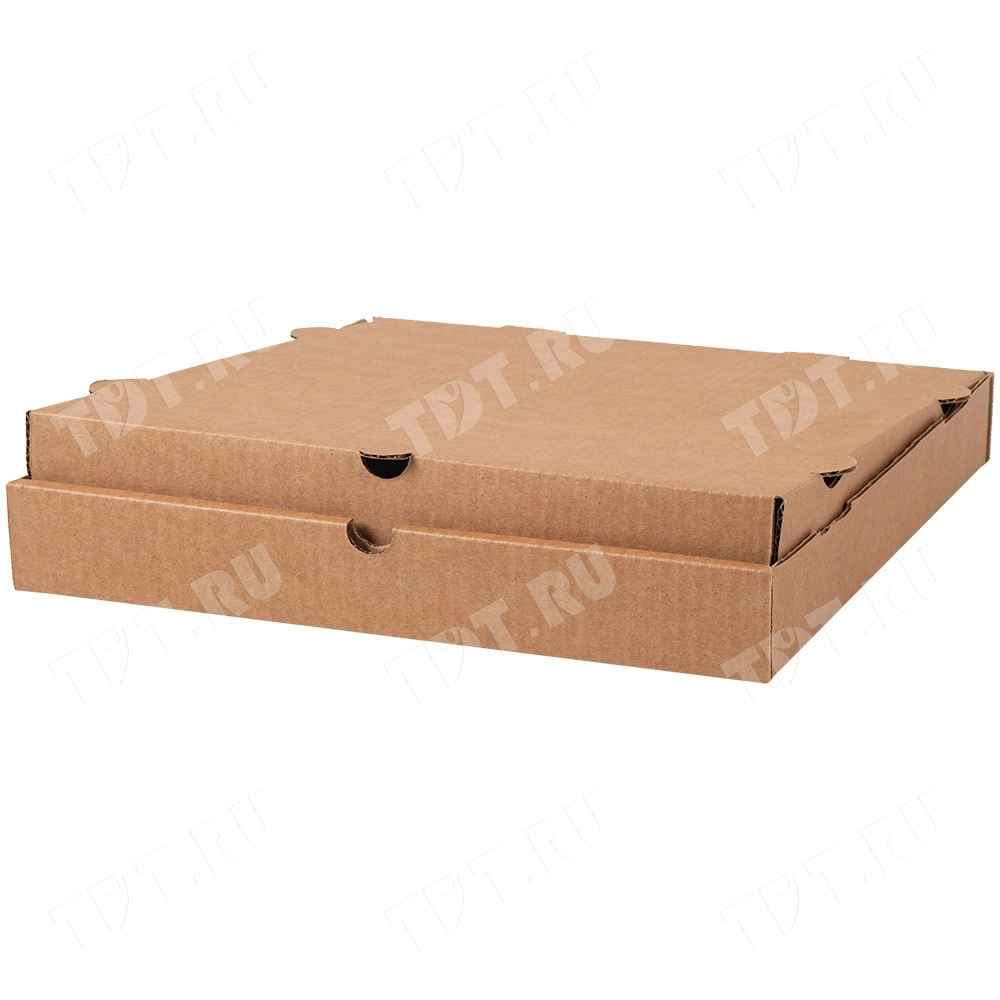 Бурая коробка для пиццы, длиной 310 мм, шириной 310 мм и высотой 33 мм. Изготовлена из трехслойного картона марки Т-23. Полезный объём — 3.17 л. Производится в России.