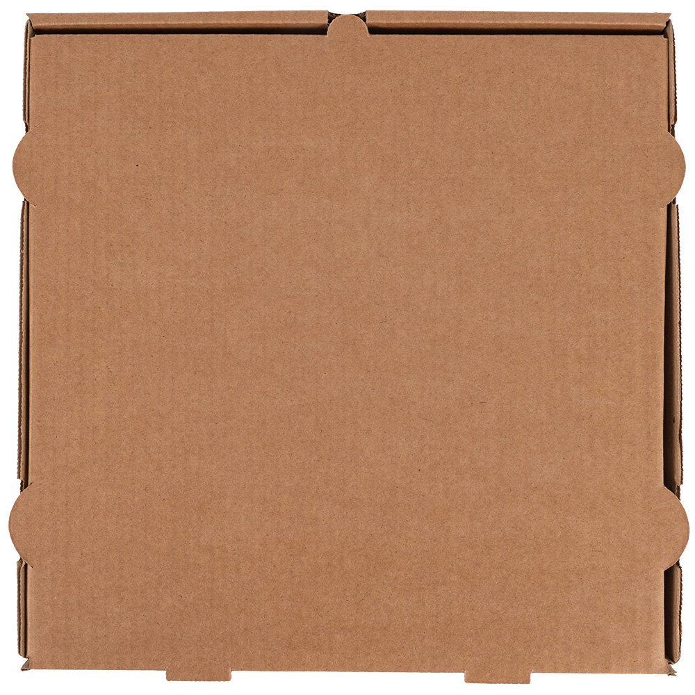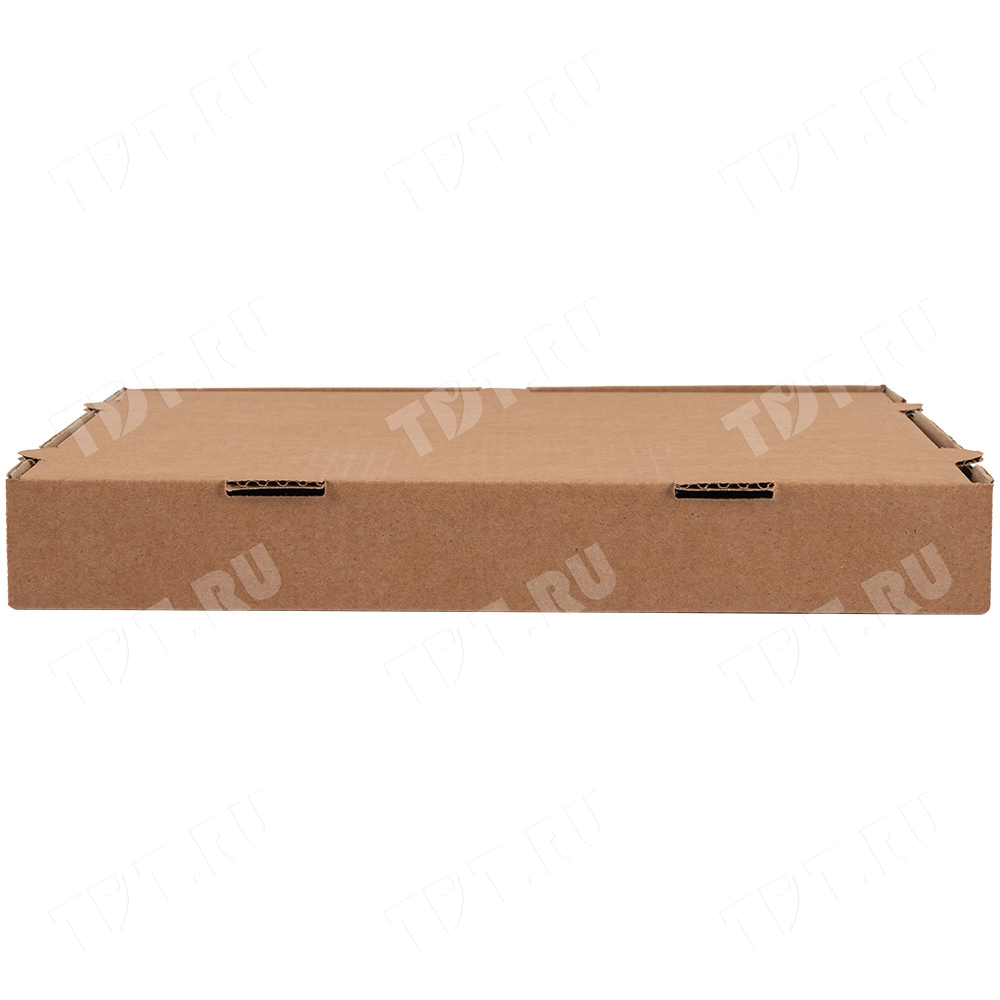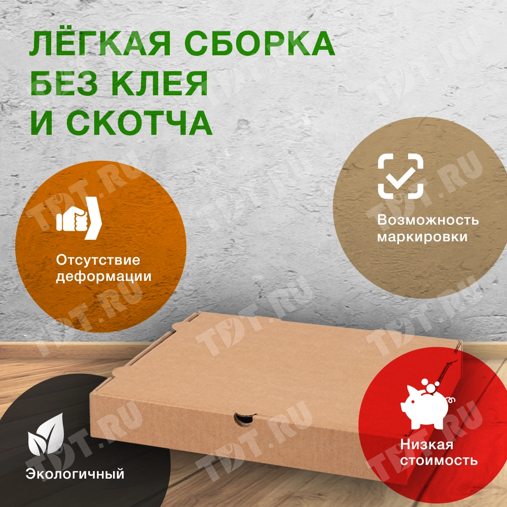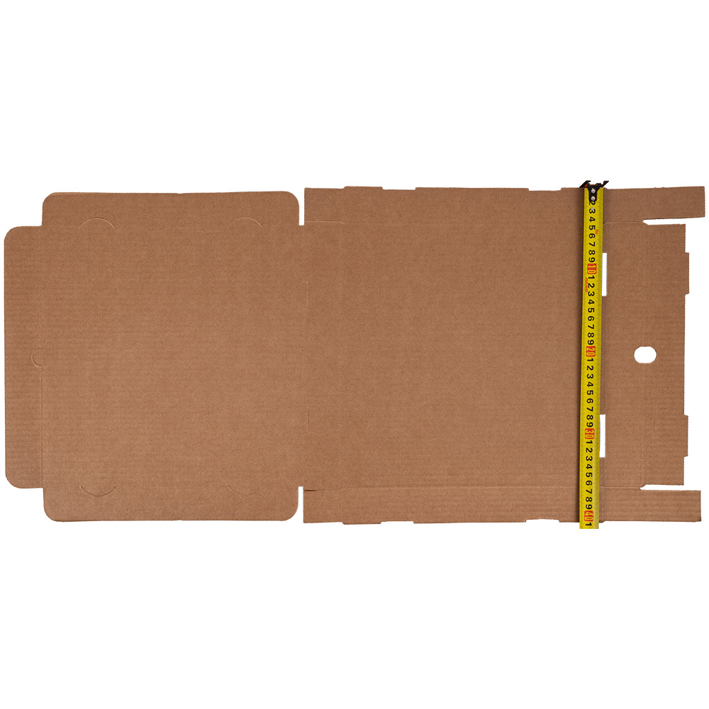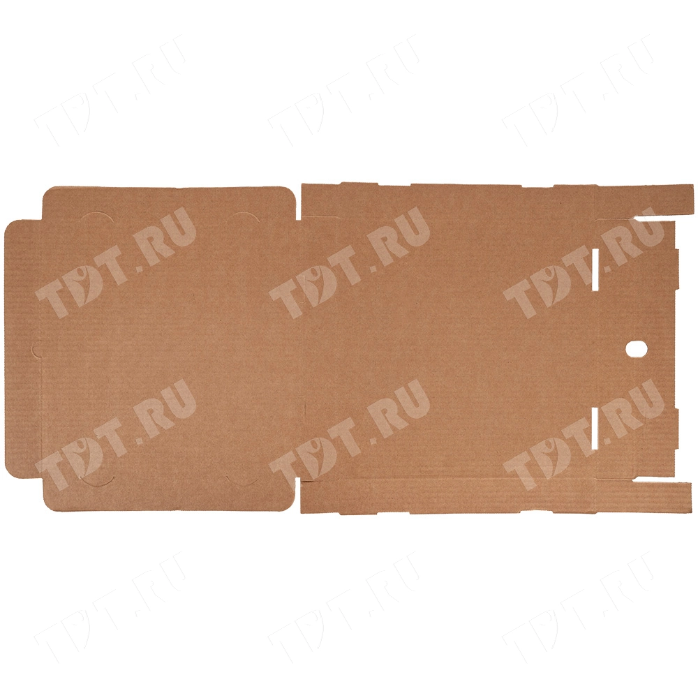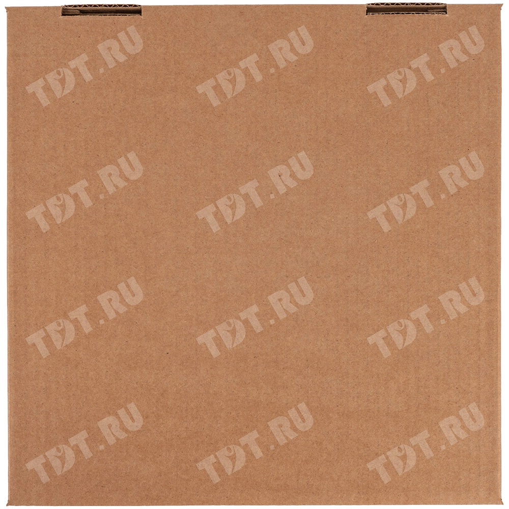 Бурая коробка для пиццы, длиной 310 мм, шириной 310 мм и высотой 33 мм. Изготовлена из трехслойного картона марки Т-23. Полезный объём — 3.17 л. Производится в России.