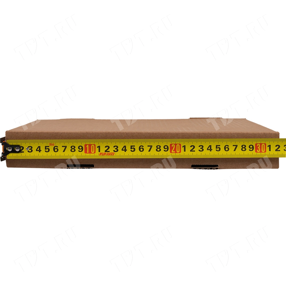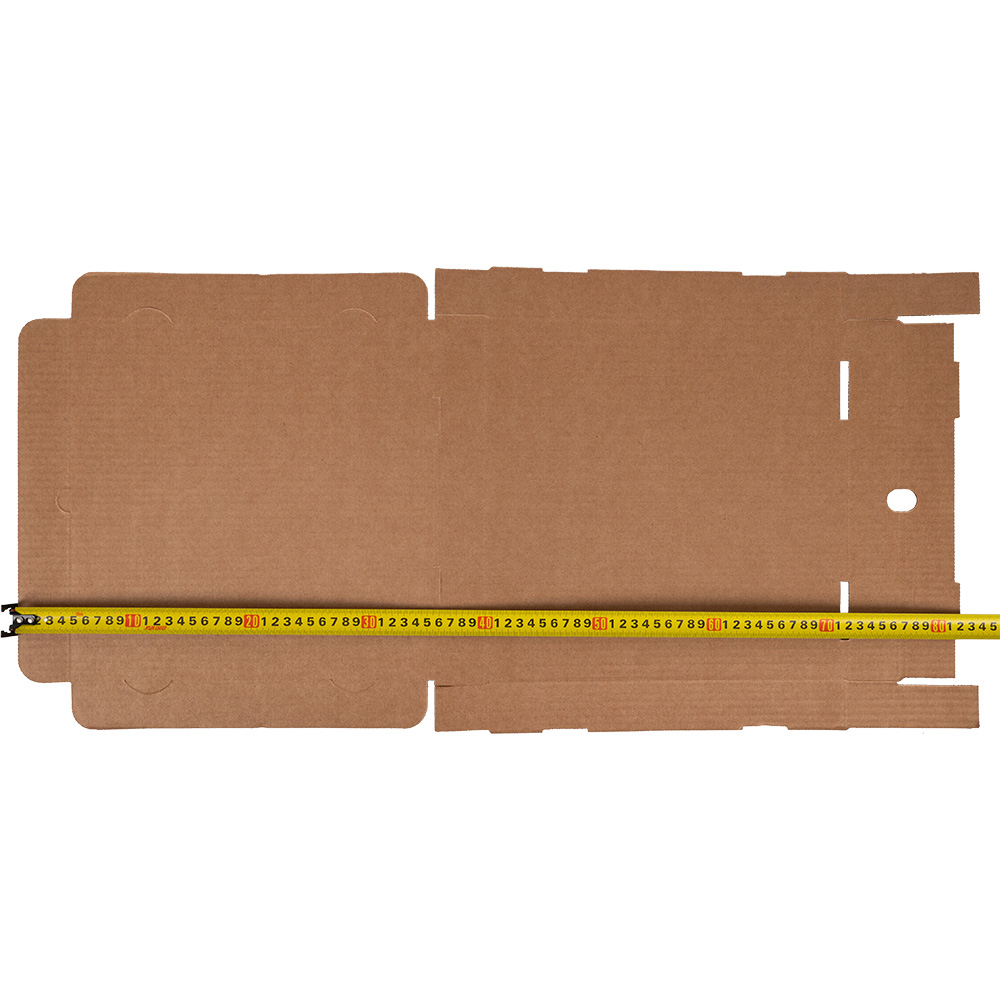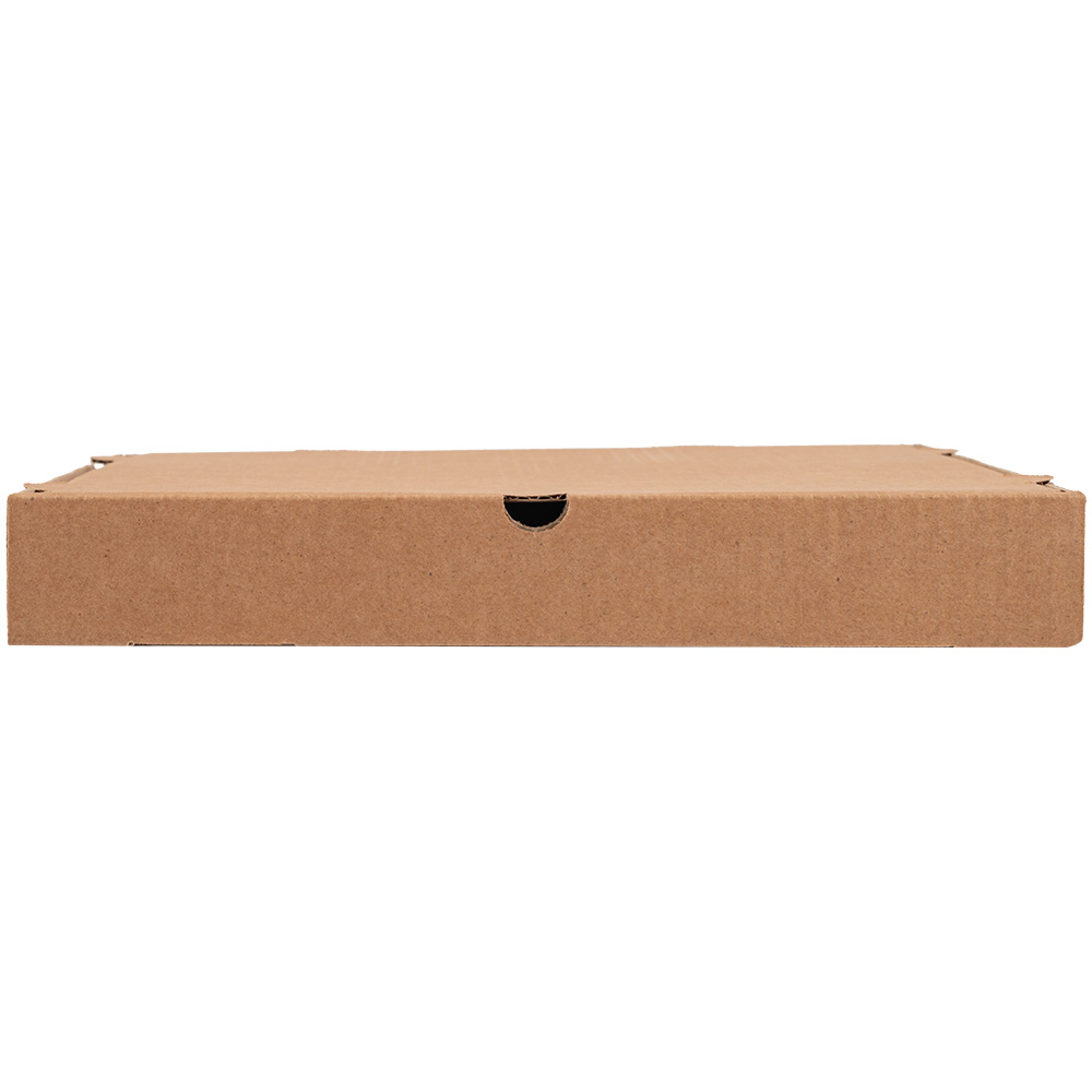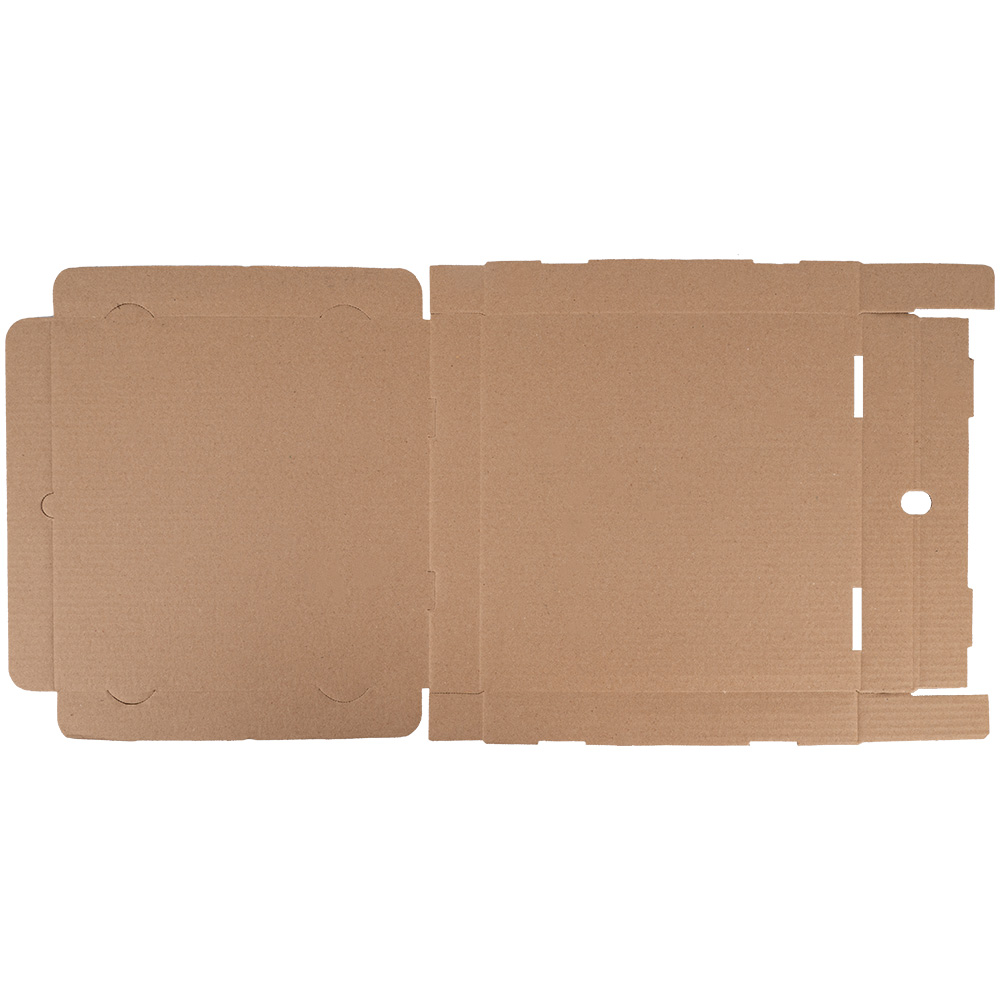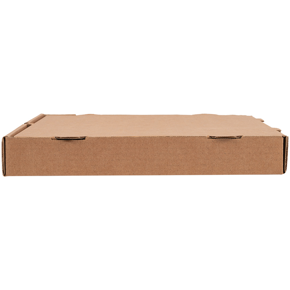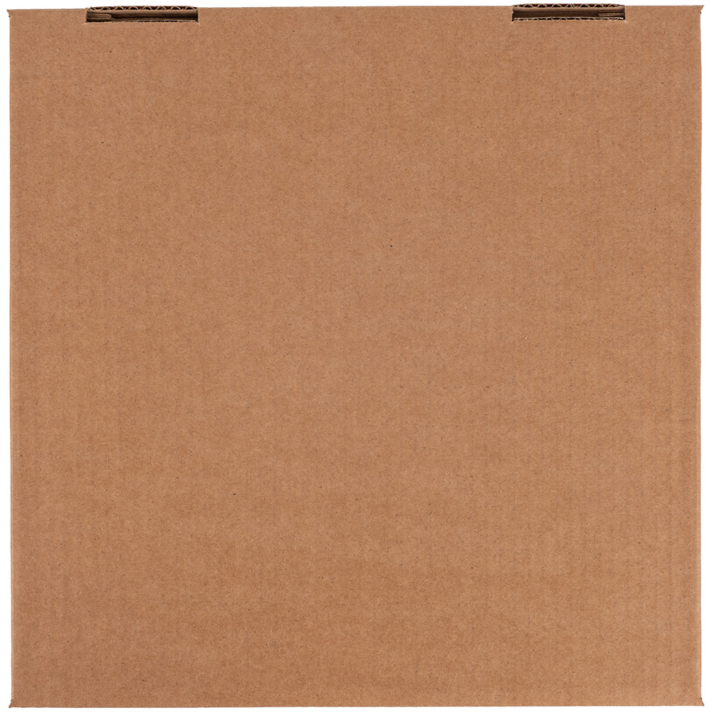 Бурая коробка для пиццы, длиной 310 мм, шириной 310 мм и высотой 33 мм. Изготовлена из трехслойного картона марки Т-23. Полезный объём — 3.17 л. Производится в России.