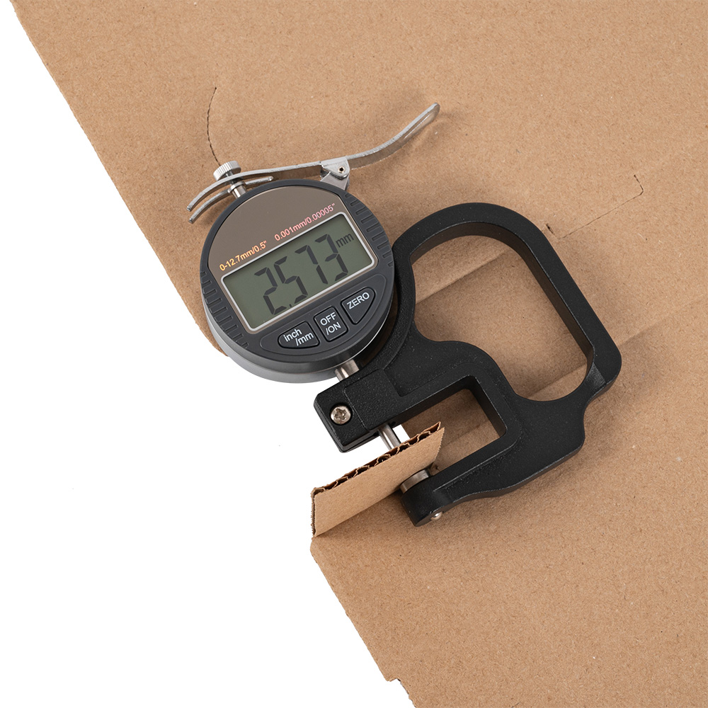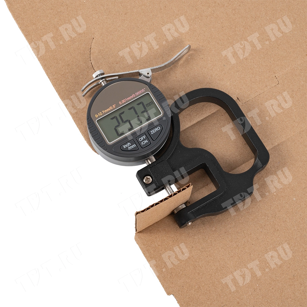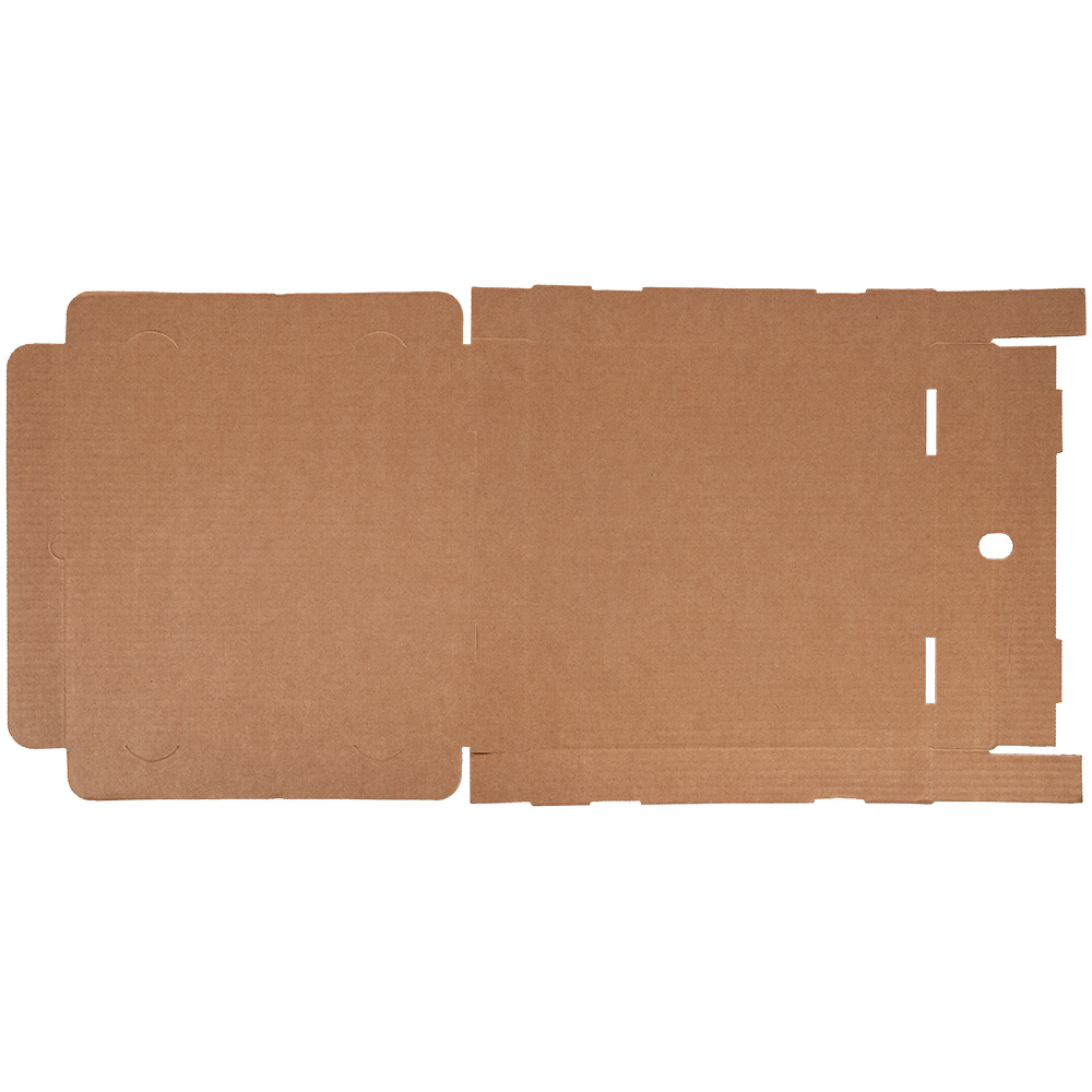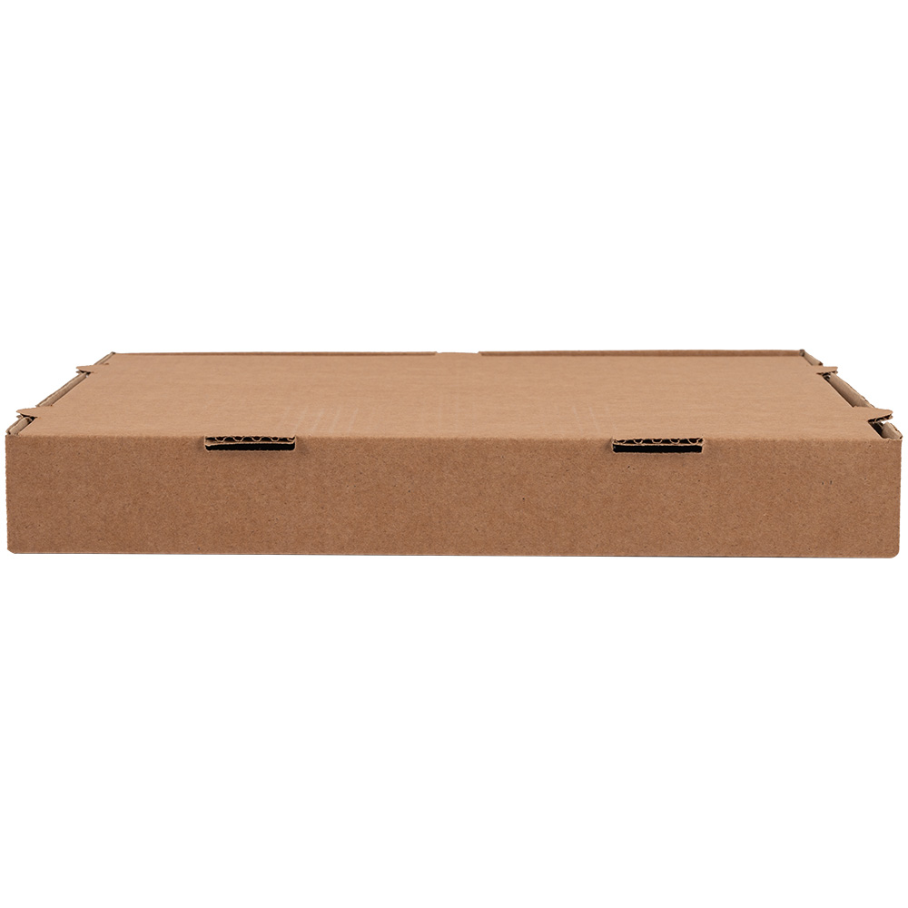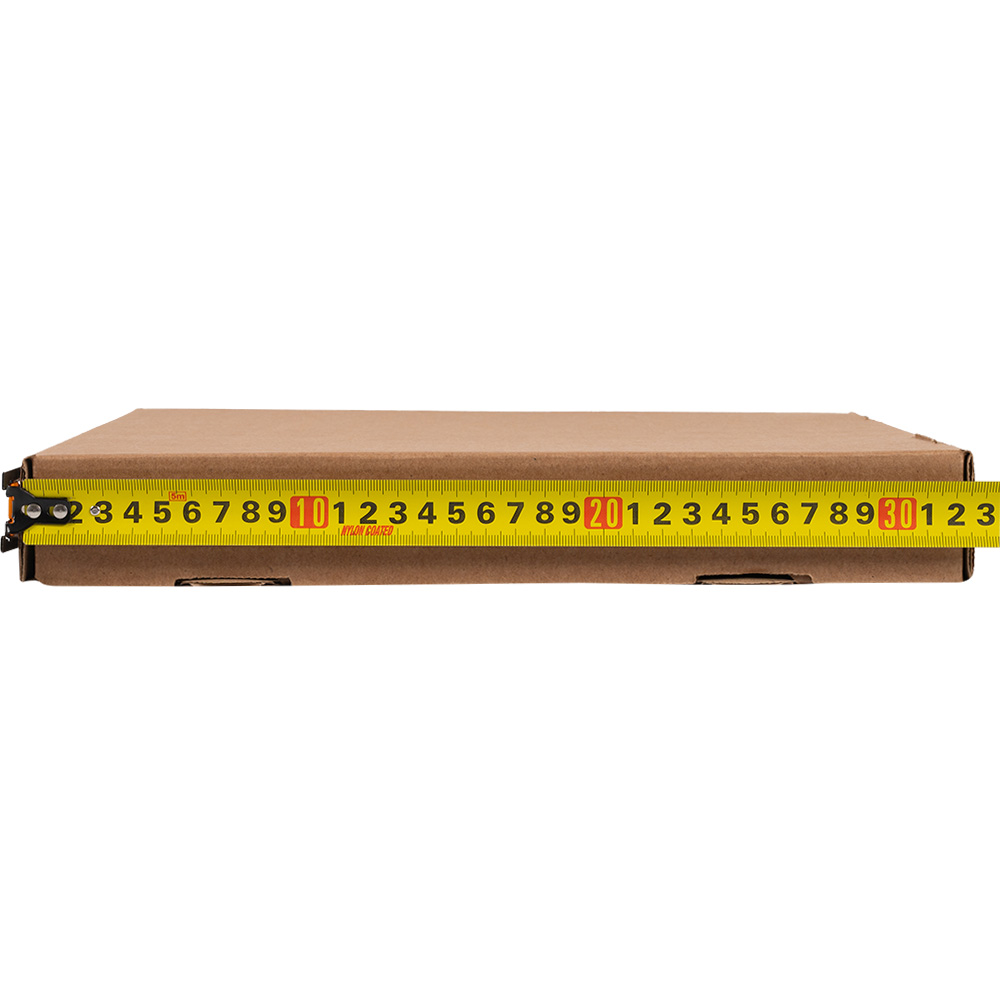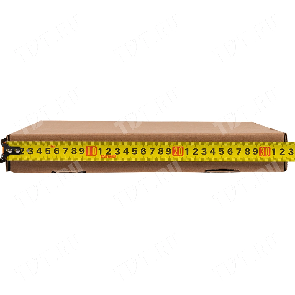 Бурая коробка для пиццы, длиной 310 мм, шириной 310 мм и высотой 33 мм. Изготовлена из трехслойного картона марки Т-23. Полезный объём — 3.17 л. Производится в России.