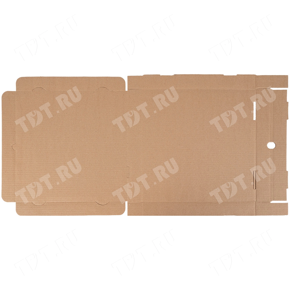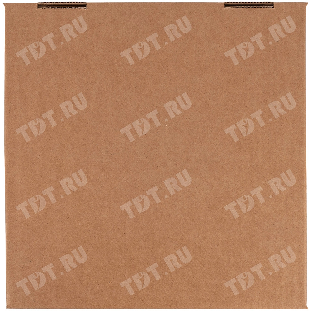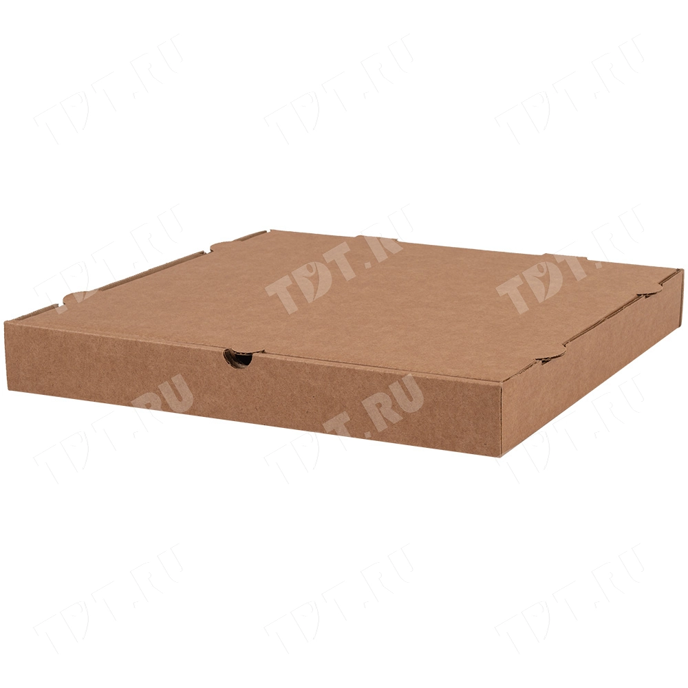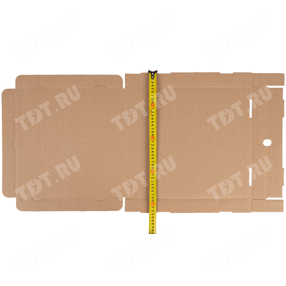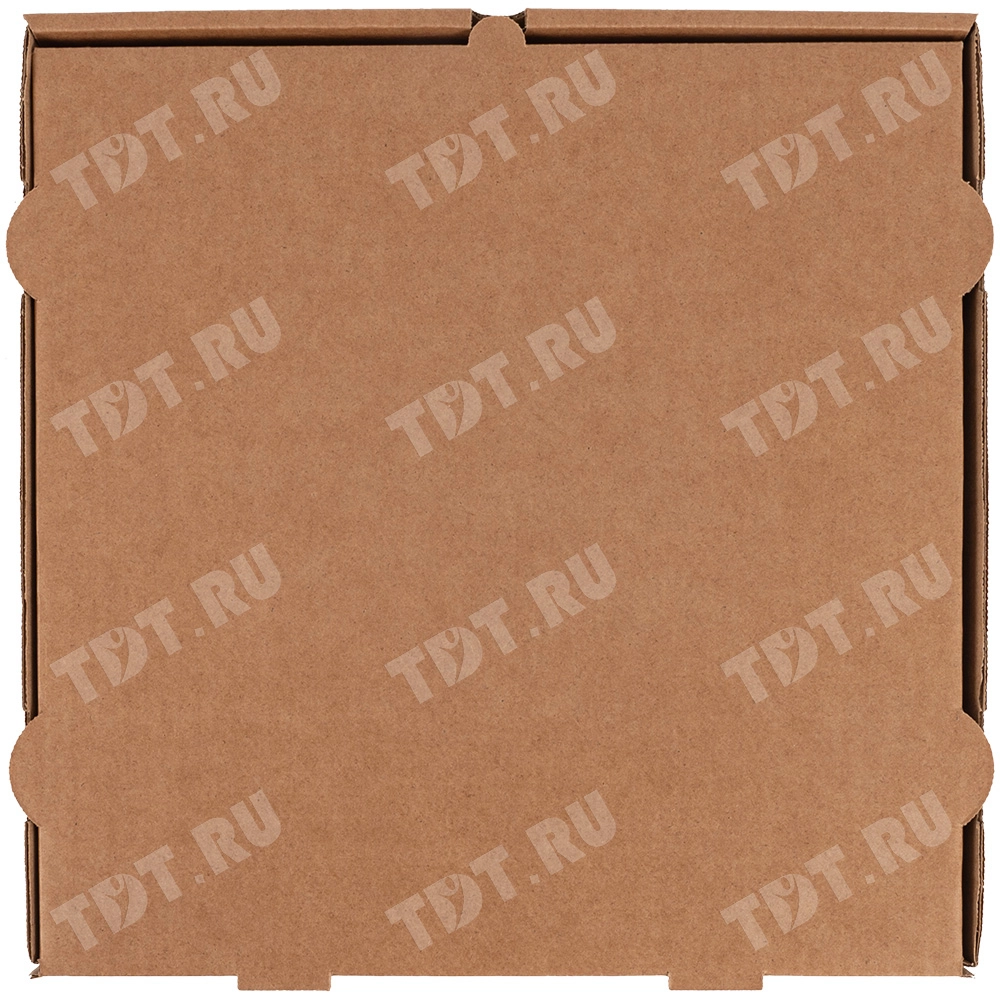 Бурая коробка для пиццы, длиной 330 мм, шириной 330 мм и высотой 40 мм. Изготовлена из трехслойного картона марки Т-23. Полезный объём — 4.36 л. Производится в России.