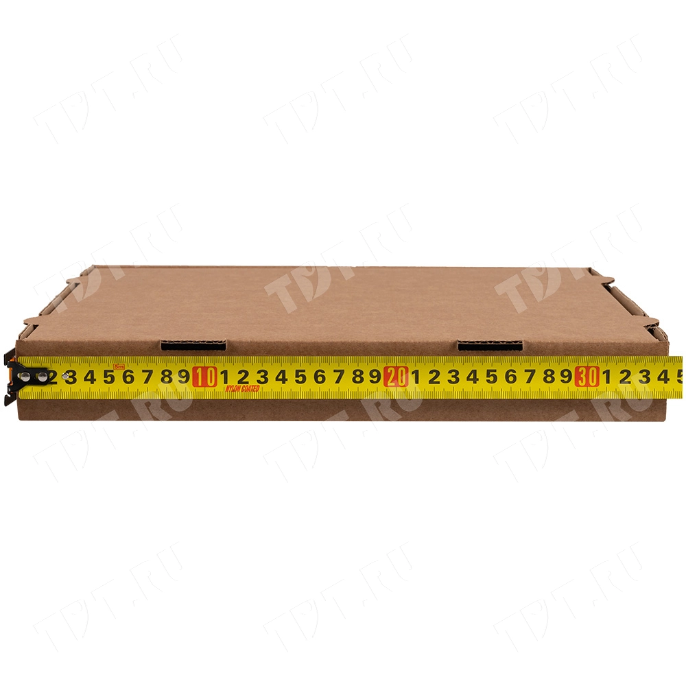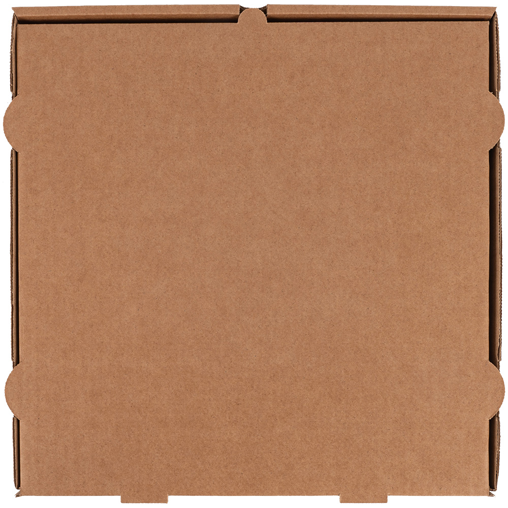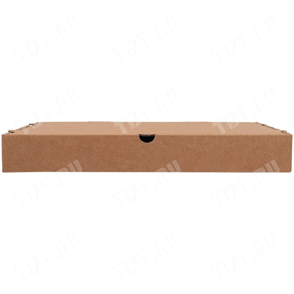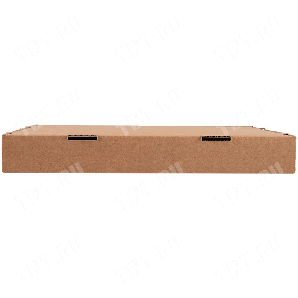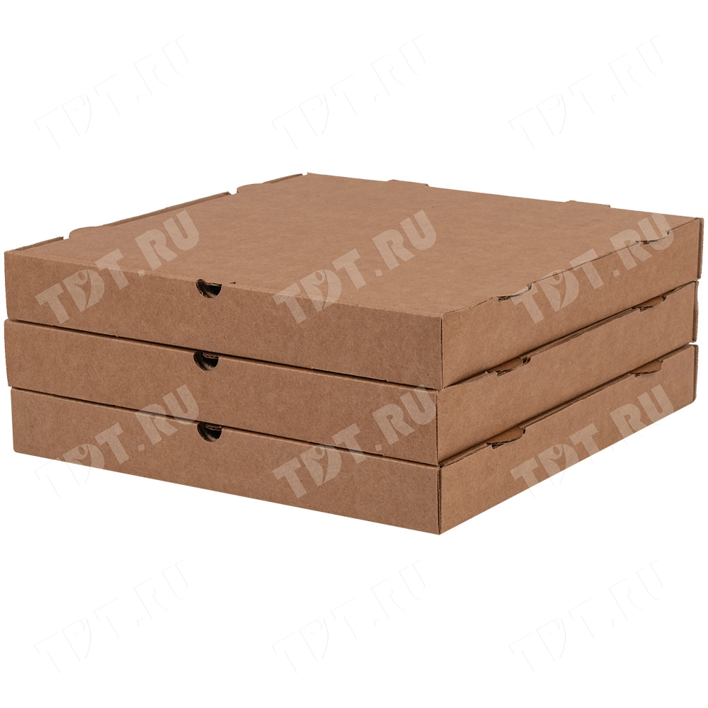 Бурая коробка для пиццы, длиной 330 мм, шириной 330 мм и высотой 40 мм. Изготовлена из трехслойного картона марки Т-23. Полезный объём — 4.36 л. Производится в России.