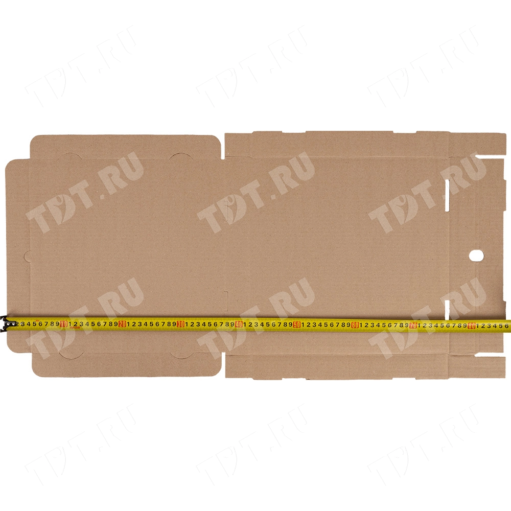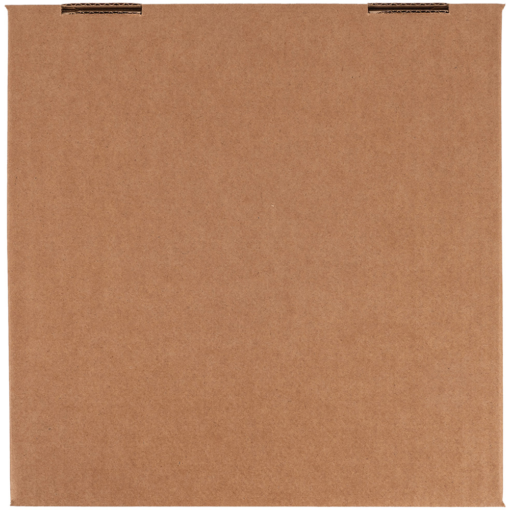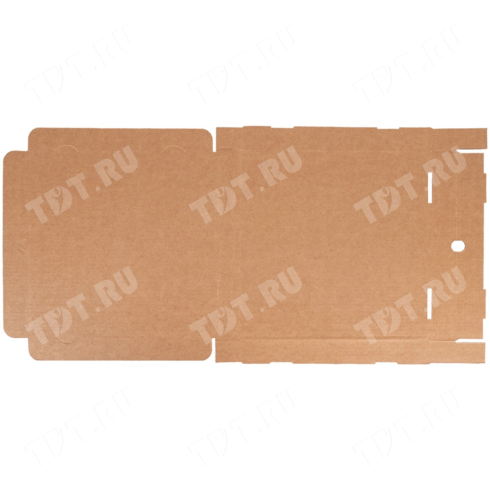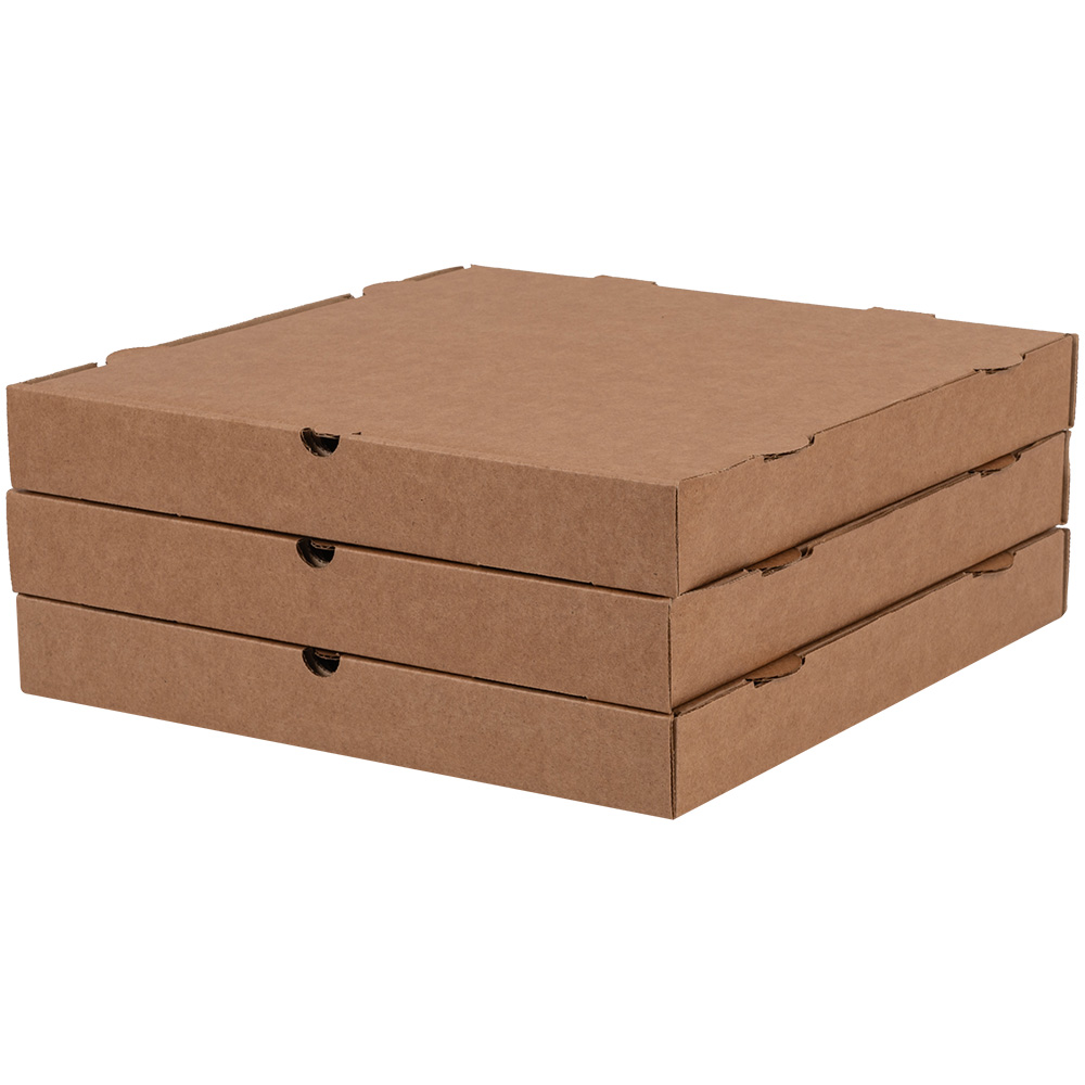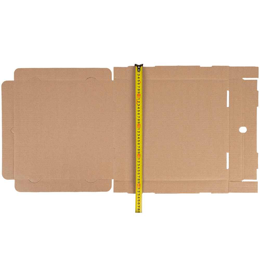 Бурая коробка для пиццы, длиной 330 мм, шириной 330 мм и высотой 40 мм. Изготовлена из трехслойного картона марки Т-23. Полезный объём — 4.36 л. Производится в России.