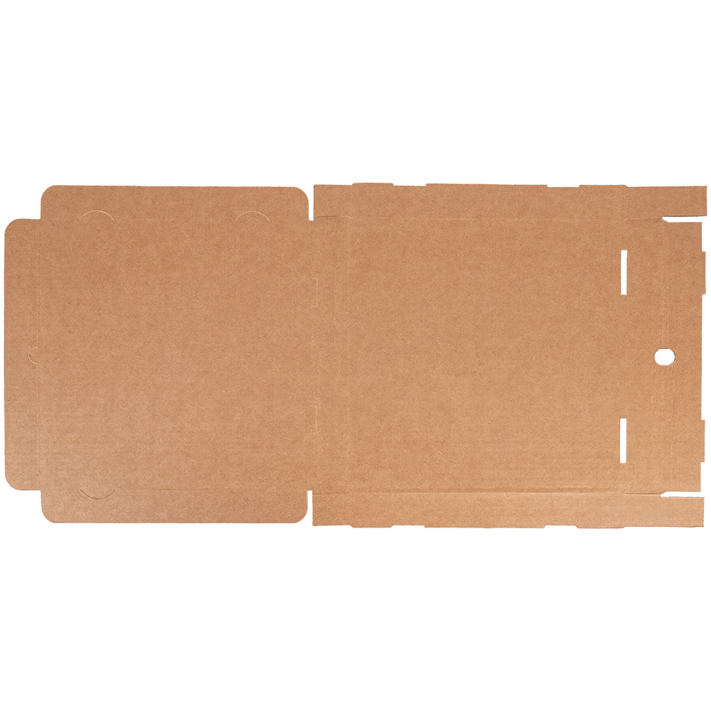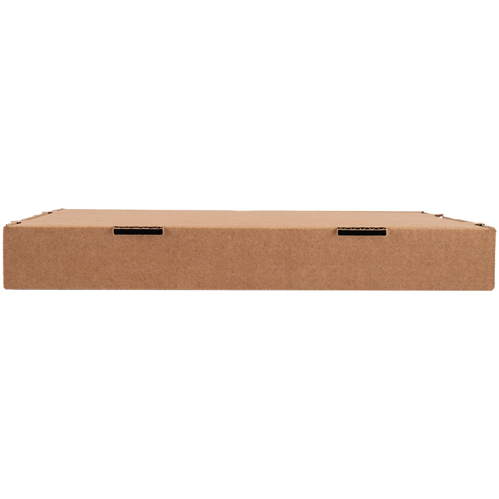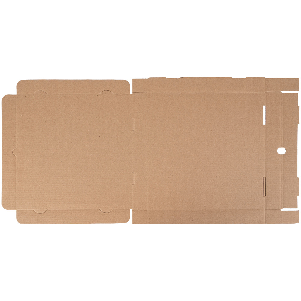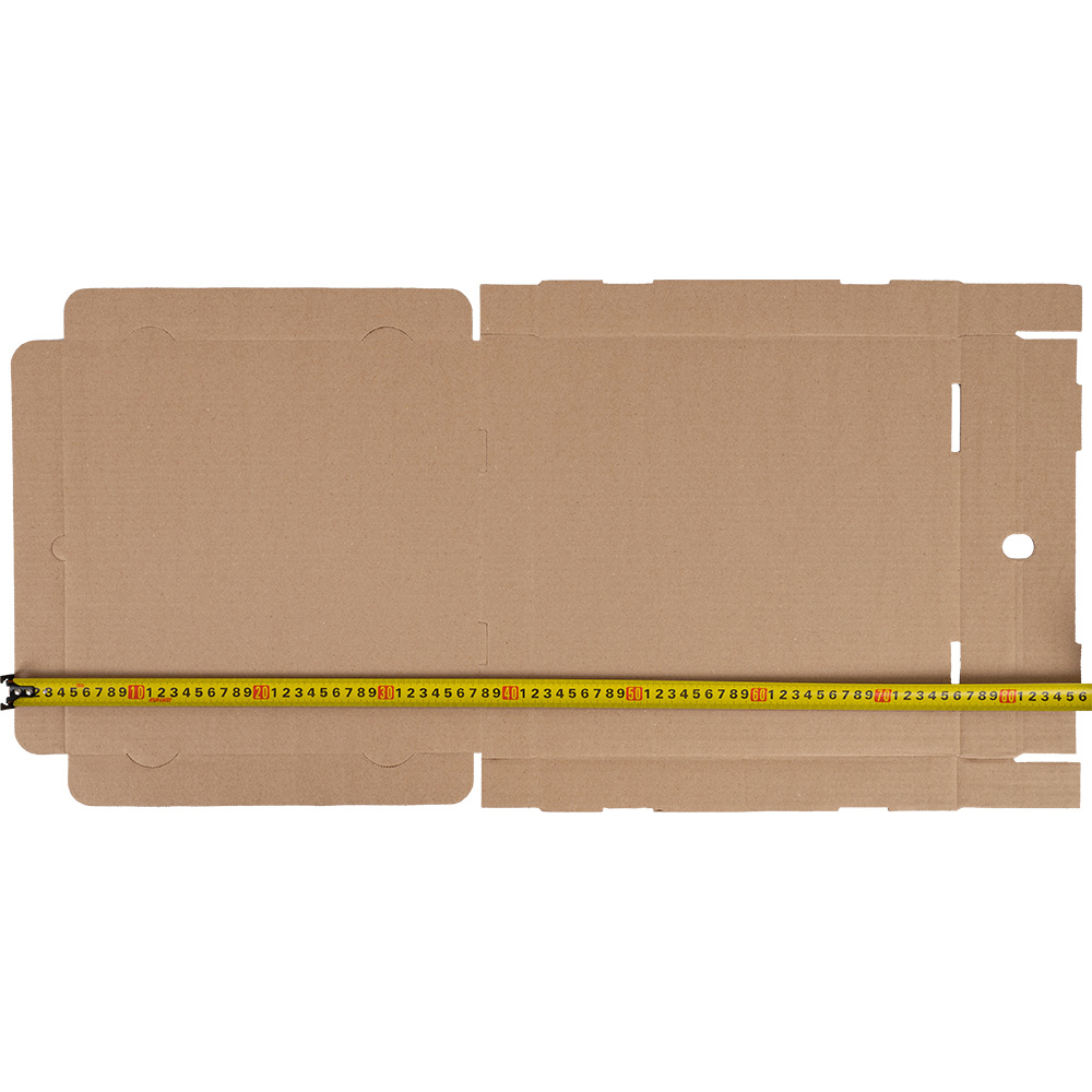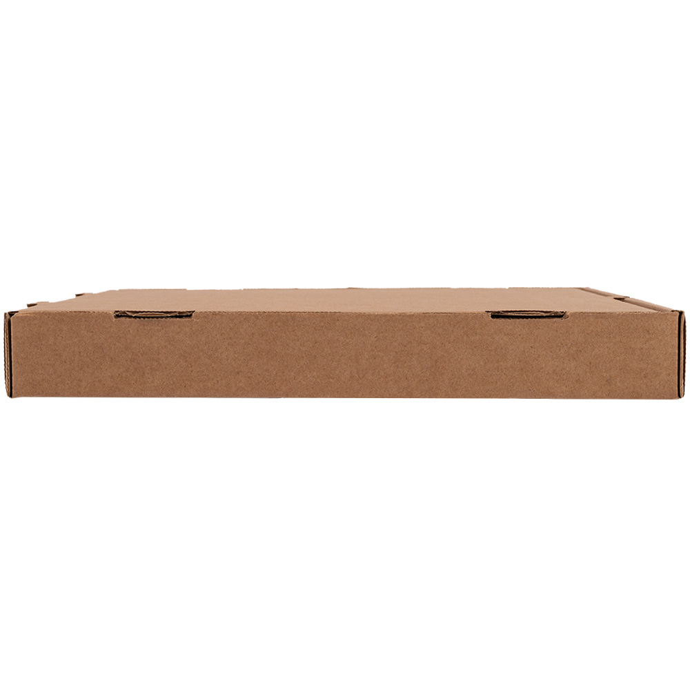 Бурая коробка для пиццы, длиной 330 мм, шириной 330 мм и высотой 40 мм. Изготовлена из трехслойного картона марки Т-23. Полезный объём — 4.36 л. Производится в России.