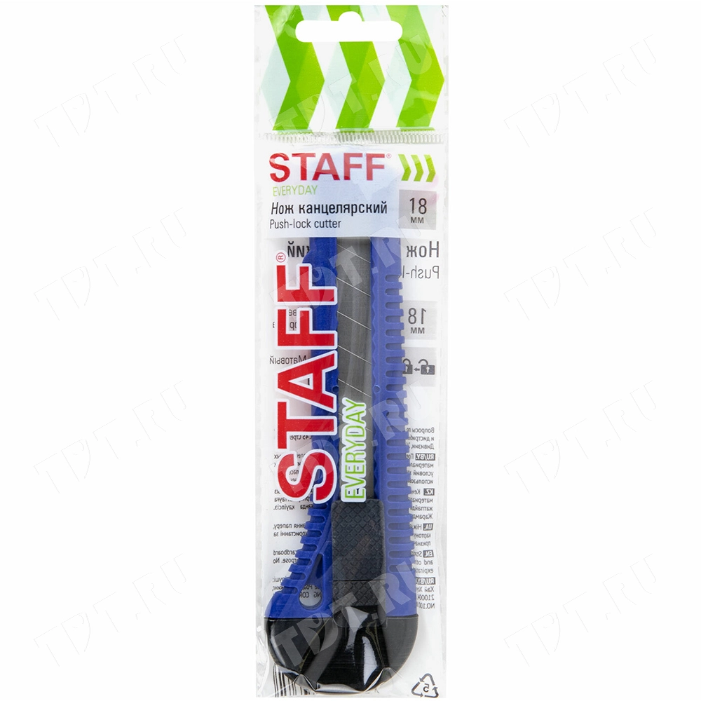Нож канцелярский STAFF «EVERYDAY» с отламываемым лезвием, код производителя 238179, Push-lock cutter, шириной 18 мм. Материал – пластик. Производится в Китае.