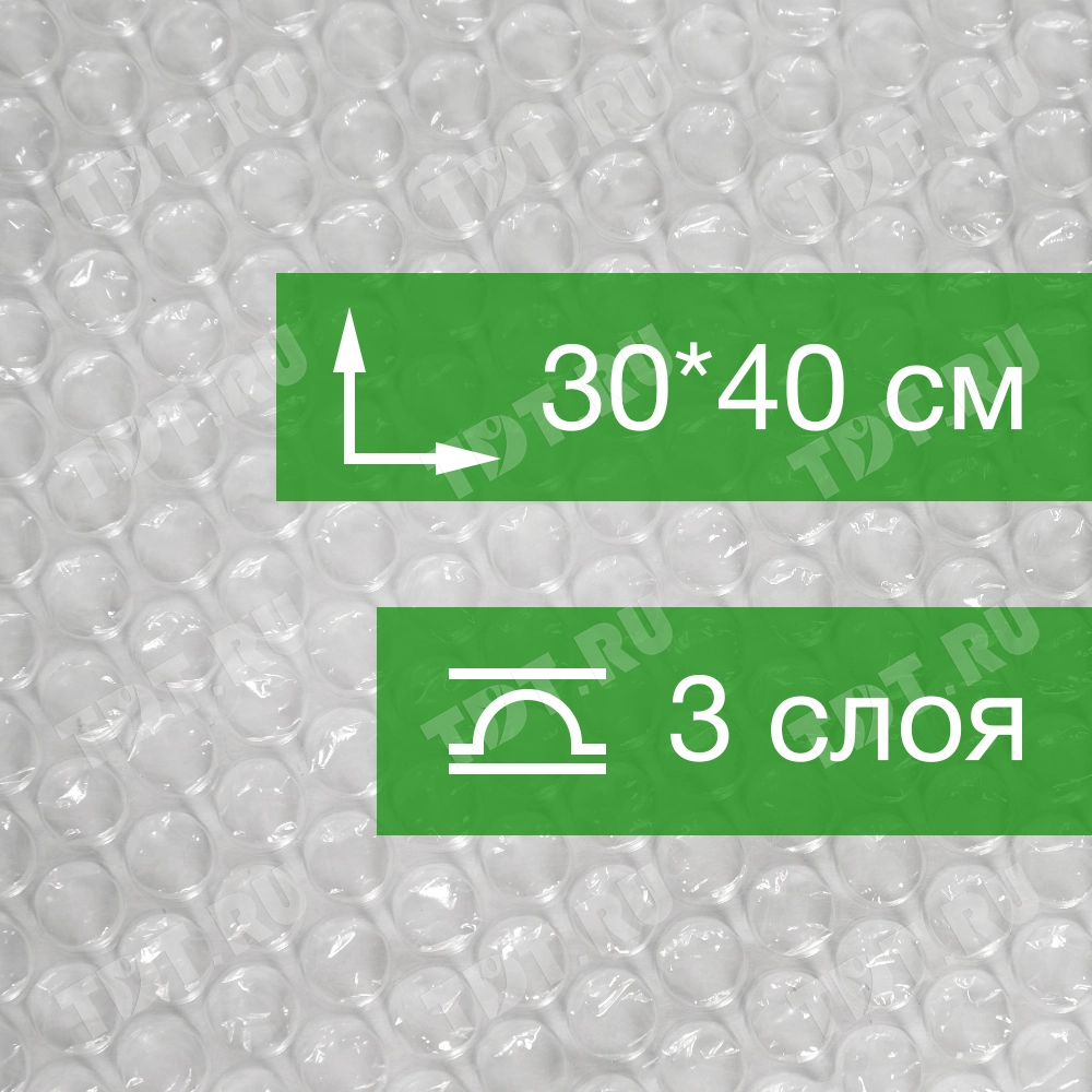 Прозрачный трехслойный воздушно-пузырчатый пакет Бета-Куверт, длиной 30 см, шириной 40 см, диаметром пузырька 10 мм, плотностью 60 г/м². Изготовлен из полиэтилена. Производится в России.