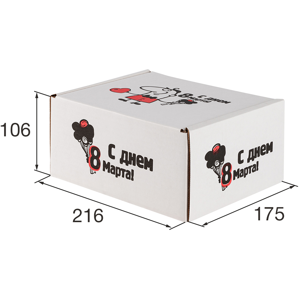 Подарочная коробка «С 8 Марта! - Самой красивой», белёная снаружи, бурая внутри, длиной 216 мм, шириной 175 мм и высотой 106 мм. Изготовлена из гофрокартона Т-23 В. Полезный объём — 4 л.