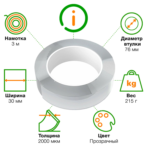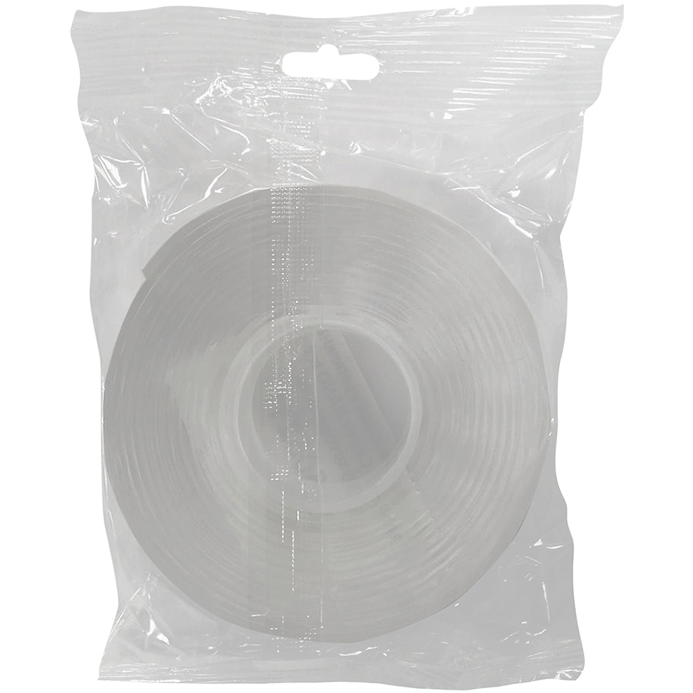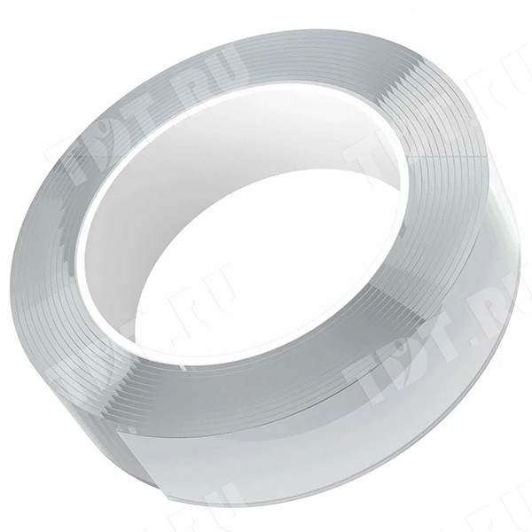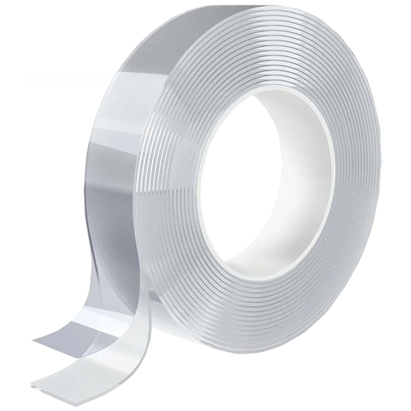 Многоразовая двухсторонняя крепежная лента «Скотч NANO tape», намоткой 3 метра, шириной 3 мм, толщиной 2 мм, прозрачного цвета, изготовлена из акрила. Пластиковая втулка размером 38*30*2.5 мм.