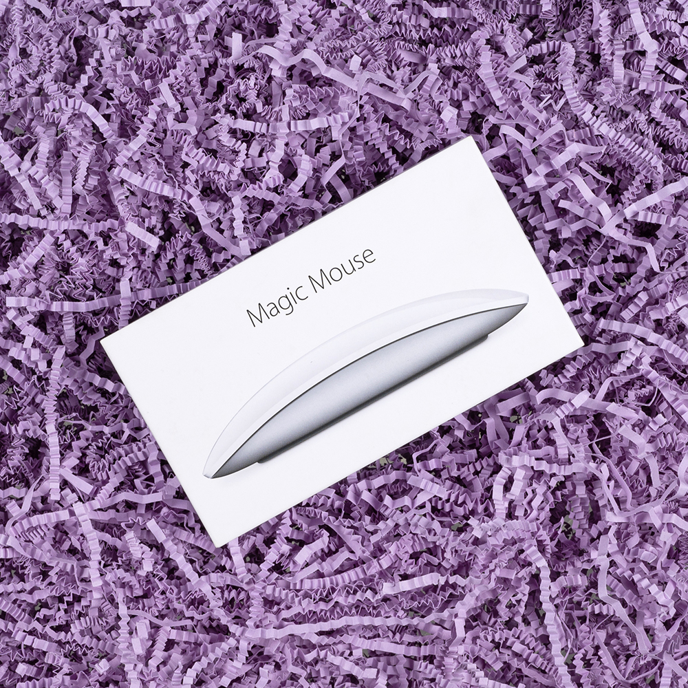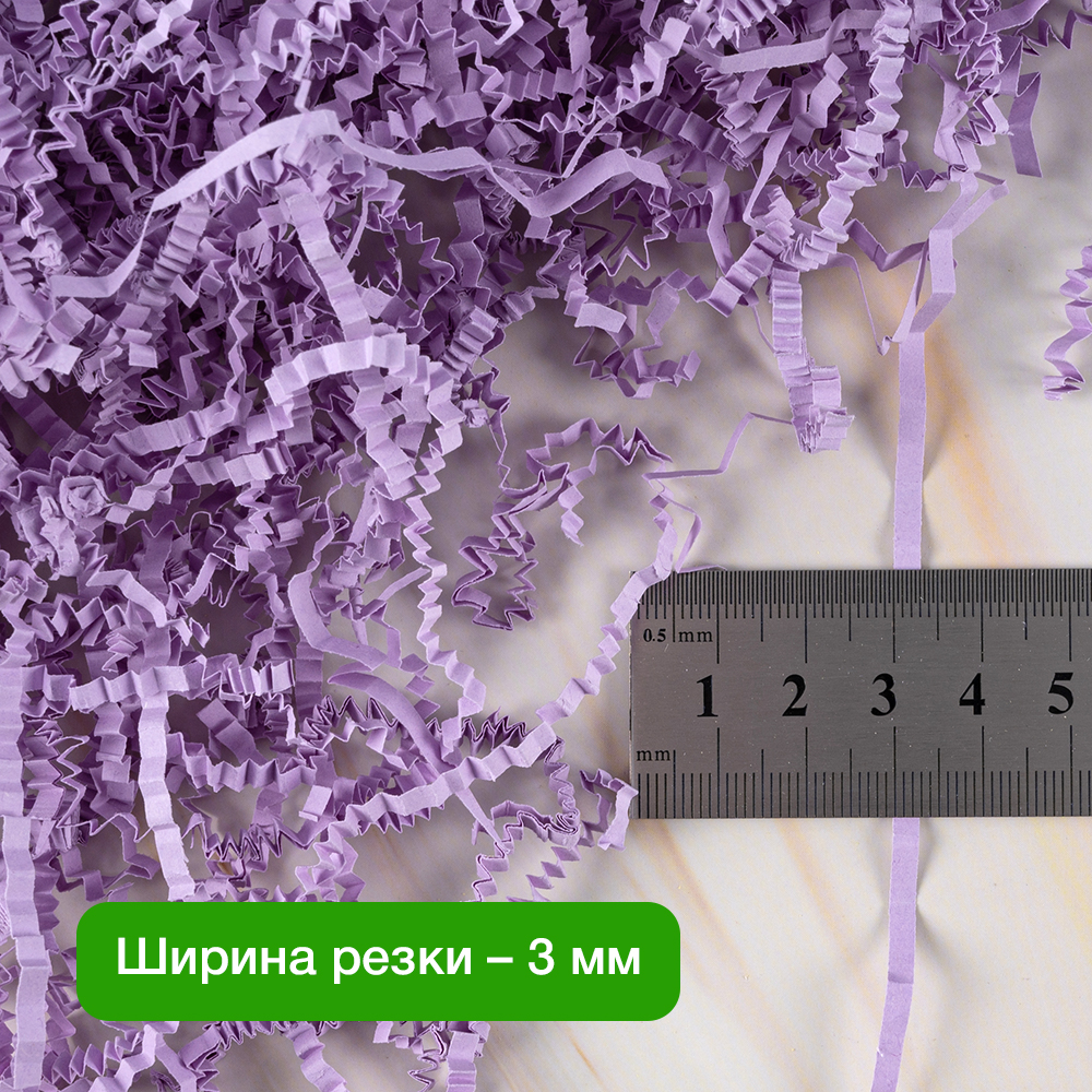 Бумажный подарочный наполнитель «Горная лаванда» из цветной бумаги сиреневого цвета, весом 1 кг, плотностью 80 г/м², шириной резки 3 мм. Производится в России.