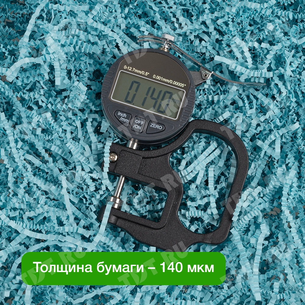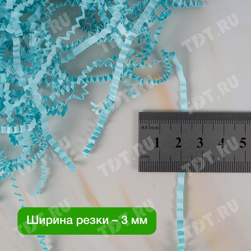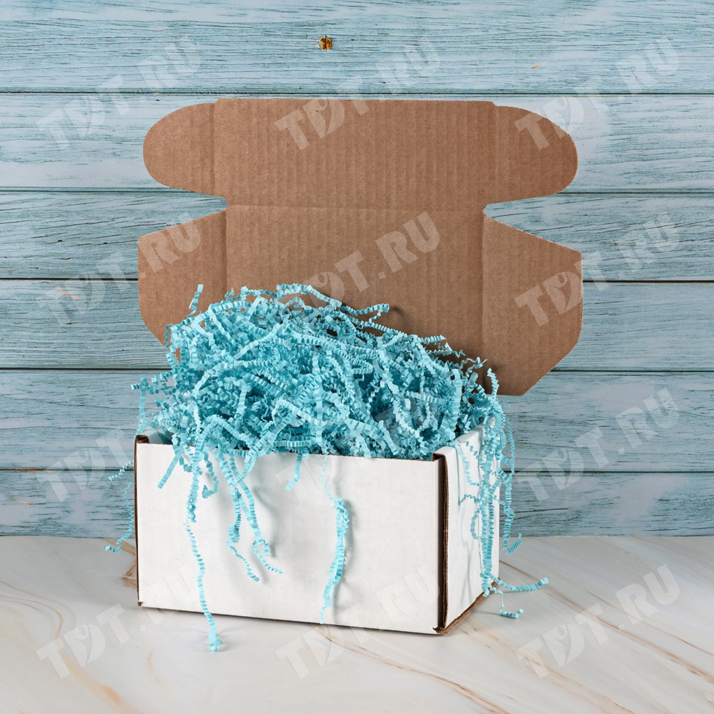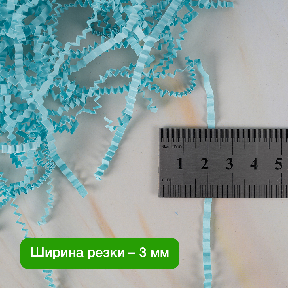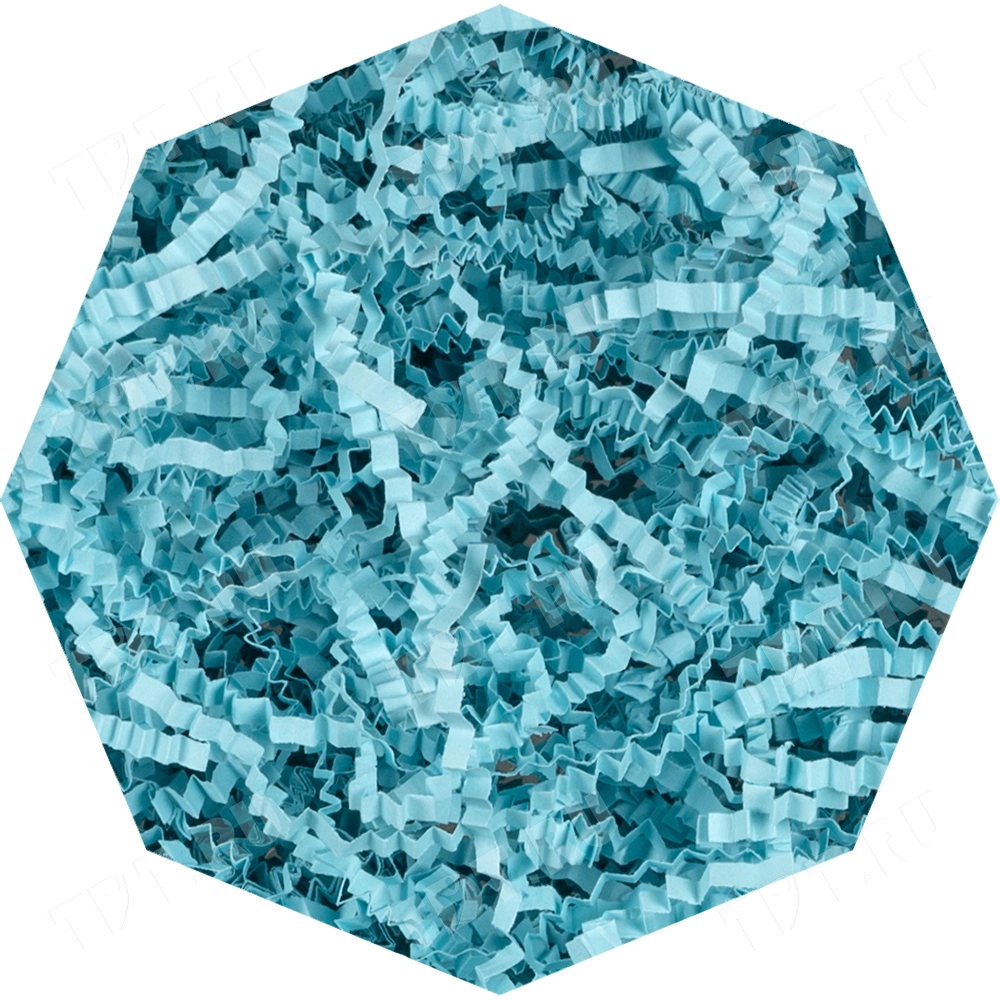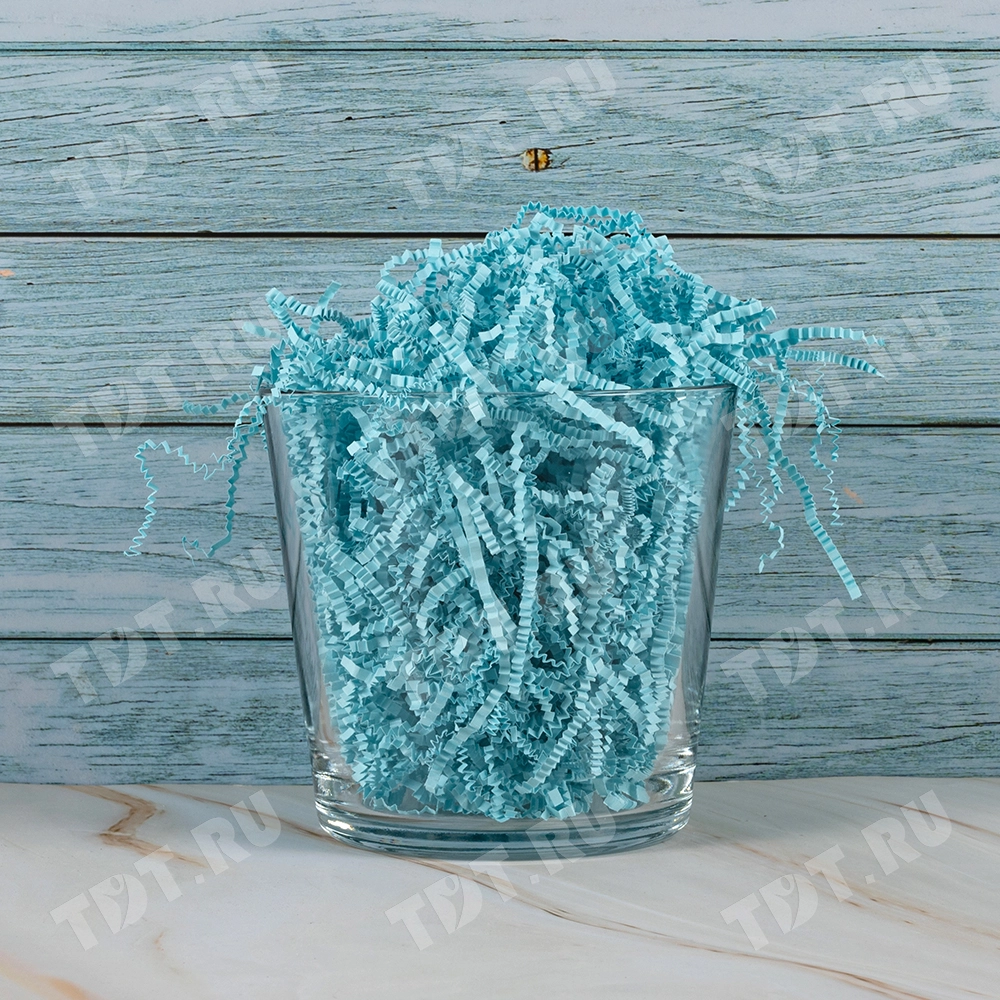 Бумажный подарочный наполнитель «Родниковая вода» из цветной бумаги светло-голубого цвета, весом 1 кг, плотностью 80 г/м², шириной резки 3 мм. Производится в России.