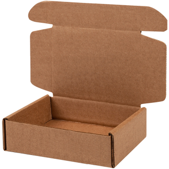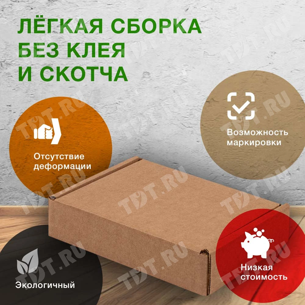 Самосборный короб №140, бурого цвета, длиной 180 мм, шириной 140 мм и высотой 60 мм. Изготовлен из гофрокартона Т-23 В (целлюлоза). Полезный объём — 1.5 л.