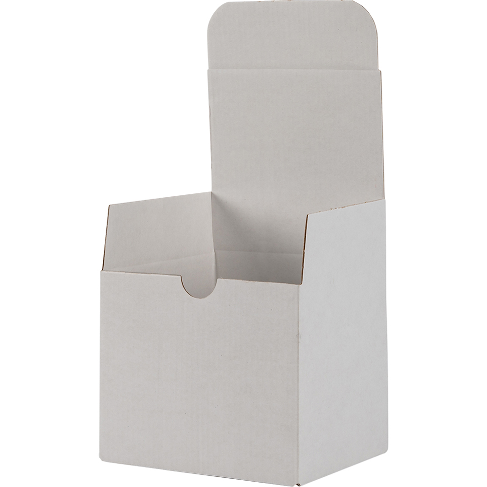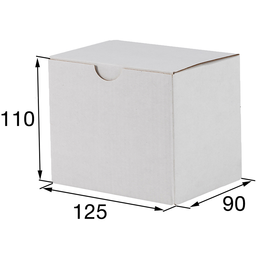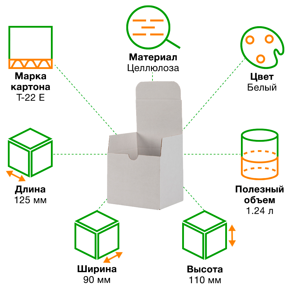 Самосборный короб №241/1 белого цвета, длиной 125 мм, шириной 90 мм и высотой 110 мм. Изготовлена из микрогофрокартона Т-22 Е. Полезный объём — 1.24 л.