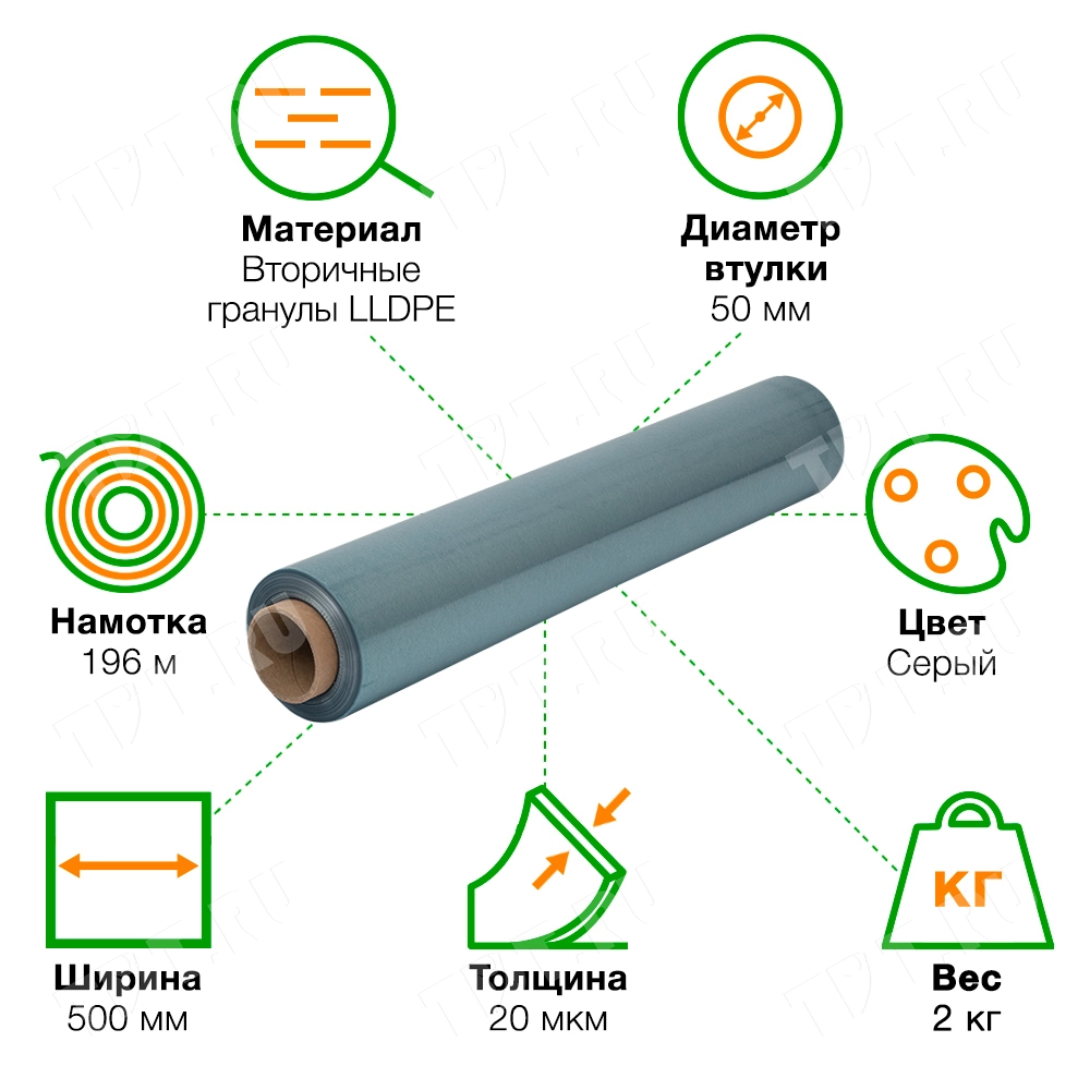 Стрейч пленка ЭКОНОМ ПЛЮС серо-синего цвета, второго сорта, намоткой 196 м, шириной 500 мм, толщиной 20 мкм. Изготовлена из вторичных гранул LLDPE. Специальный состав пленки обеспечивает высокую клейкость как летом, так и зимой (актуально для неотапливаемых помещений). Повышенная защита от ультрафиолетовых лучей.