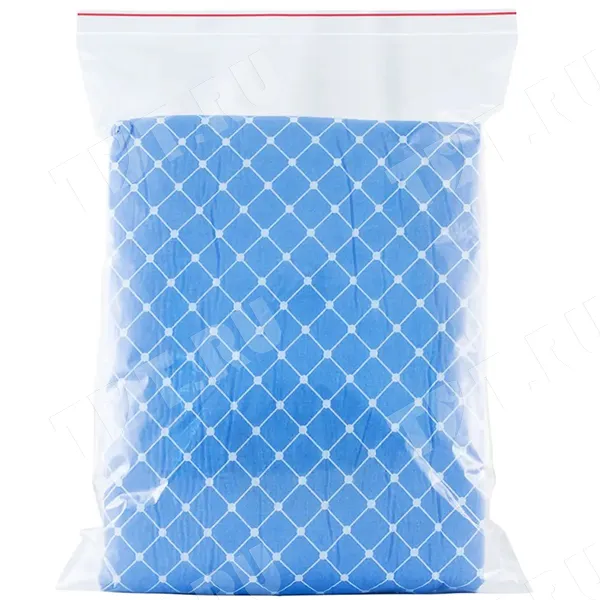 Пакеты Zip-Lock, прозрачного цвета с красной полосой, длиной 450 мм, шириной 350 мм, толщиной 22-25 мкм, в упаковке по 100 штук. Материал — полиэтилен высокого давления (ПВД). Производятся в Китае.