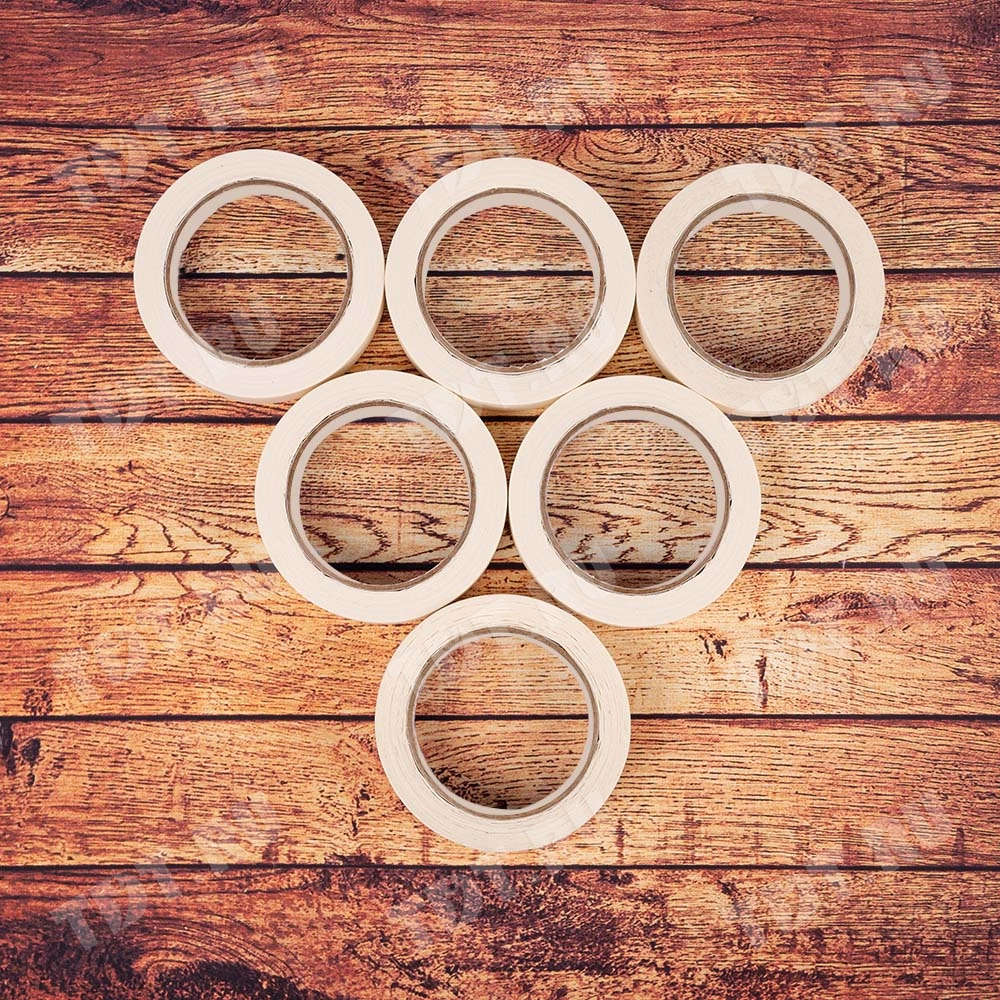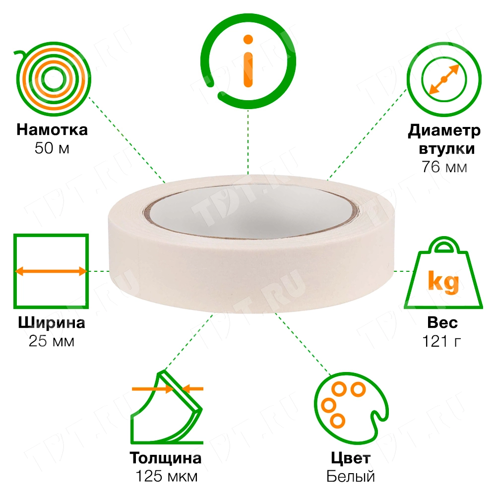 Узкая малярная лента шириной 25 мм, диаметром втулки 76 мм, намоткой 50 метров. Изготовлена на основе крепированной бумаги.
