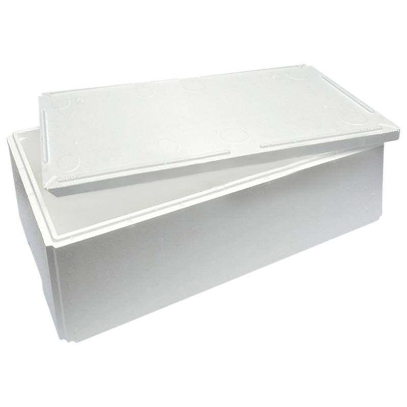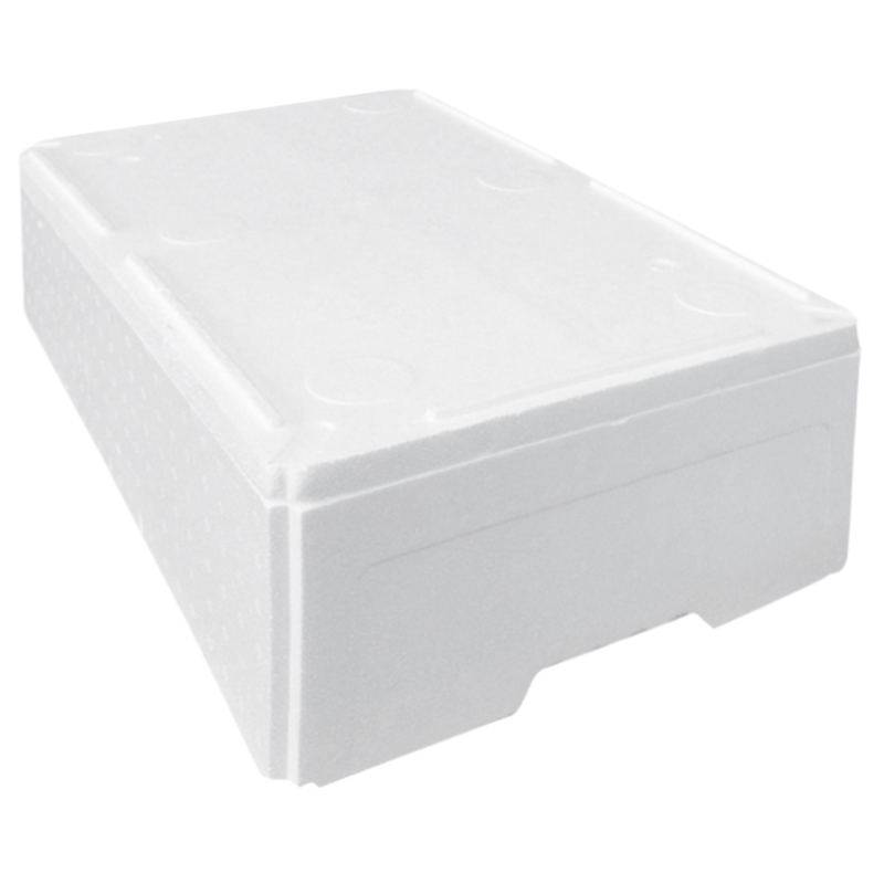 Пищевые термоконтейнеры FB-025H с крышкой и отверстиями для слива, объемом 25 л, длиной 610 мм, шириной 350 мм, высотой без учета крышки 164 мм. Материал: пенопласт. Производятся в России.