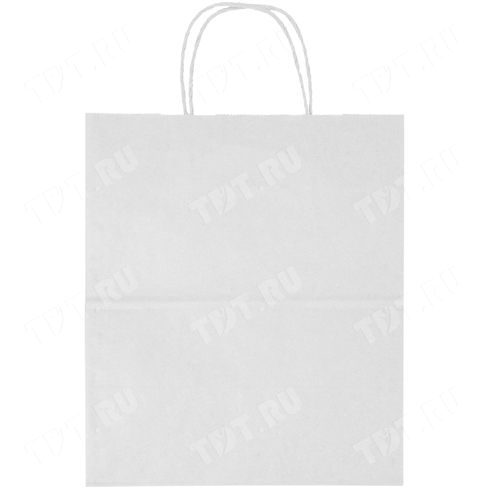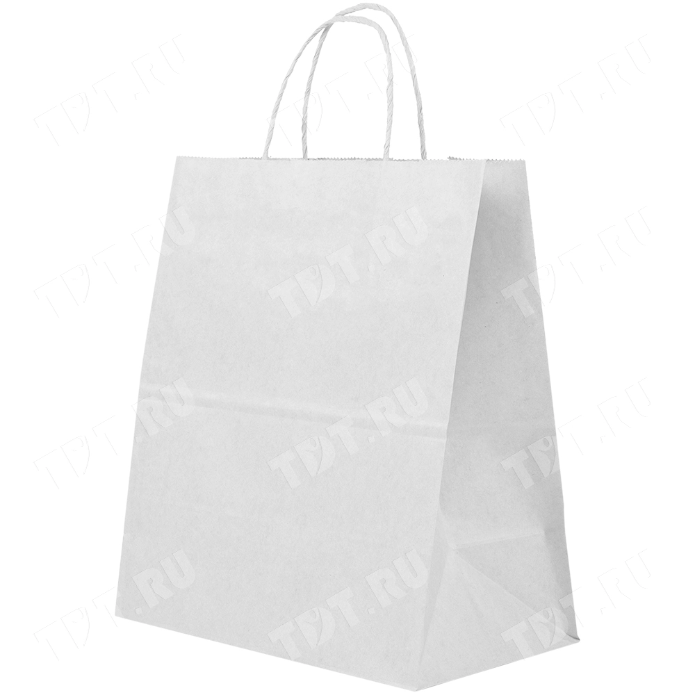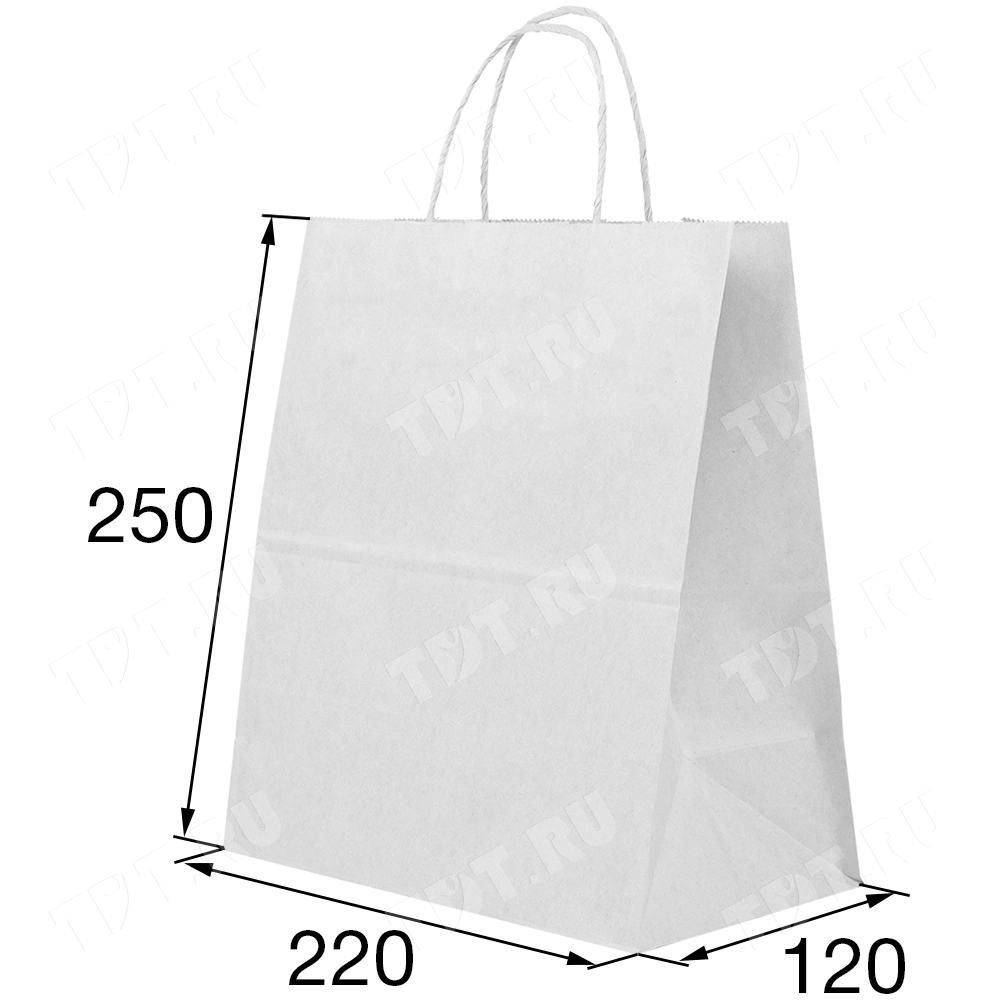 Белый крафт-пакет с кручёной ручкой длиной 220 мм, шириной 120 мм, высотой 250 мм, плотностью 80 г/м². Пакеты производятся в России.