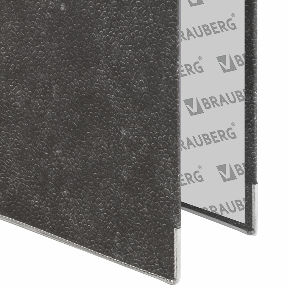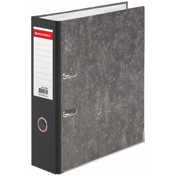 Папка-регистратор Brauberg, фактура стандарт, код производителя 220987, цвета черный мрамор, форматом А4, шириной корешка в 75 мм, с размещением до 550 листов. Серия – Marble. Производится в России.