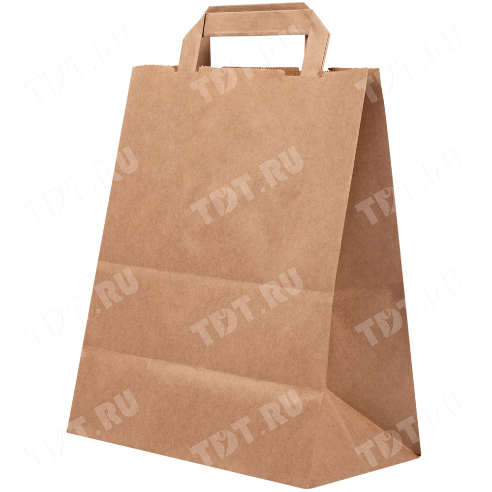 Бурый крафт-пакет с плоской ручкой длиной 260 мм, шириной 150 мм, высотой 350 мм, плотностью 70 г/м². Пакеты производятся в России.