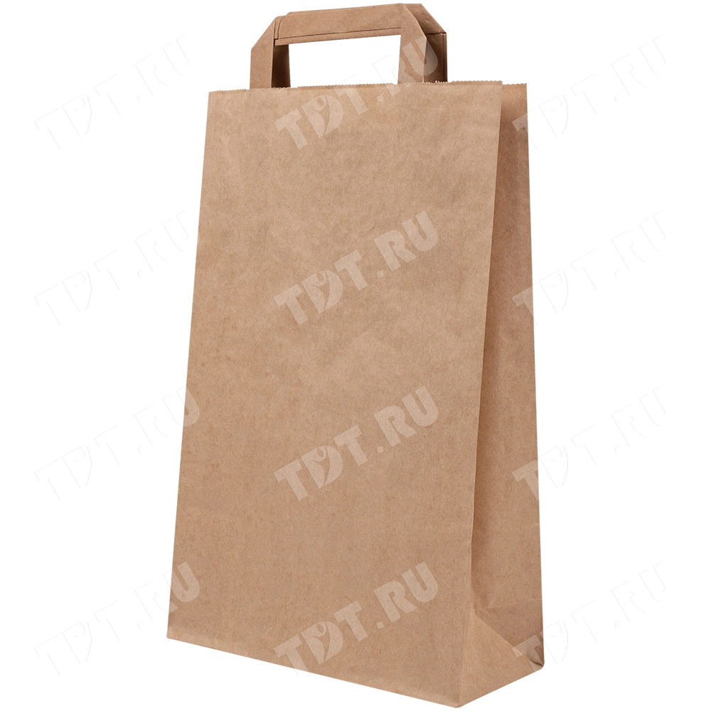 Бурый крафт-пакет с плоской ручкой длиной 240 мм, шириной 110 мм, высотой 310 мм, плотностью 70 г/м². Пакеты производятся в России.
