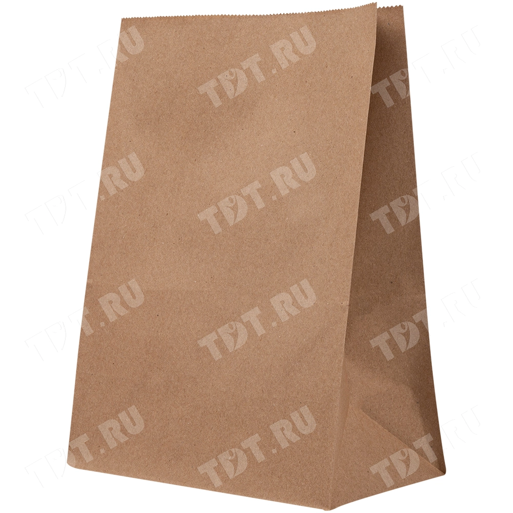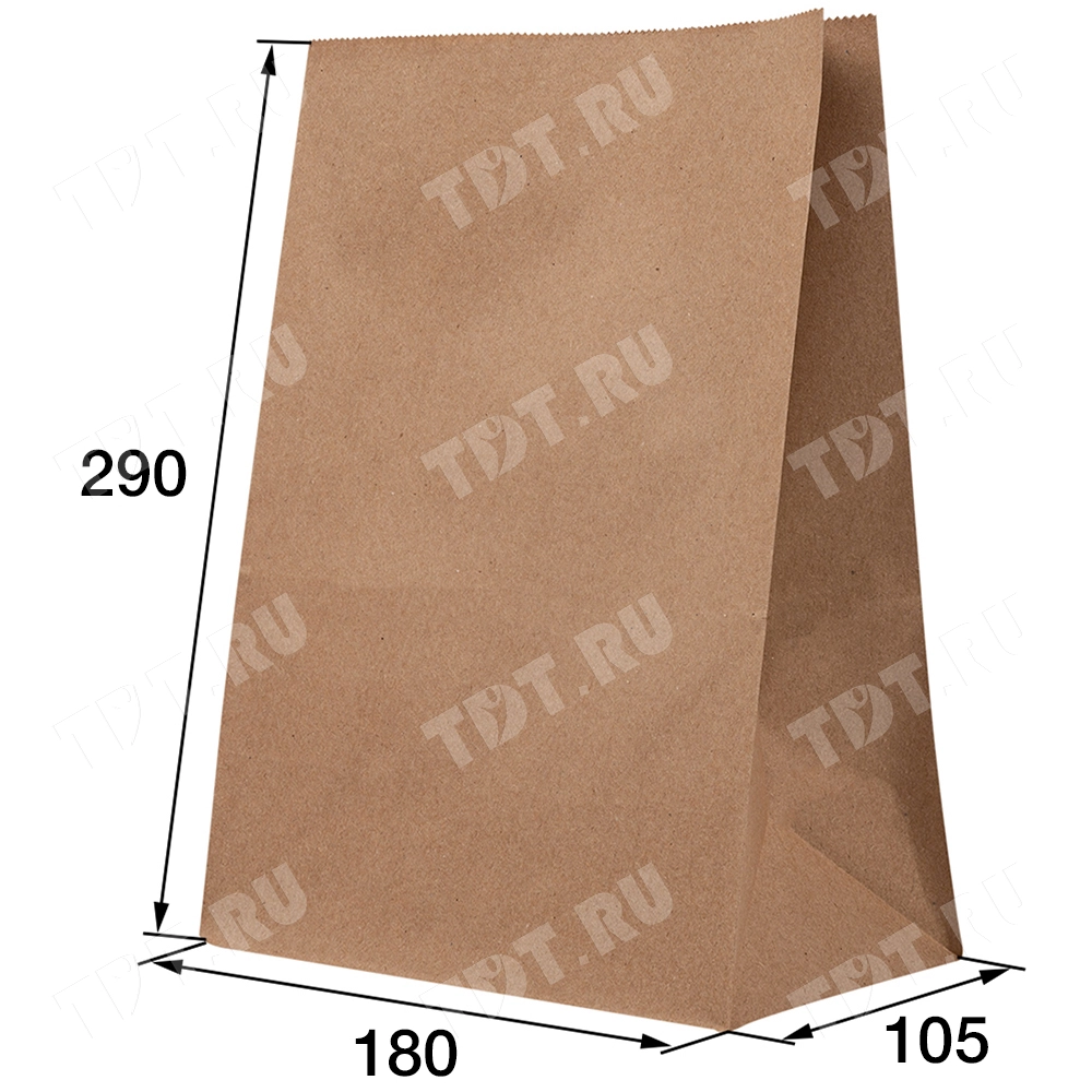Бумажный крафт пакет с прямоугольным дном без ручек длиной 180 мм, шириной 105 мм, высотой 290 мм, плотностью 70 г/м². Пакеты производятся в России.