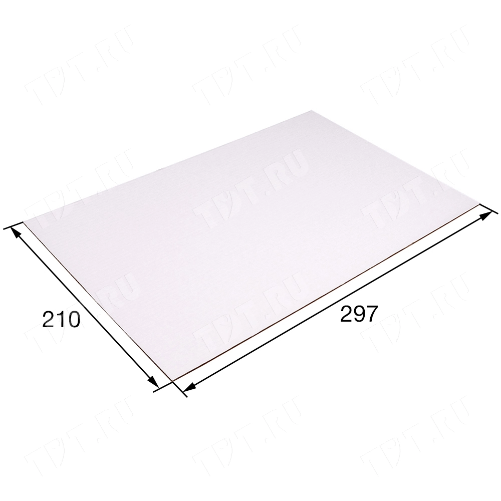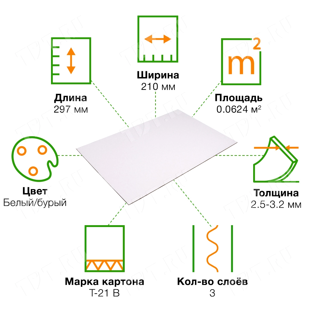Трехслойный маленький лист гофрокартона формата А4, бело-бурого цвета, марки Т-21 В, длиной 297 мм, шириной 210 мм, толщиной 2.5-3.2 мм, площадью 0.0624 м². Производится в России.