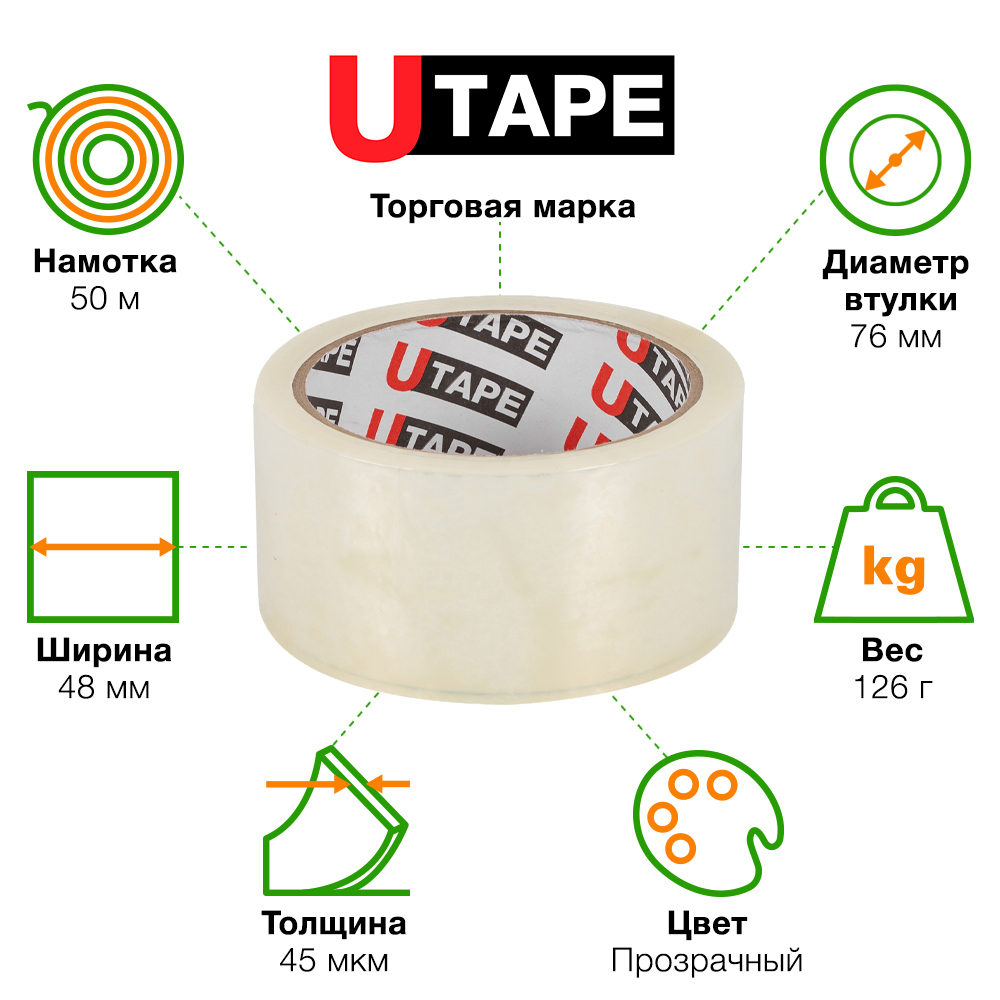 Клейкая лента Utape прозрачная шириной 48 мм, диаметром втулки 76 мм, намоткой 50 метров, толщиной 45 мкм для ручной упаковки. Изготовлена на основе полипропилена. Производитель ООО «Полимернова».
