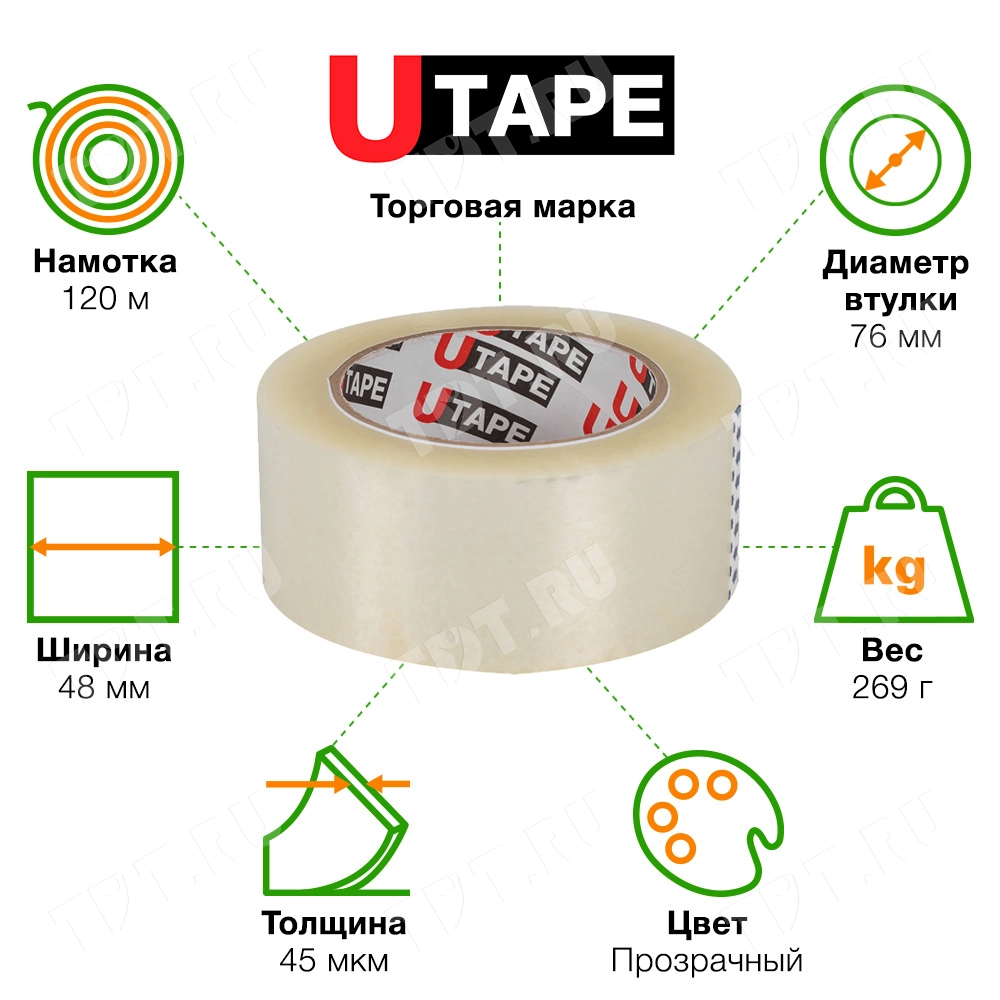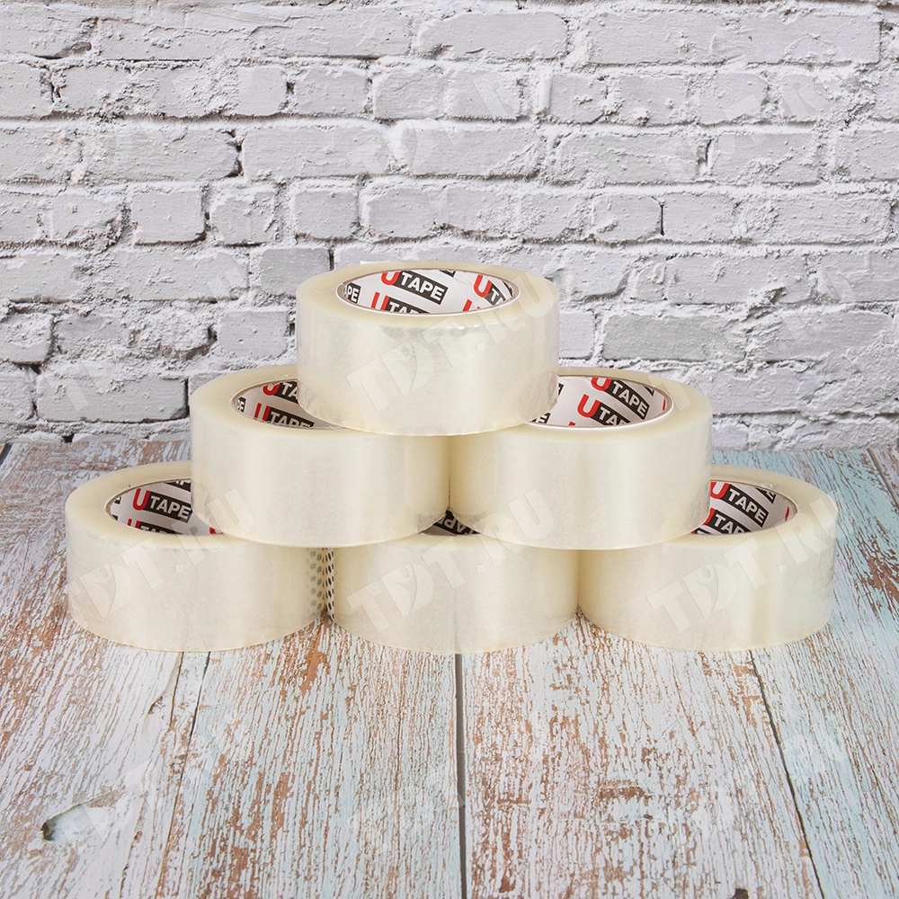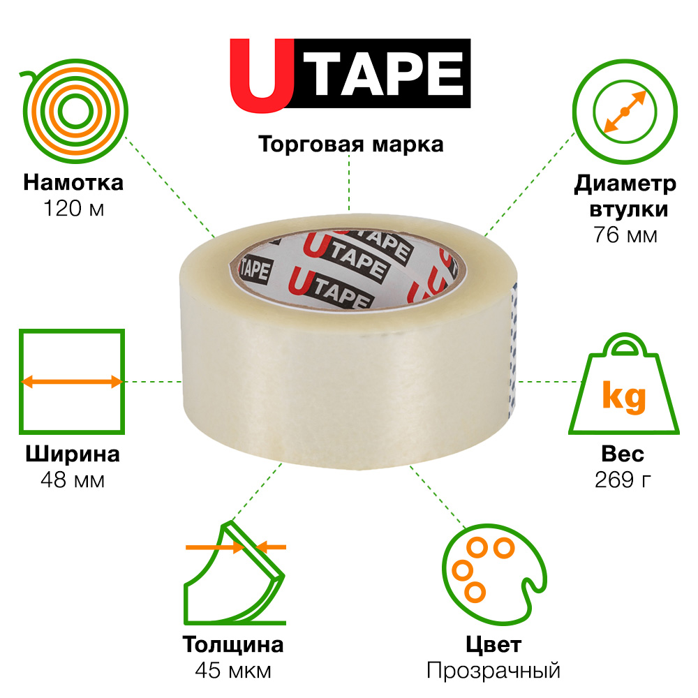 Клейкая лента Utape прозрачная шириной 48 мм, диаметром втулки 76 мм, намоткой 120 метров, толщиной 45 мкм для ручной упаковки. Изготовлена на основе полипропилена. Производитель ООО «Полимернова».
