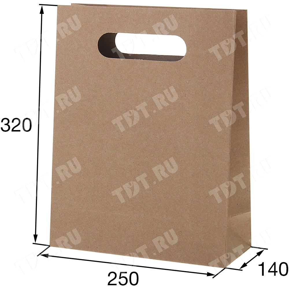 Бумажный крафт пакет с вырубной ручкой шириной 250 мм, глубиной 140 мм, высотой 320 мм, плотностью 70 г/м². Пакеты производятся в России.