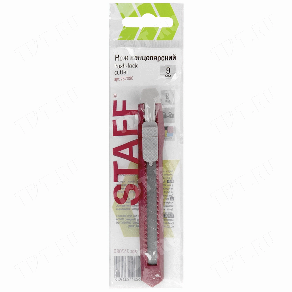 Нож канцелярский STAFF «Basic Economy» с отламываемым лезвием, код производителя 237080, Push-lock cutter, шириной 9 мм. Материал корпуса – пластик. Производится в Китае.