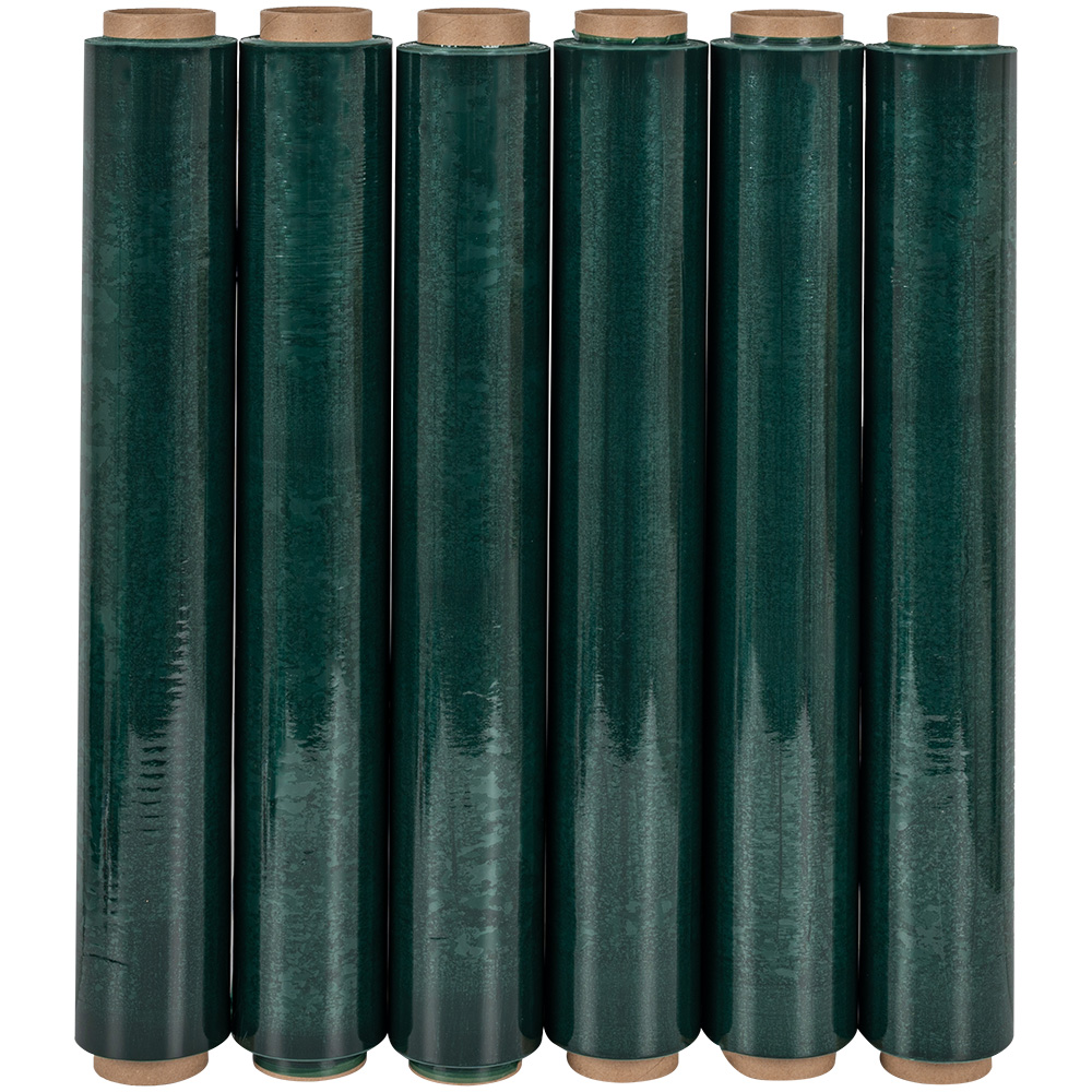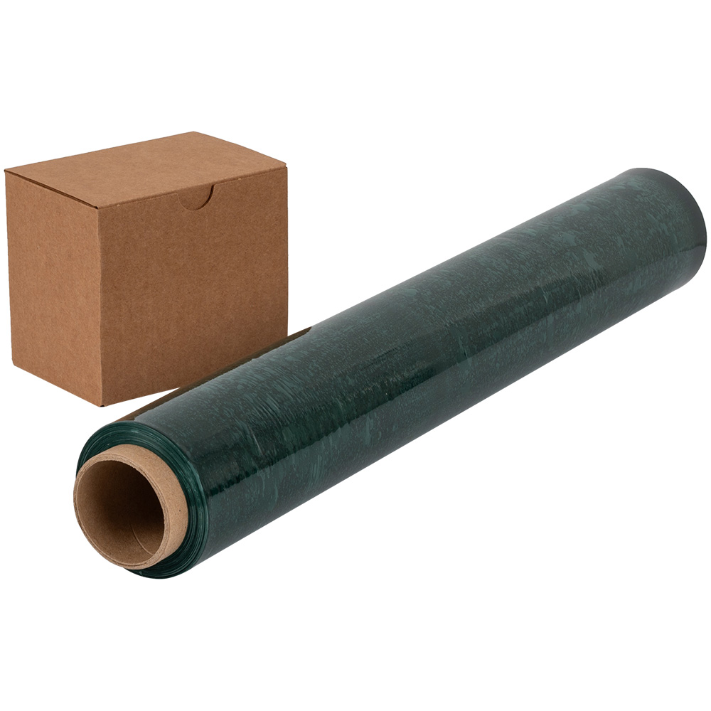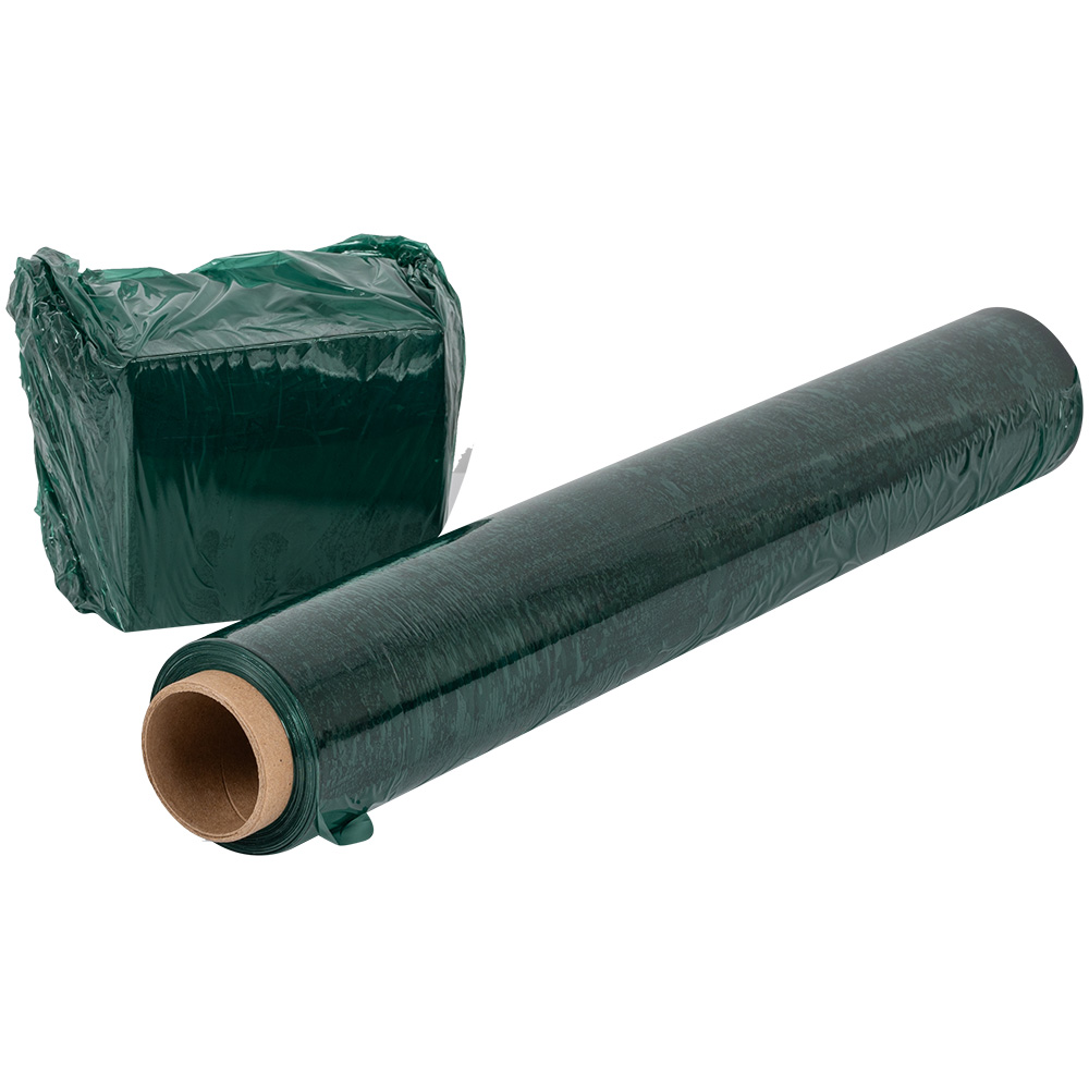 Стрейч пленка «Благородный малахит», темно-зеленая, в рулоне намоткой 100 м, шириной 500 мм, толщиной 20 мкм, вес рулона 1.15 кг, вес втулки 150 г. Изготовлена из первичных гранул LLDPE. Производится в России.