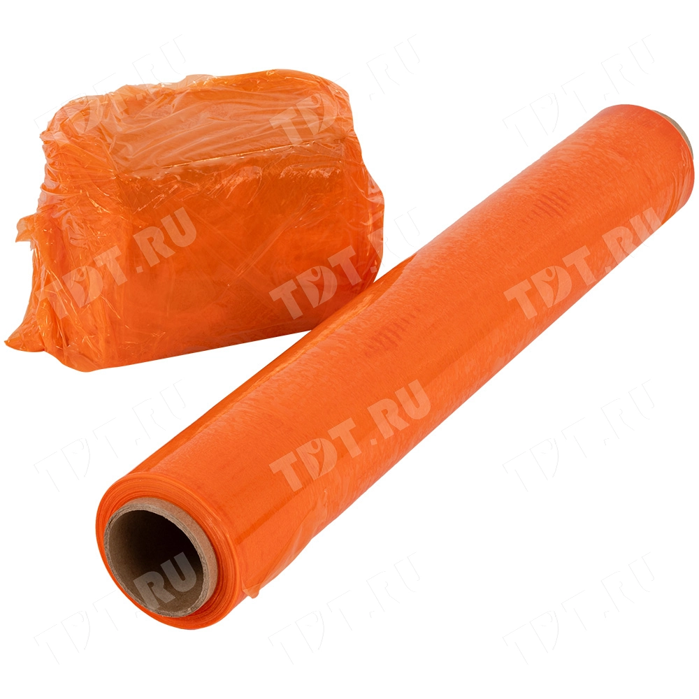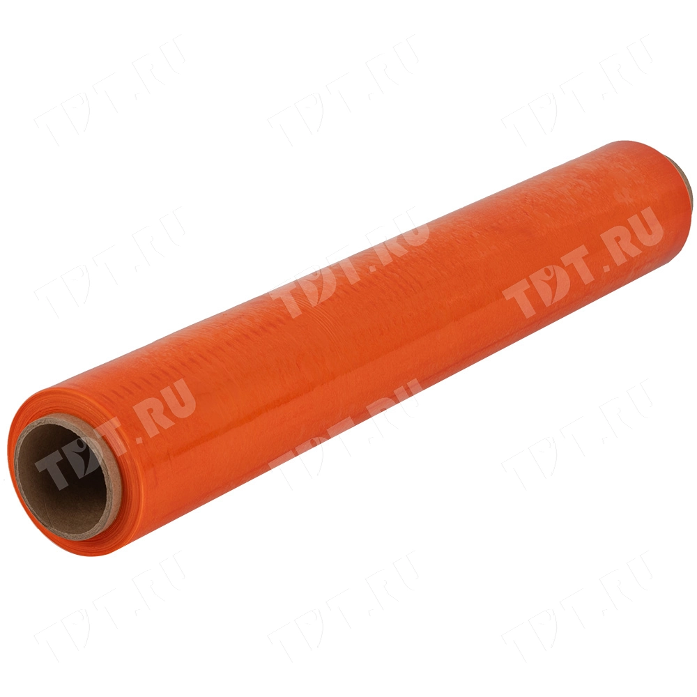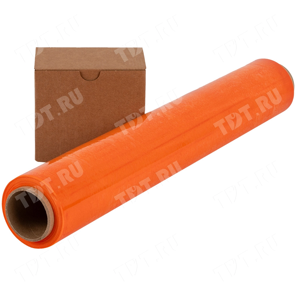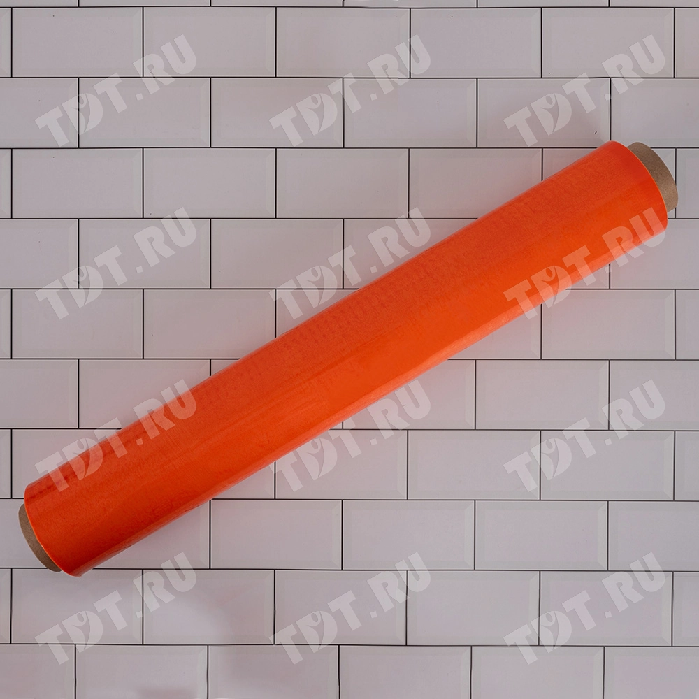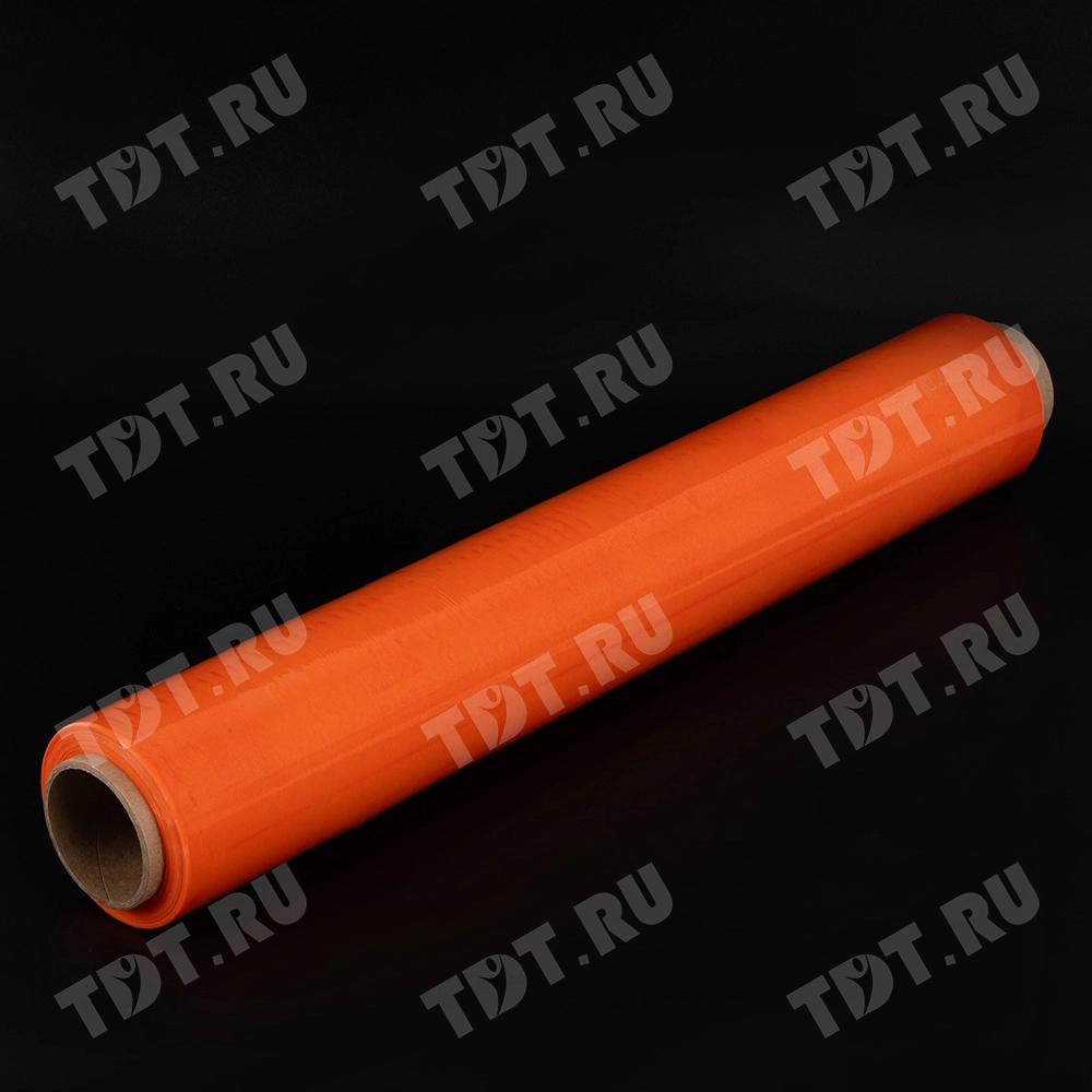 Стрейч пленка «Сочный апельсин», ярко-оранжевая, в рулоне намоткой 100 м, шириной 500 мм, толщиной 20 мкм, вес рулона 1.15 кг, вес втулки 150 г. Изготовлена из первичных гранул LLDPE. Производится в России.