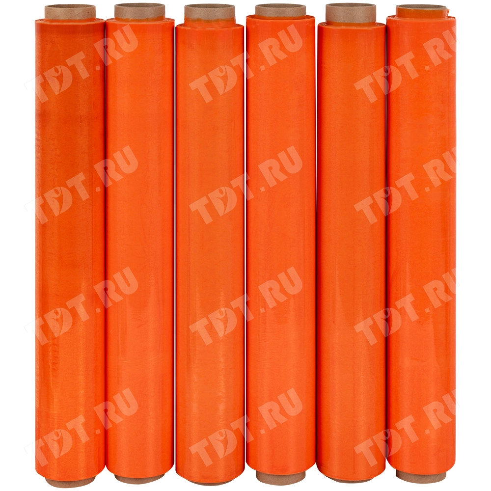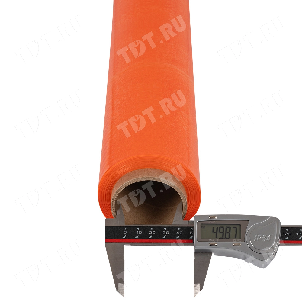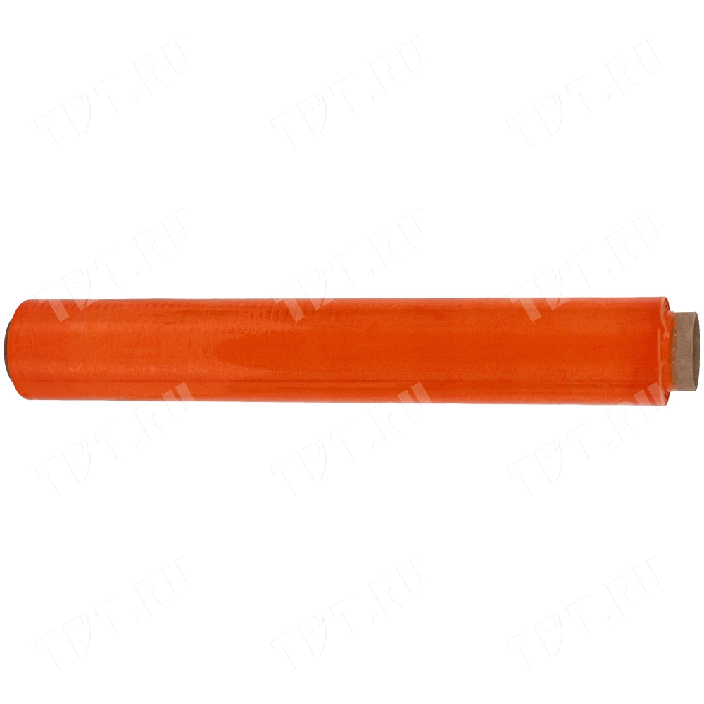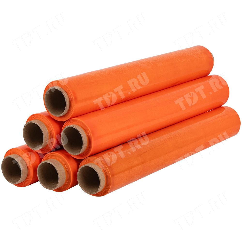 Стрейч пленка «Сочный апельсин», ярко-оранжевая, в рулоне намоткой 100 м, шириной 500 мм, толщиной 20 мкм, вес рулона 1.15 кг, вес втулки 150 г. Изготовлена из первичных гранул LLDPE. Производится в России.