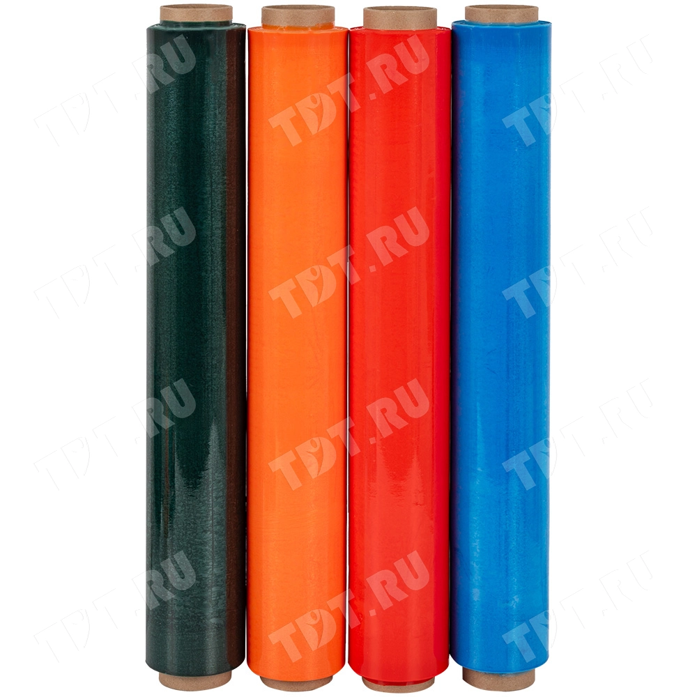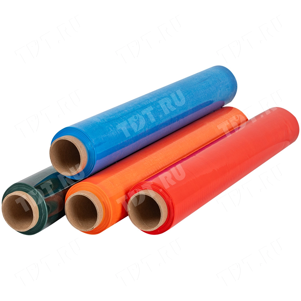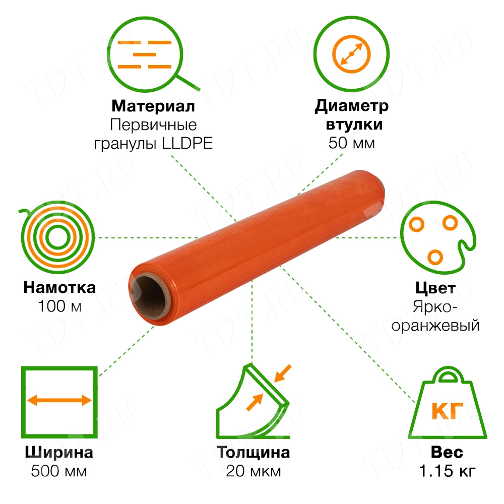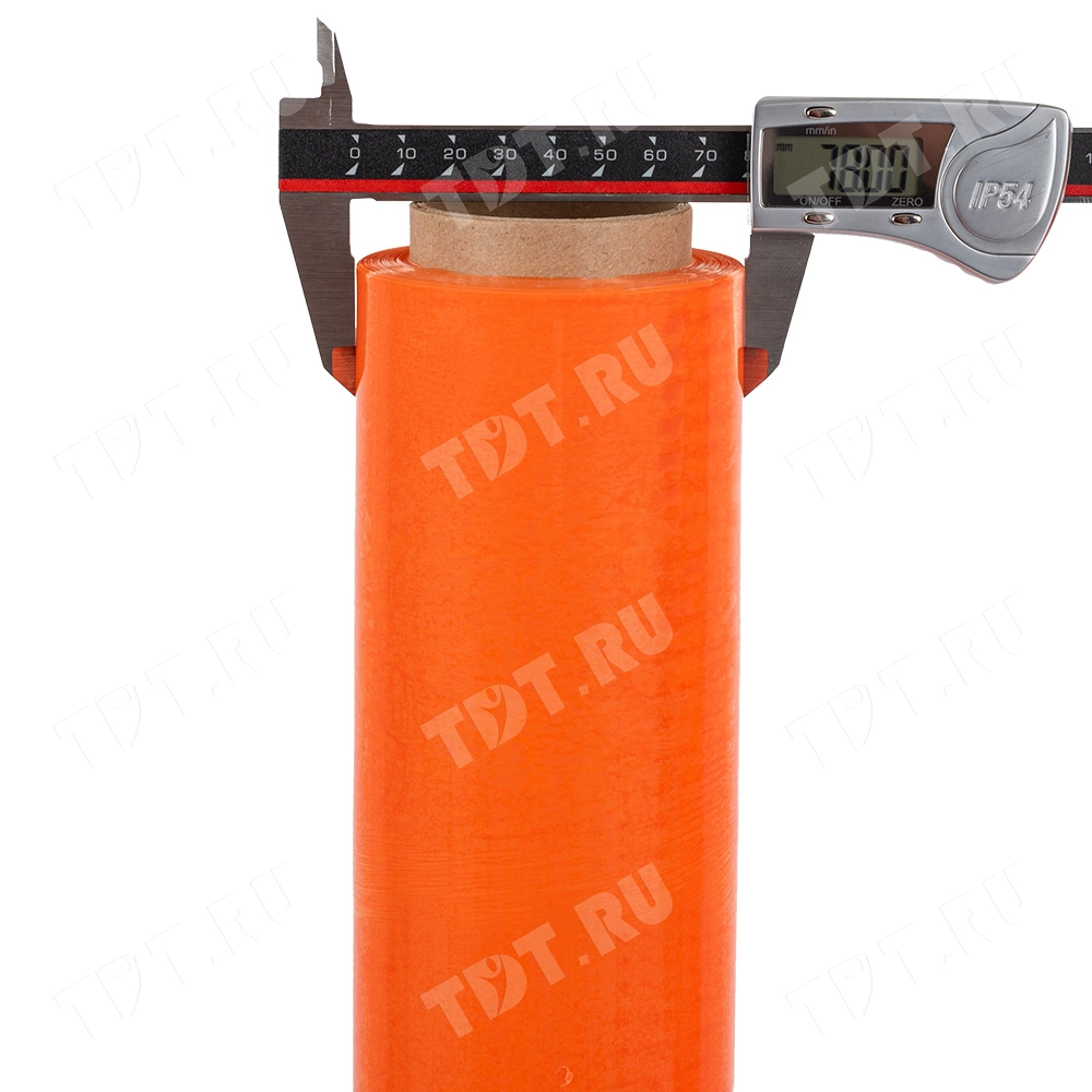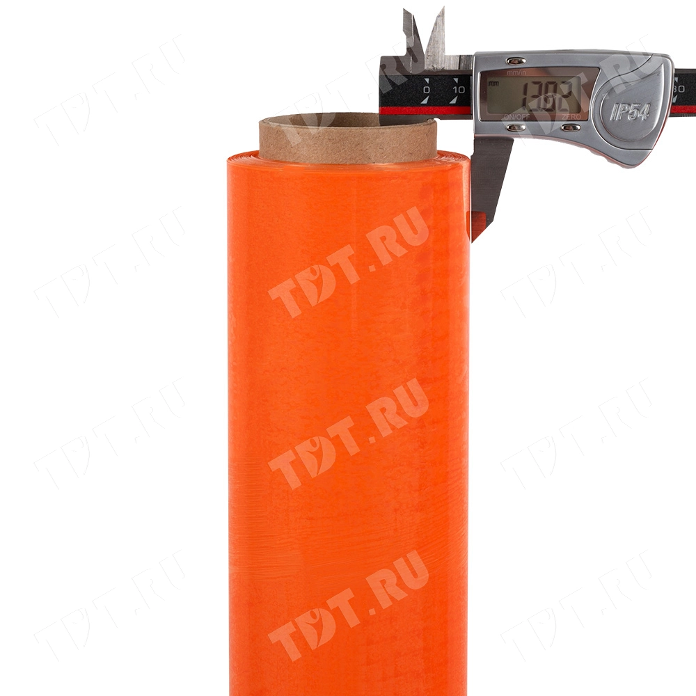 Стрейч пленка «Сочный апельсин», ярко-оранжевая, в рулоне намоткой 100 м, шириной 500 мм, толщиной 20 мкм, вес рулона 1.15 кг, вес втулки 150 г. Изготовлена из первичных гранул LLDPE. Производится в России.