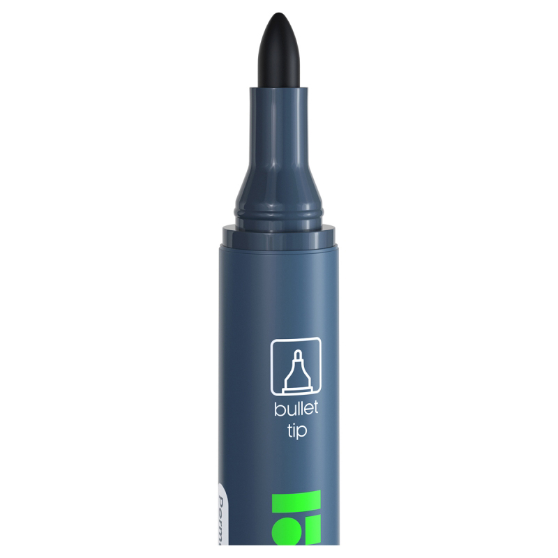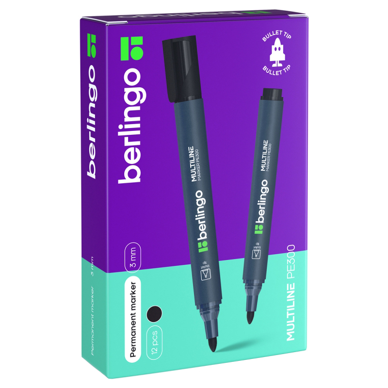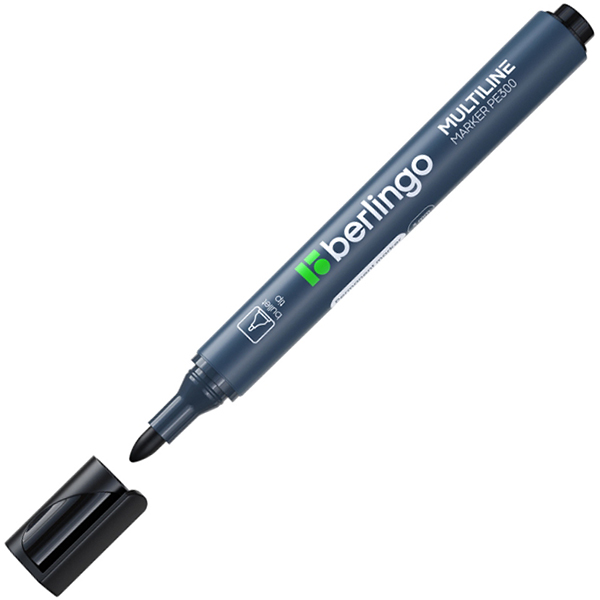 Маркер перманентный Berlingo «Multiline PE300», спиртовой, толщиной пера 3 мм, черного цвета, пулевидный наконечник. Производится в Индии.