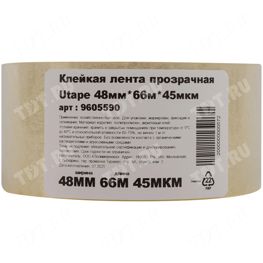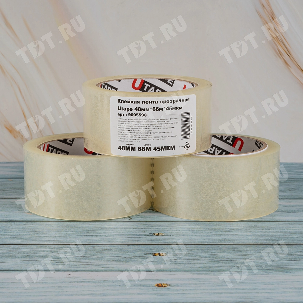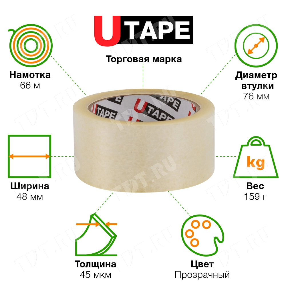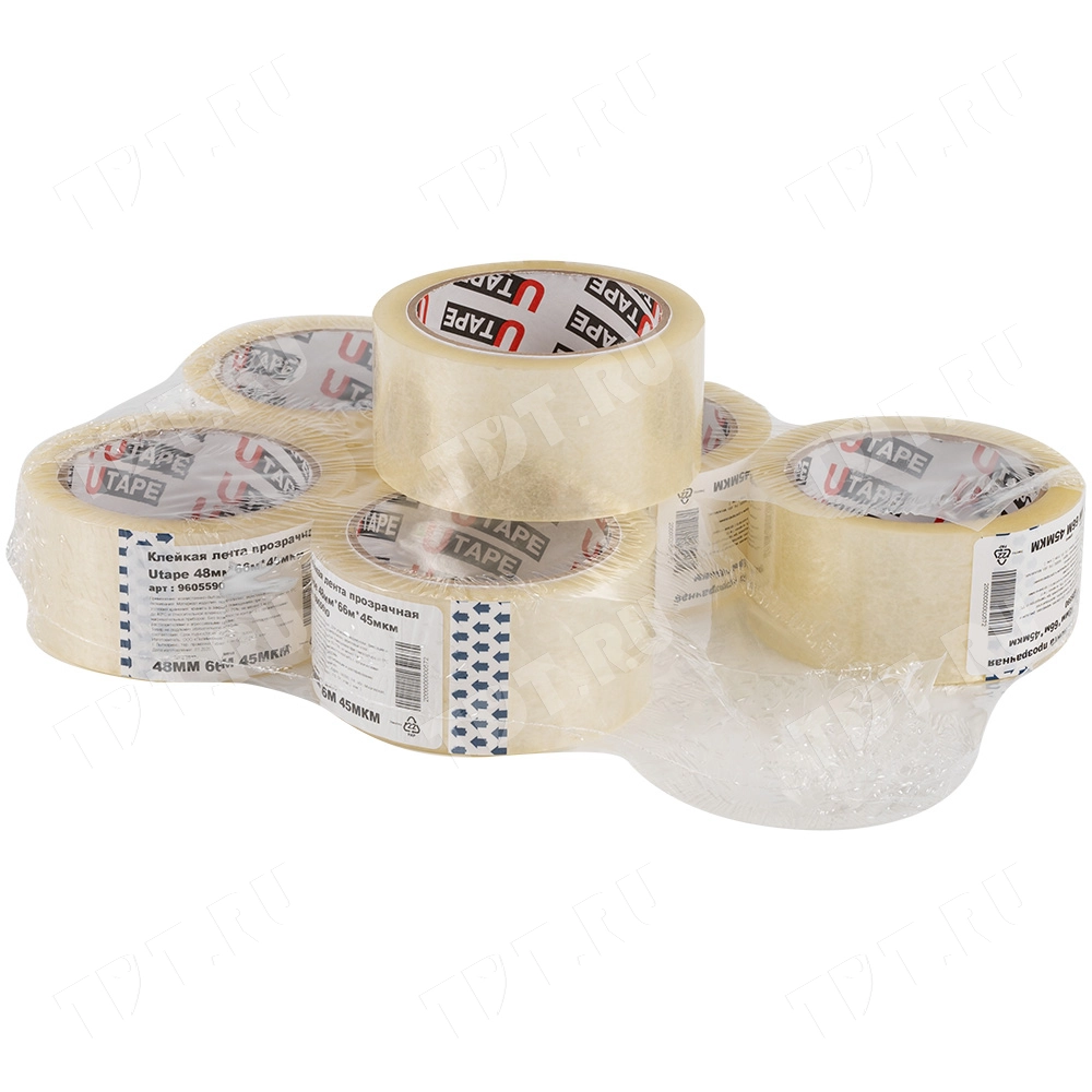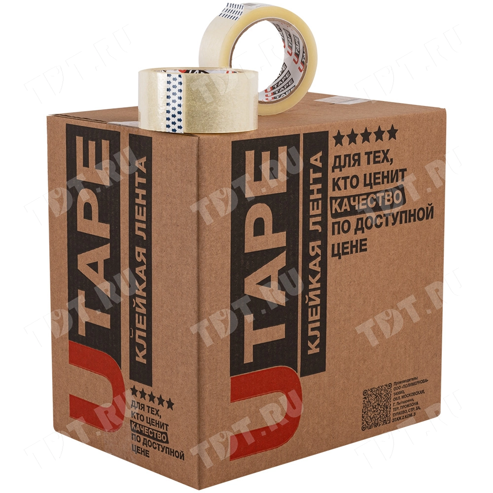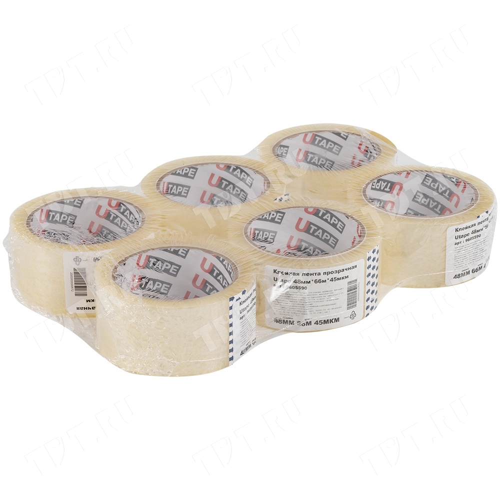Клейкая лента Utape прозрачная шириной 48 мм, диаметром втулки 76 мм, намоткой 66 метров, толщиной 45 мкм для ручной упаковки. Изготовлена на основе полипропилена. Производитель ООО «Полимернова».
